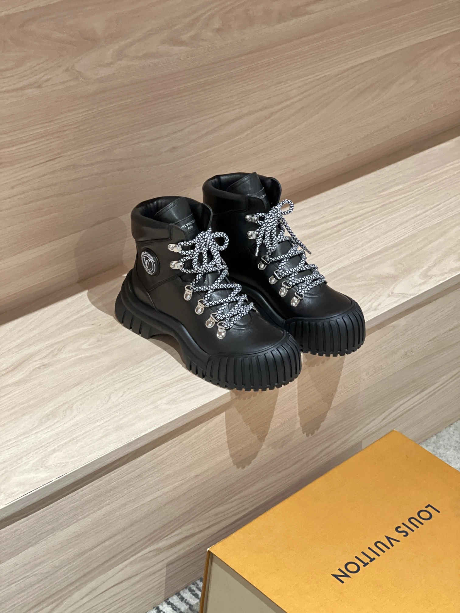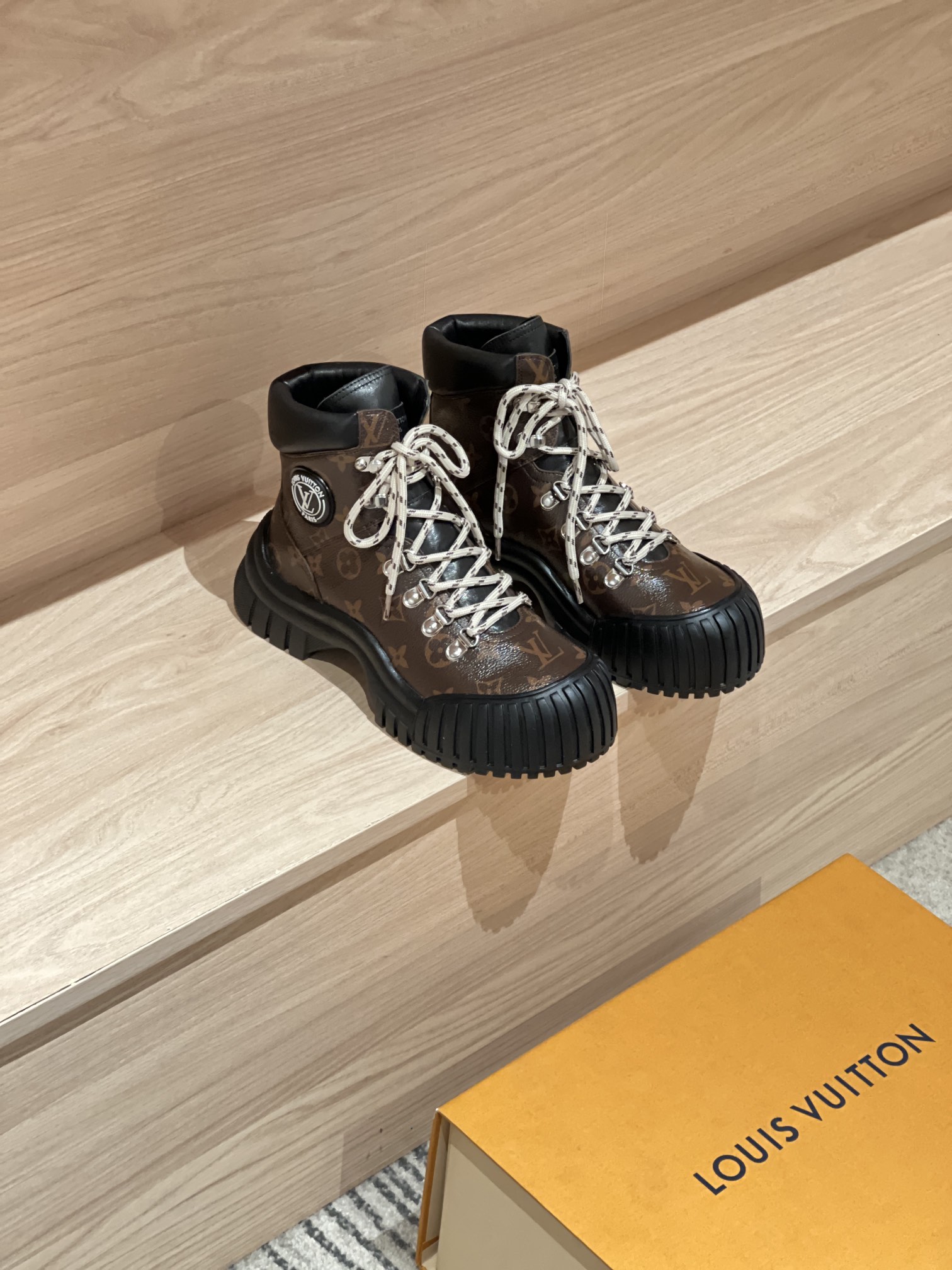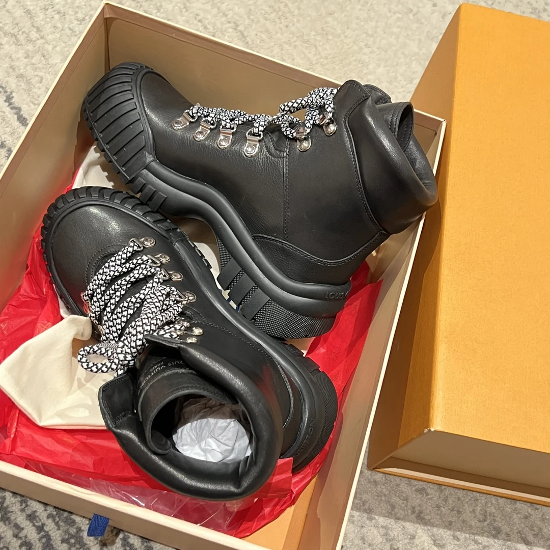 Стильные ботинки Louis Vuitton Ruby — это сочетание роскоши и современного дизайна. Модель выполнена из высококачественной кожи с культовым монограммным принтом LV. Особое внимание к деталям: массивная ребристая подошва из резины и удобная шнуровка на металлических петлях обеспечивают надежную фиксацию и комфорт при носке. Высокая посадка защищает в сезоны дождей и прохлады, подходит для города и активного отдыха.
