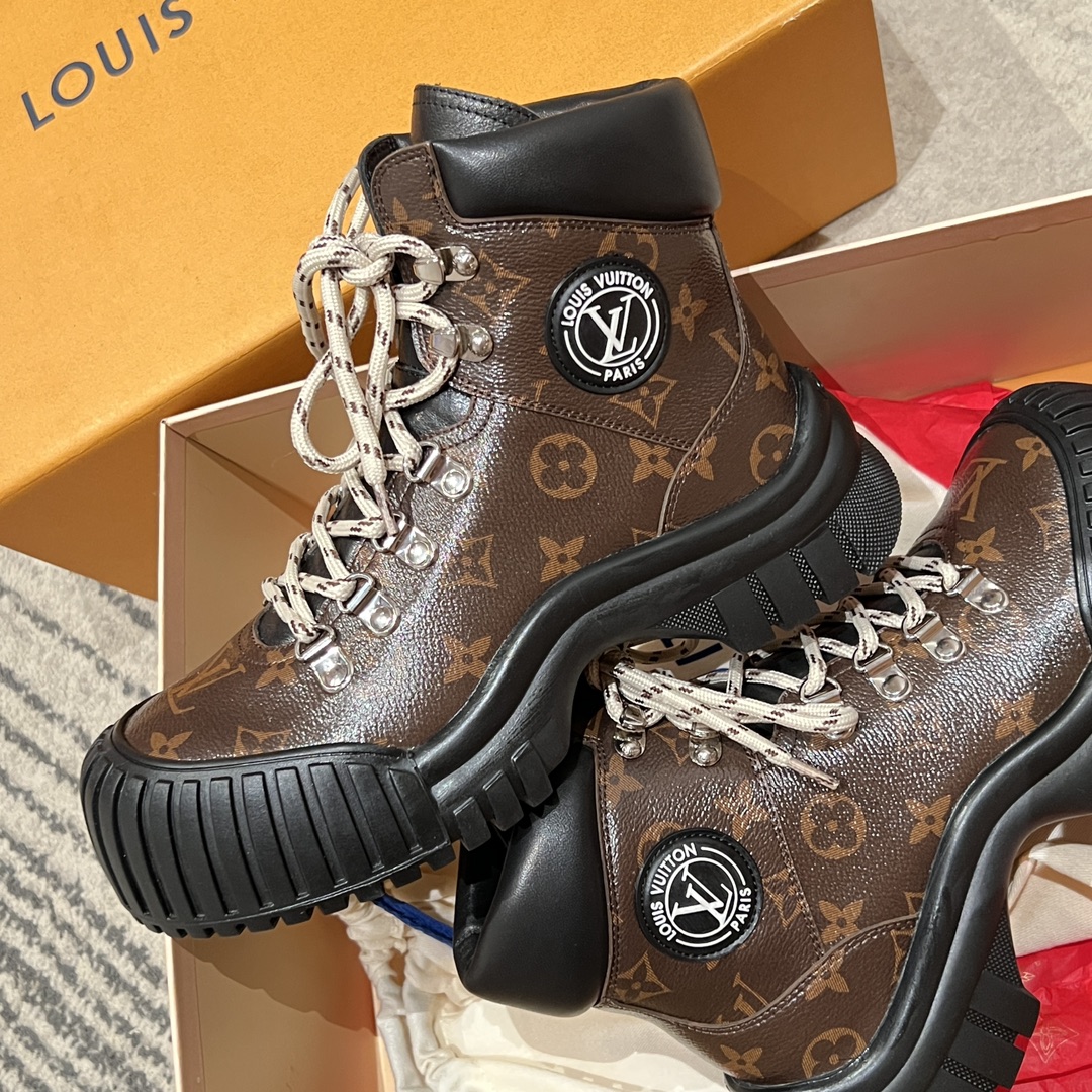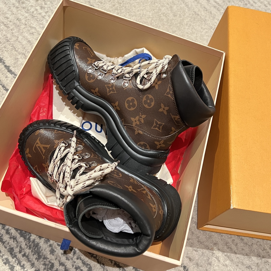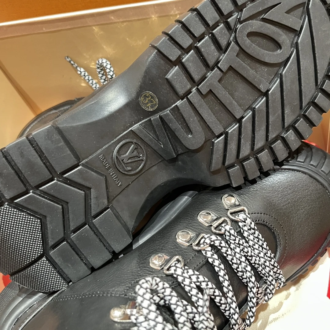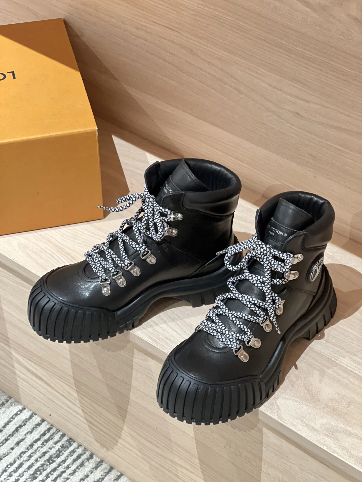 Стильные ботинки Louis Vuitton Ruby — это сочетание роскоши и современного дизайна. Модель выполнена из высококачественной кожи с культовым монограммным принтом LV. Особое внимание к деталям: массивная ребристая подошва из резины и удобная шнуровка на металлических петлях обеспечивают надежную фиксацию и комфорт при носке. Высокая посадка защищает в сезоны дождей и прохлады, подходит для города и активного отдыха.
