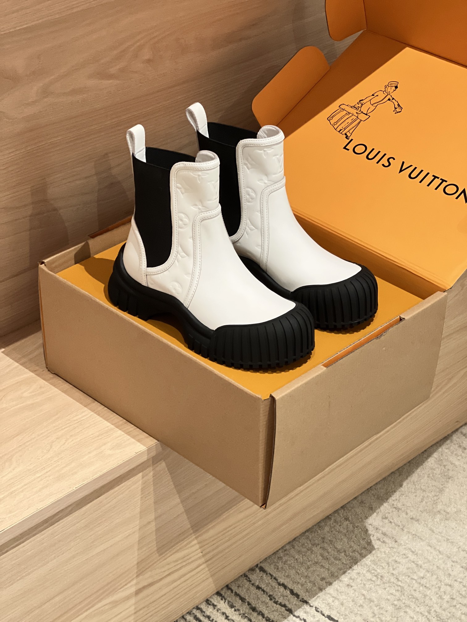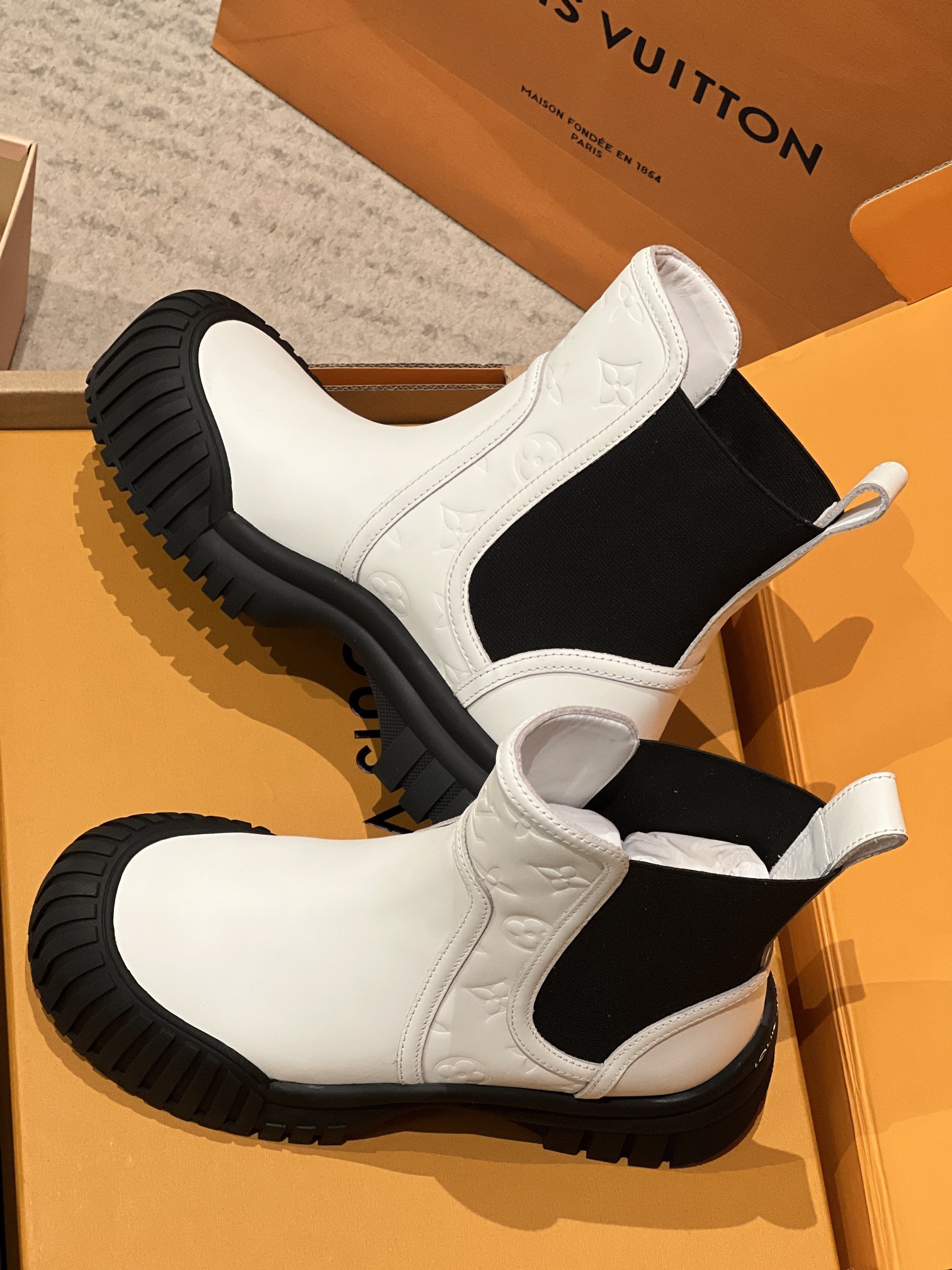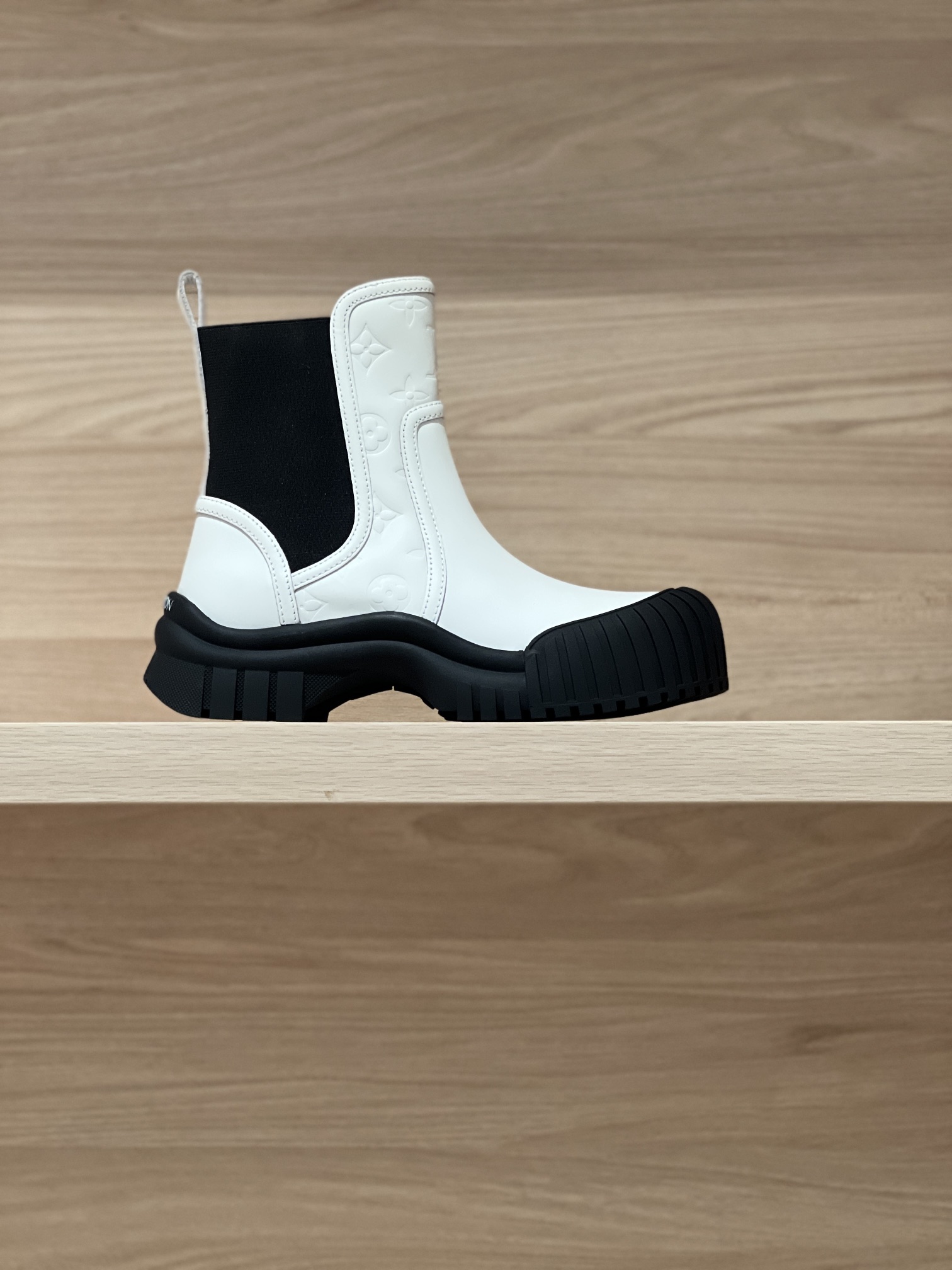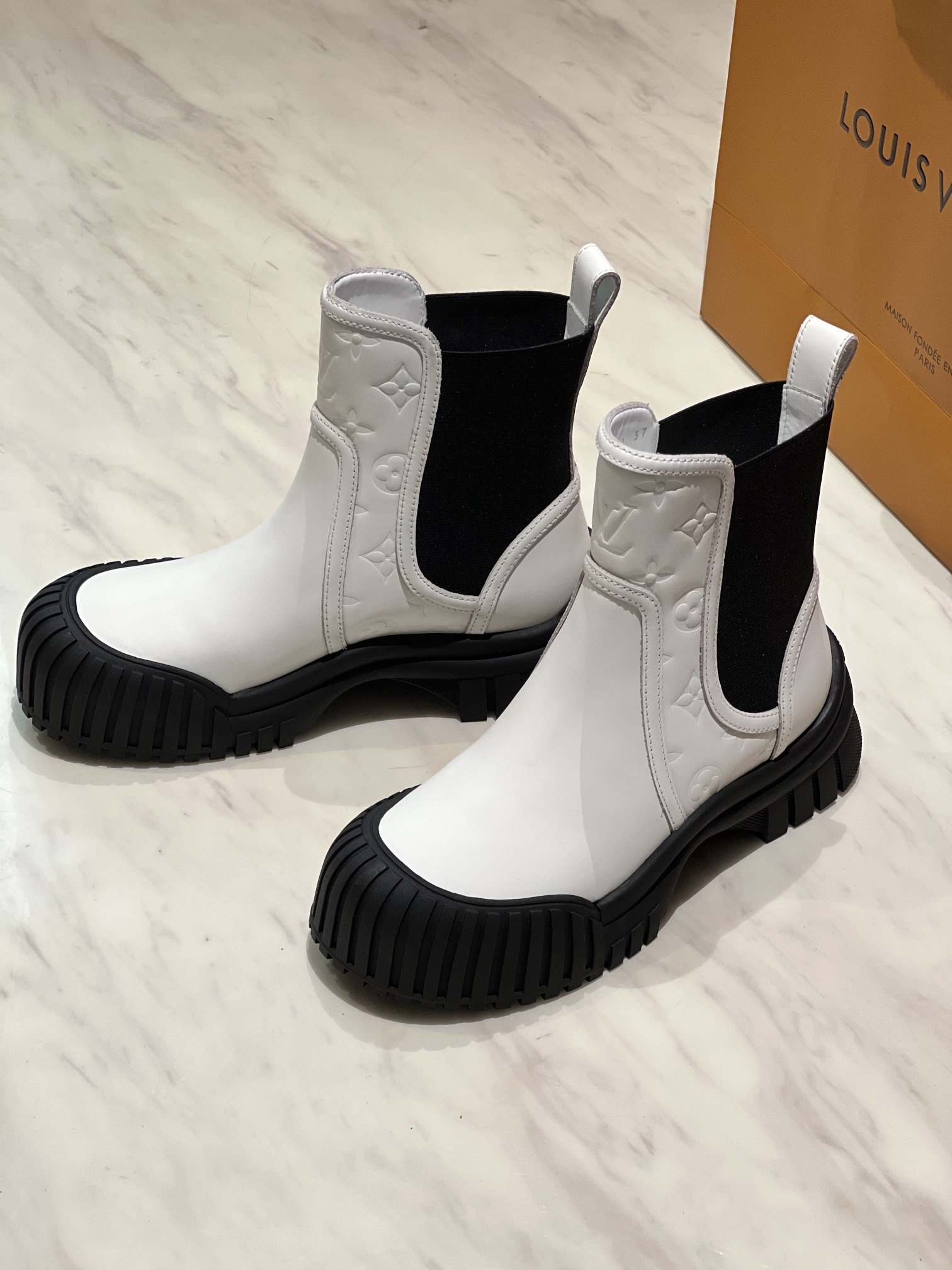 Стильные и современные ботинки Louis Vuitton Ruby — идеальный выбор для создания яркого образа в любое время года. Модель выполнена из натуральной кожи, украшенной тиснением фирменного монограмного узора Louis Vuitton. Контрастная черная эластичная вставка по бокам гарантирует комфортную посадку и легкость надевания.