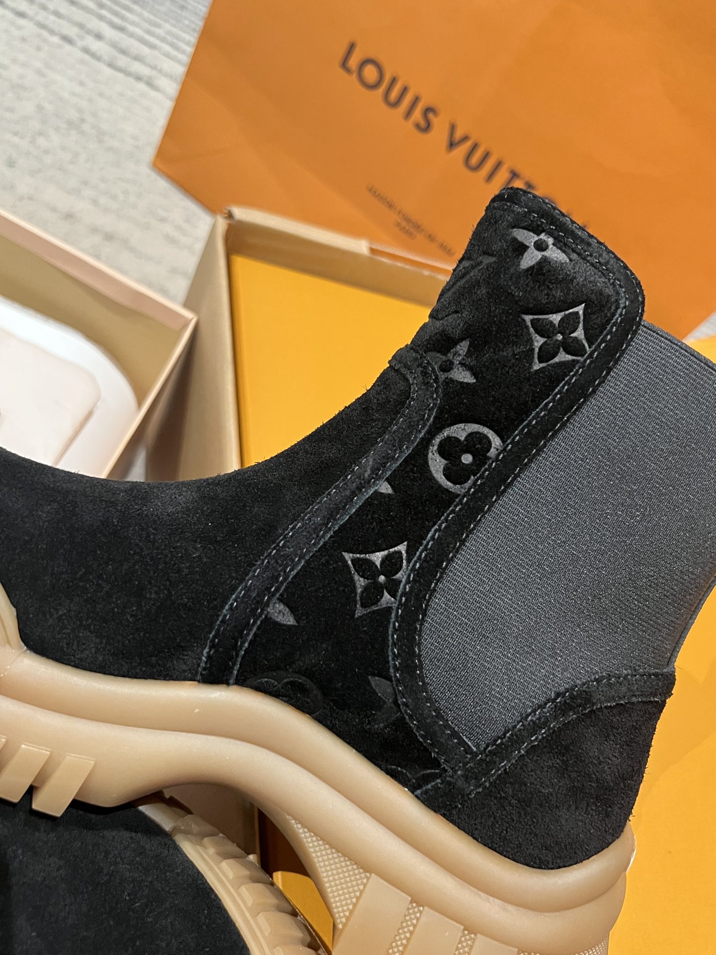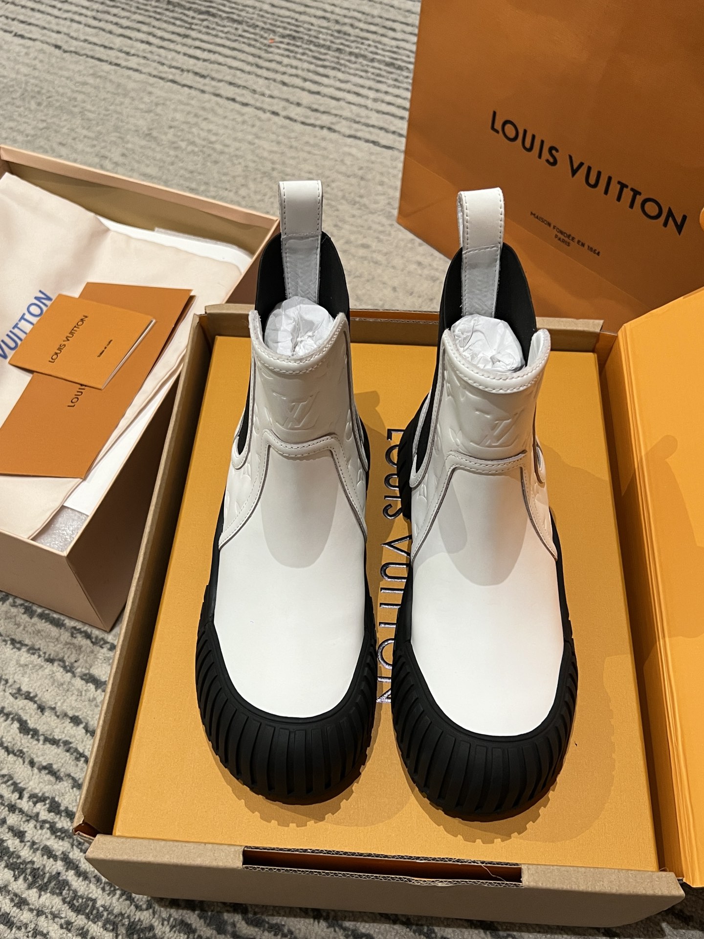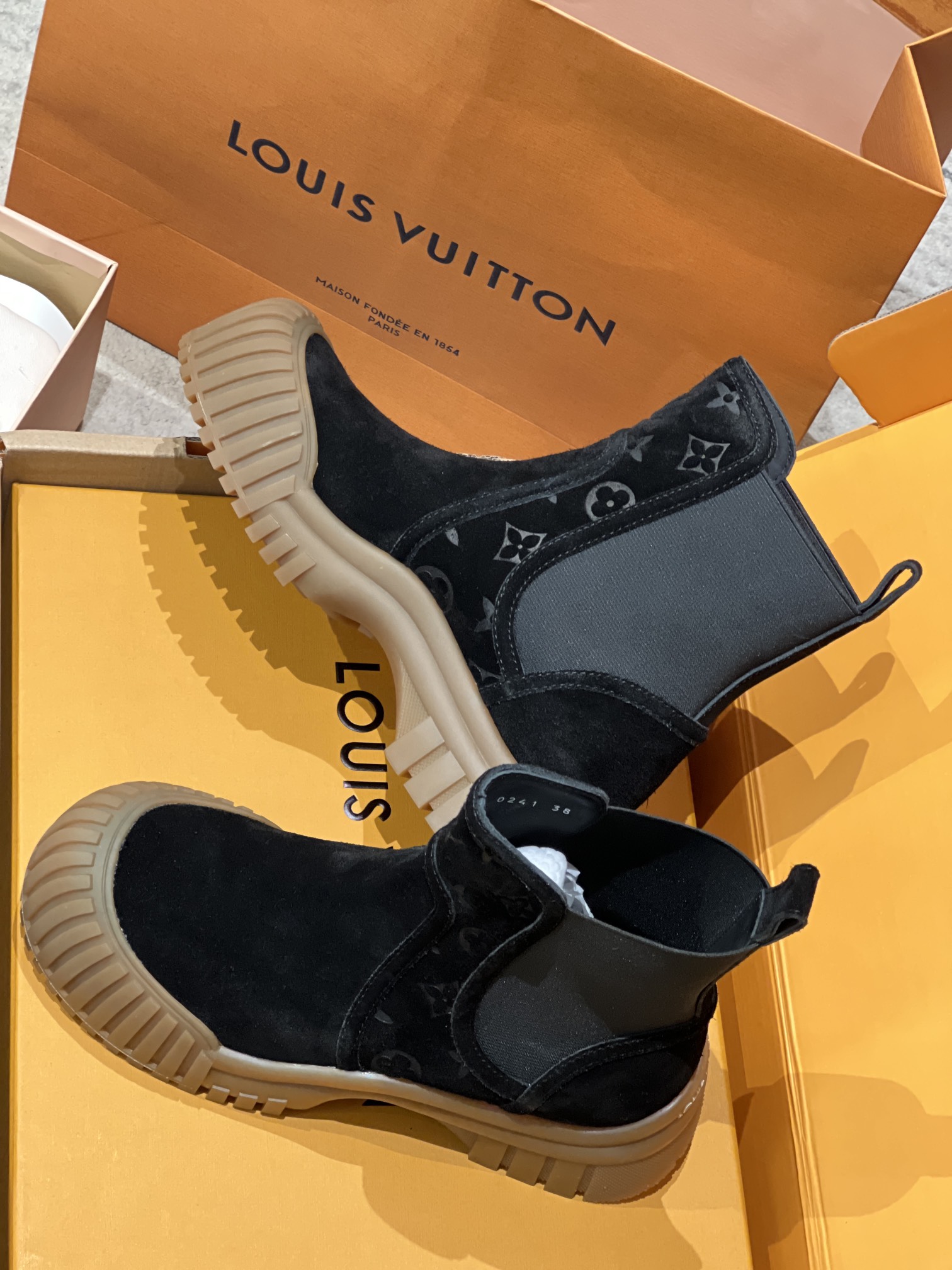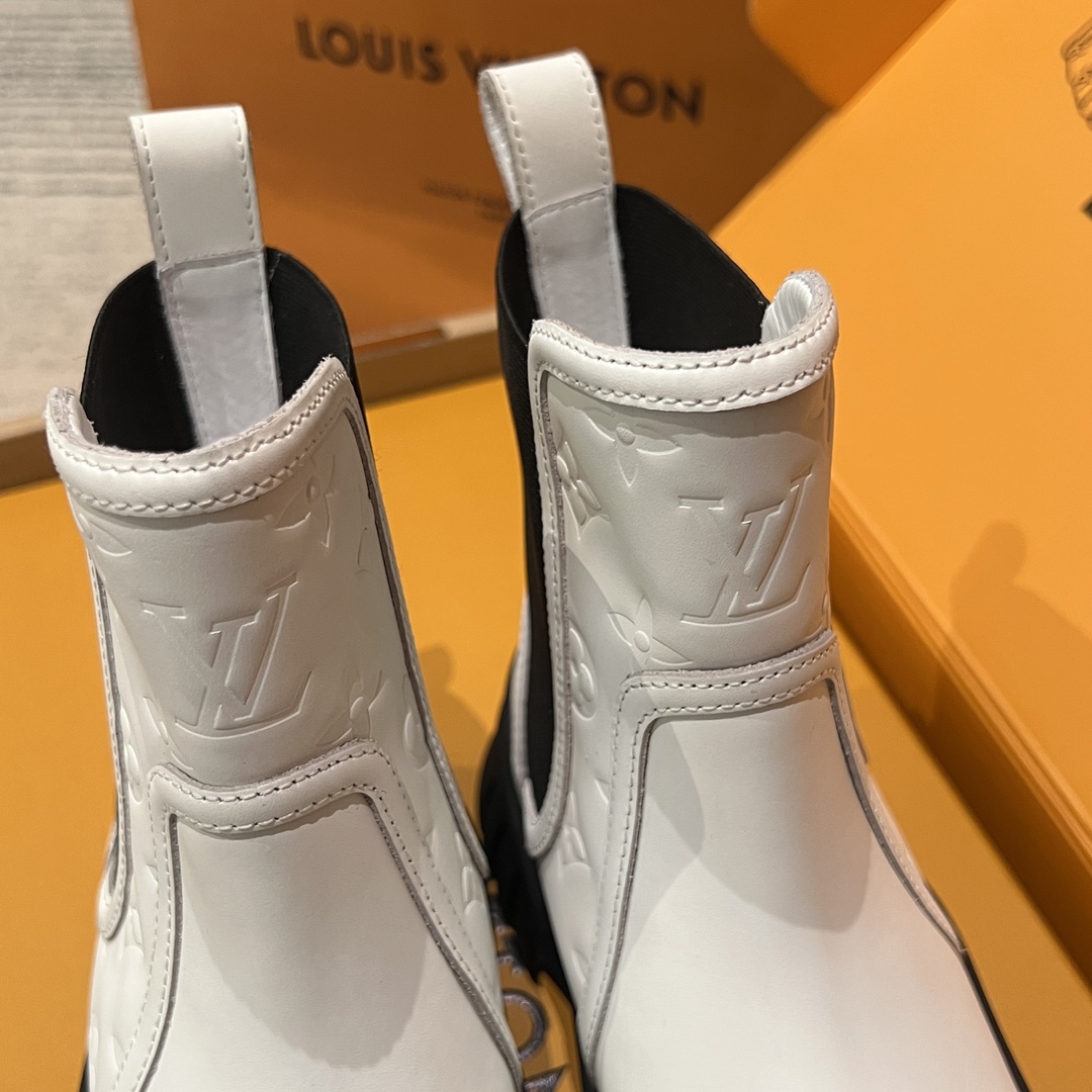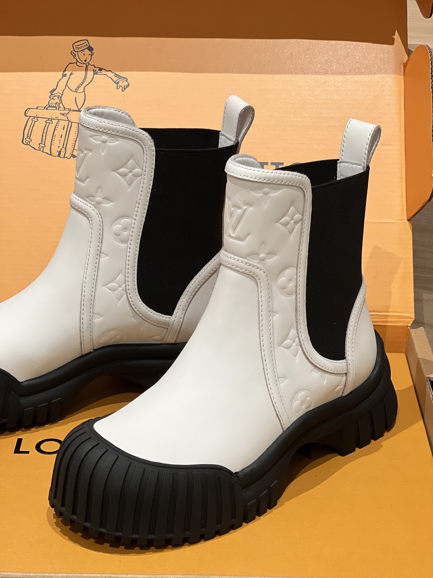 Стильные и современные ботинки Louis Vuitton Ruby — идеальный выбор для создания яркого образа в любое время года. Модель выполнена из натуральной кожи, украшенной тиснением фирменного монограмного узора Louis Vuitton. Контрастная черная эластичная вставка по бокам гарантирует комфортную посадку и легкость надевания.
