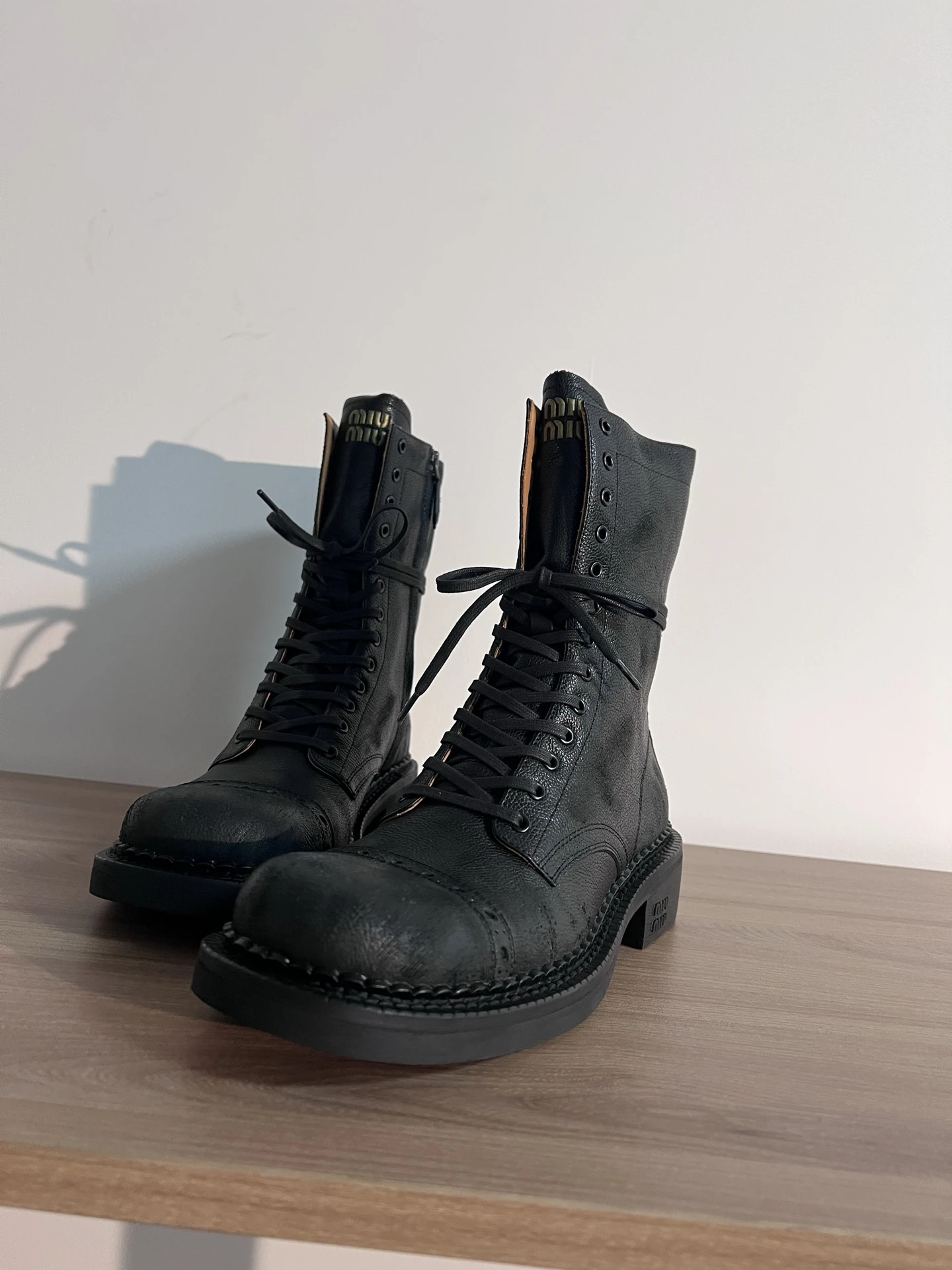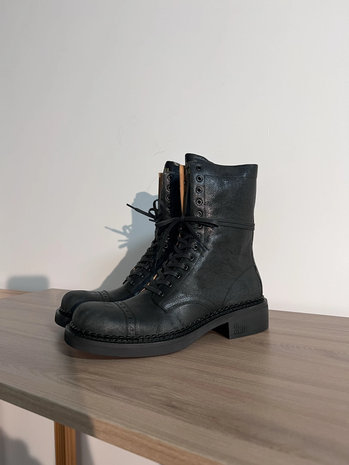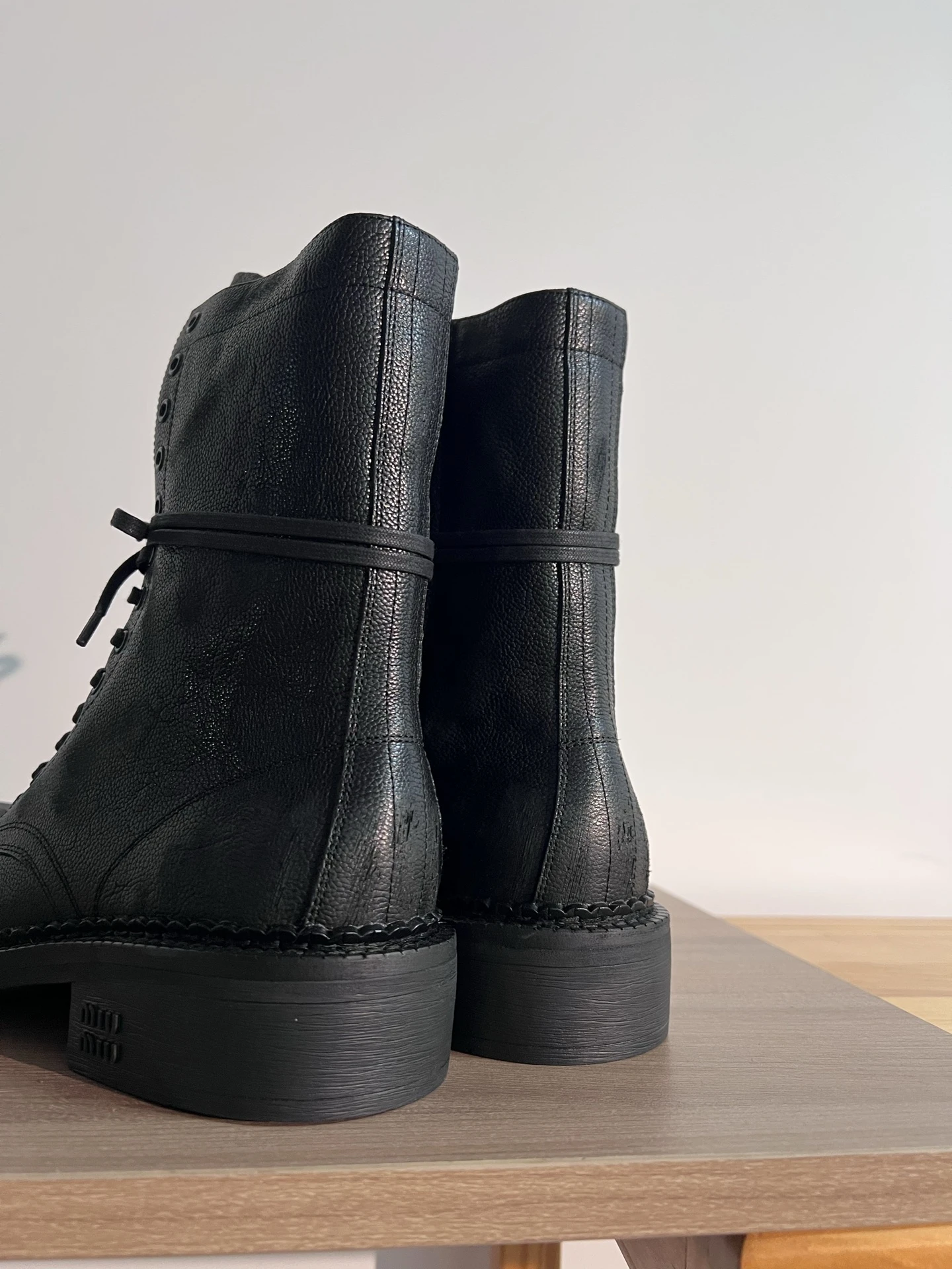 Ботинки MIU MIU из высококачественной телячьей кожи — идеальный выбор для городской жизни и стильных образов. Модель выполнена в глубоких черных тонах и отличается прочной гладкой поверхностью, что подчеркивает респектабельный и минималистичный дизайн. Высокий силуэт с анатомичной формой обеспечивает плотную фиксацию и комфортную поддержку голени и щиколотки. Шнуровка с металлическими люверсами и массивная, рифленая подошва придают обуви особый характер и долговечность. Укрепленный мыс и прочная прострочка по периметру гарантируют надежность и устойчивость к ежедневному ношению.