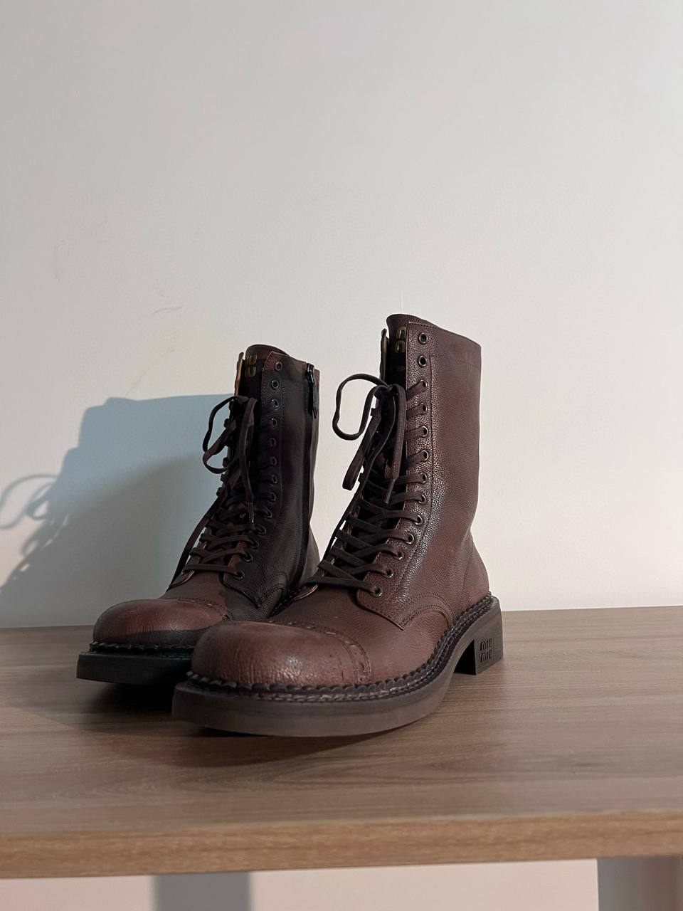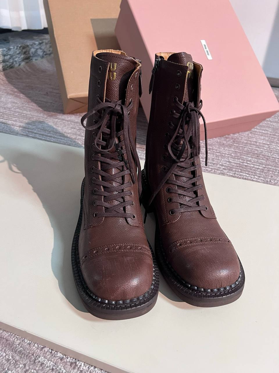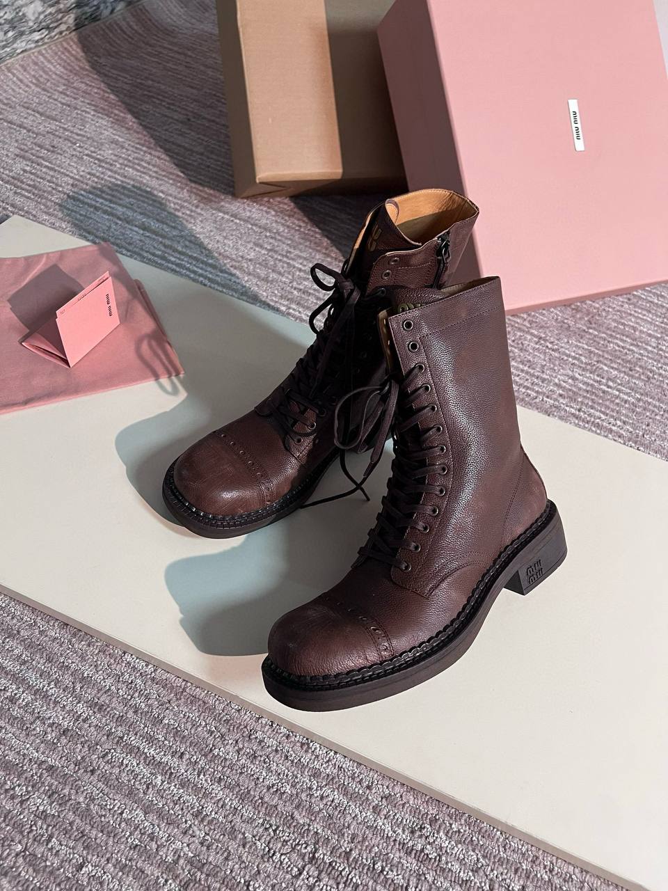 Ботинки MIU MIU из высококачественной телячьей кожи — идеальный выбор для городской жизни и стильных образов. Модель выполнена в глубоких черных тонах и отличается прочной гладкой поверхностью, что подчеркивает респектабельный и минималистичный дизайн. Высокий силуэт с анатомичной формой обеспечивает плотную фиксацию и комфортную поддержку голени и щиколотки. Шнуровка с металлическими люверсами и массивная, рифленая подошва придают обуви особый характер и долговечность. Укрепленный мыс и прочная прострочка по периметру гарантируют надежность и устойчивость к ежедневному ношению.