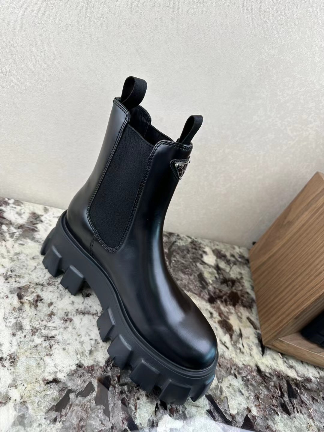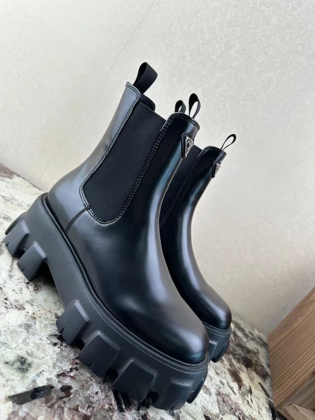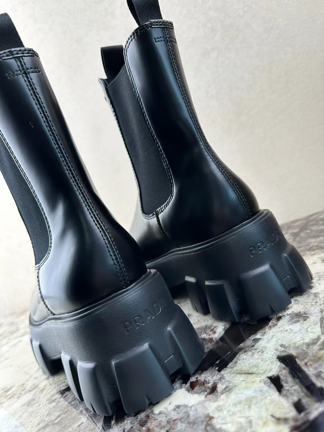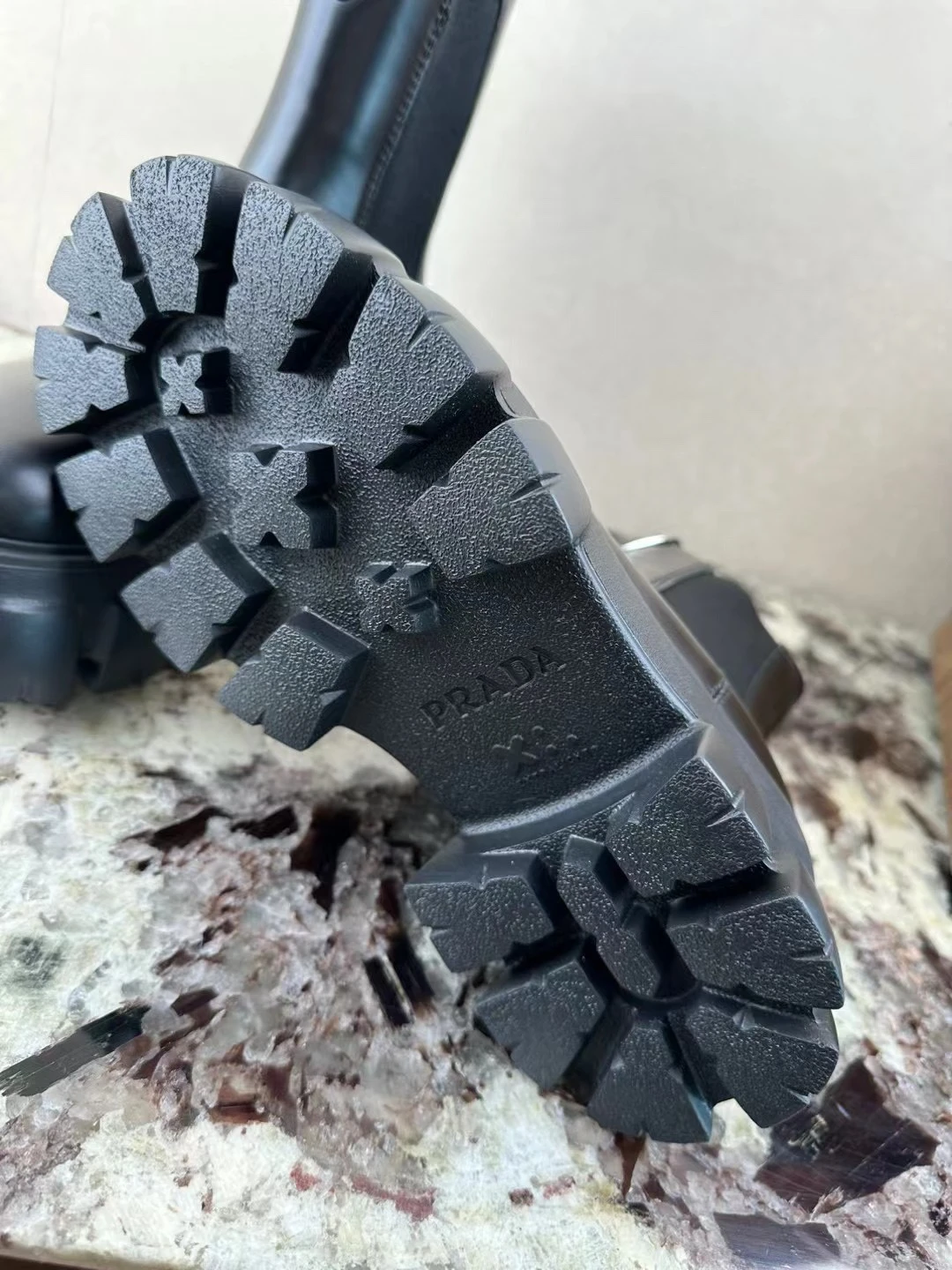 Стильные женские ботинки Prada, выполненные из натуральной кожи, идеально дополнят ваш повседневный и вечерний образ. Модель в актуальном дизайне с массивной тракторной подошвой обеспечивает комфорт при ходьбе и отличное сцепление с поверхностью. Эластичные вставки по бокам позволяют легко надевать и снимать обувь, а фирменный логотип Prada подчеркивает ваш утонченный стиль. Эти ботинки станут визитной карточкой вашего гардероба, сочетая в себе итальянское качество, практичность и современную эстетику.
