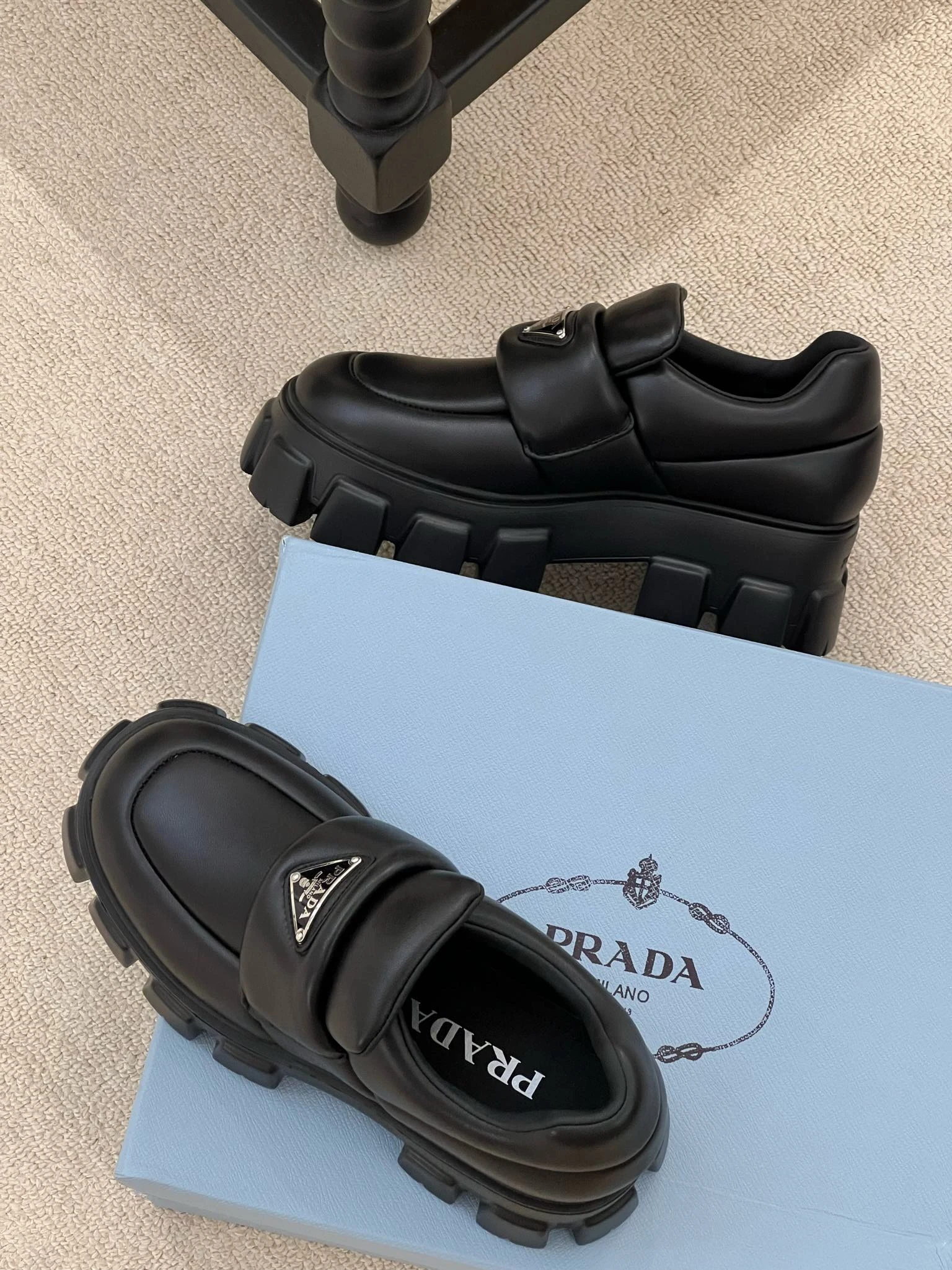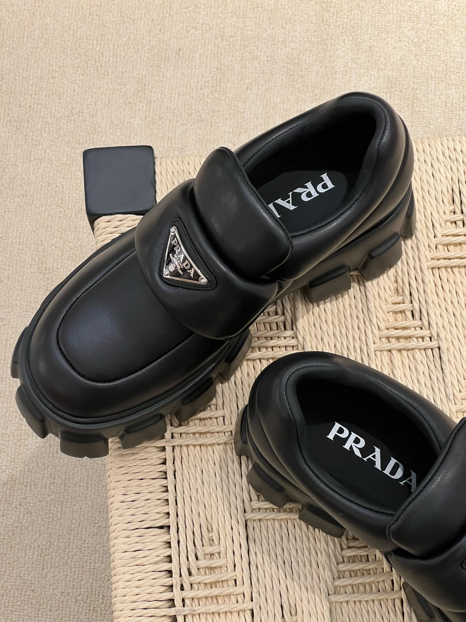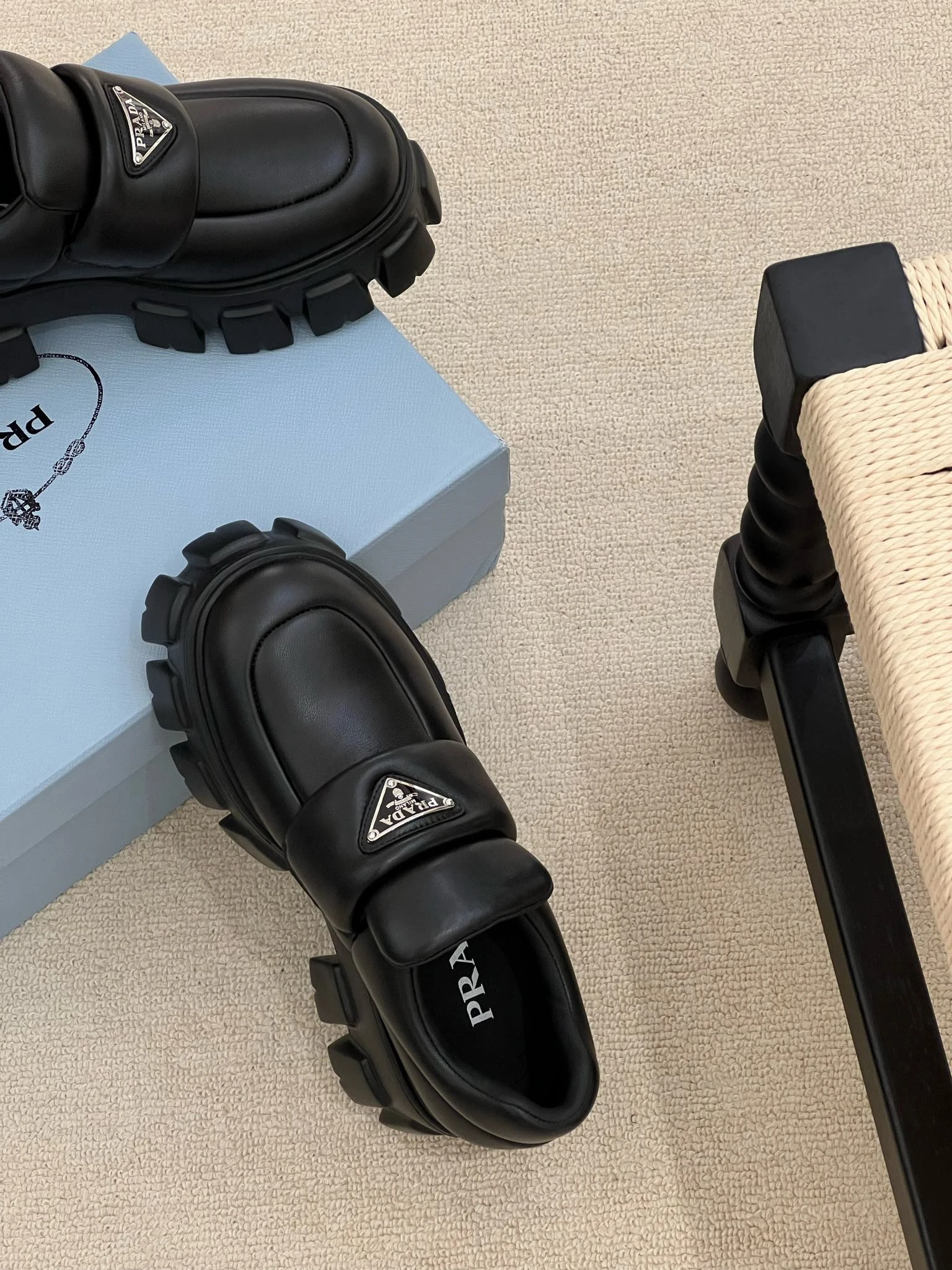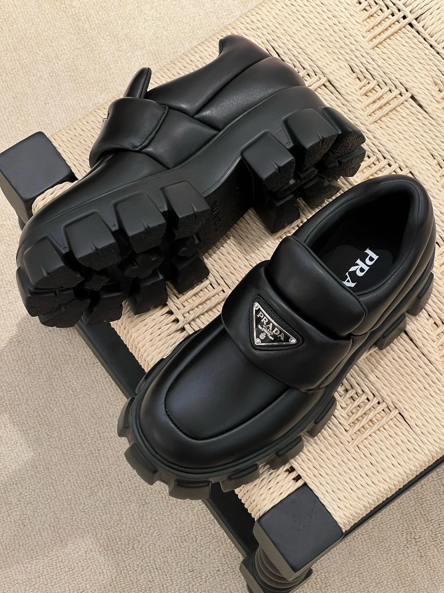 Эти стильные ботинки от Prada — идеальное сочетание роскоши, комфорта и современного дизайна. Модель выполнена из натуральной кожи в классическом черном цвете, который легко впишется в любой гардероб. Объемная, массивная подошва придает обуви модный акцент и обеспечивает отличное сцепление и устойчивость. Декорированы фирменным металлическим логотипом Prada на верхней части, что подчеркивает премиальность изделия. Внутренняя отделка гарантирует комфорт даже при длительной носке.