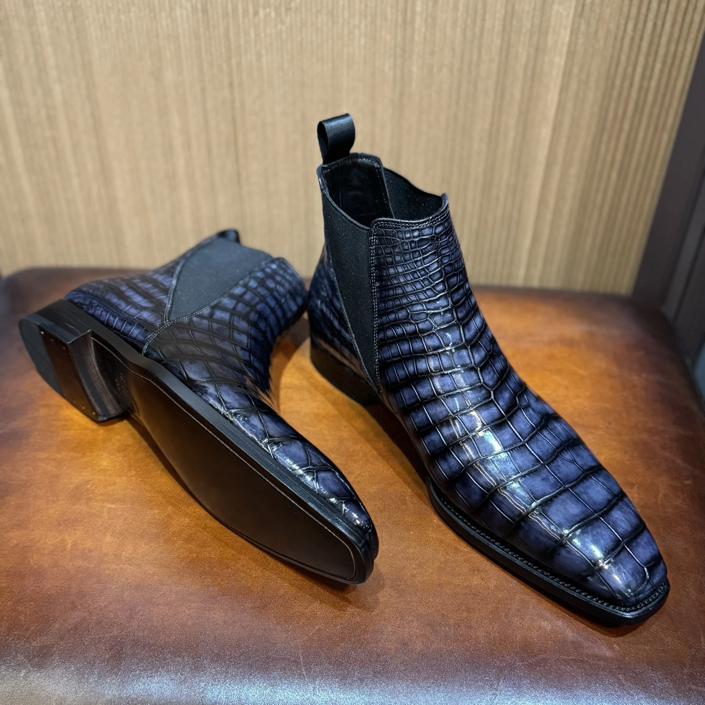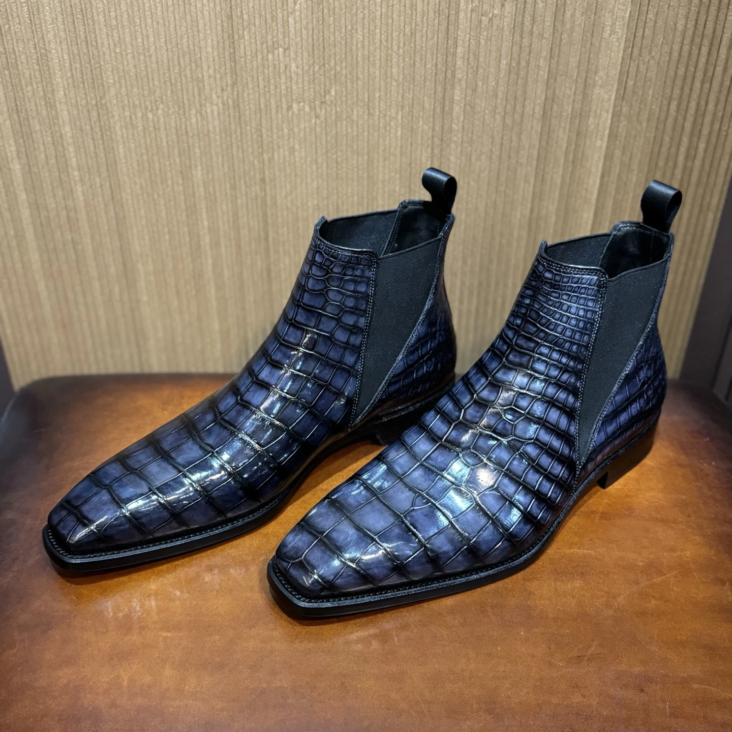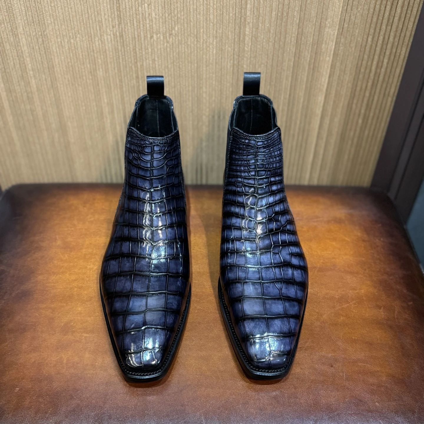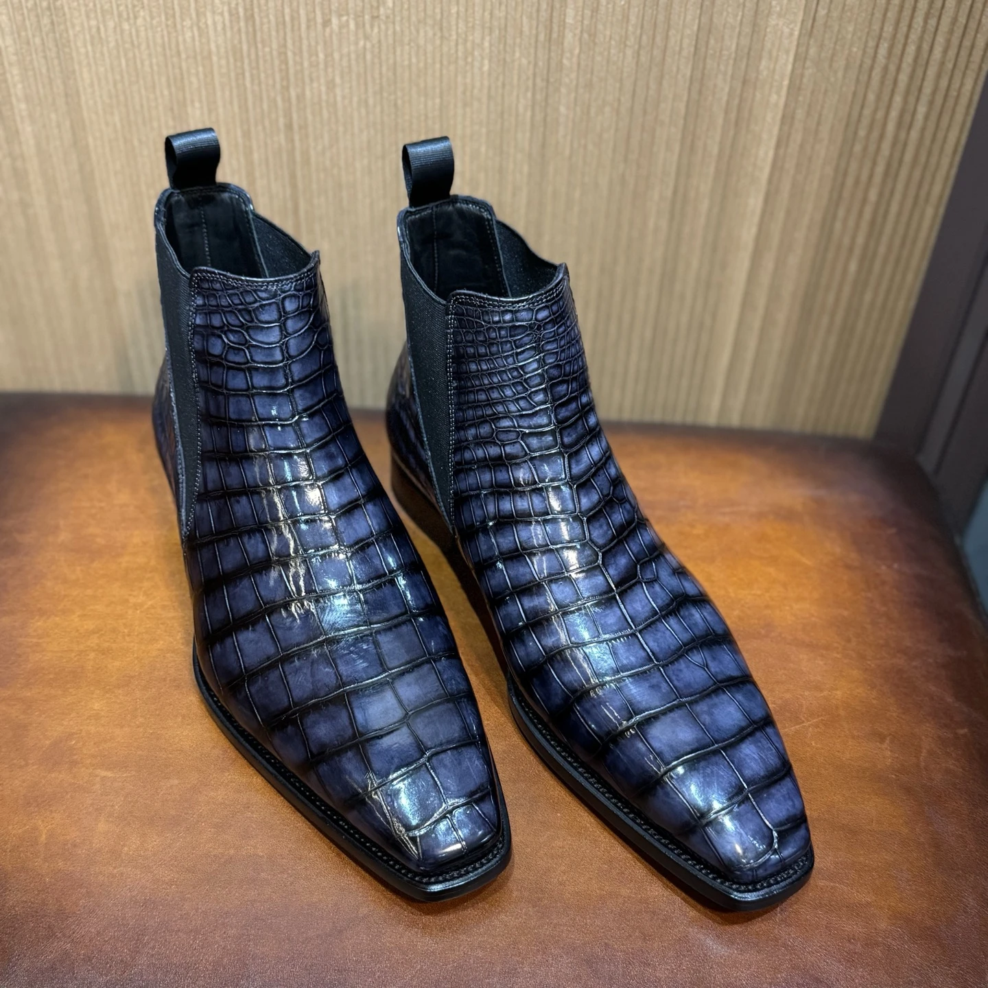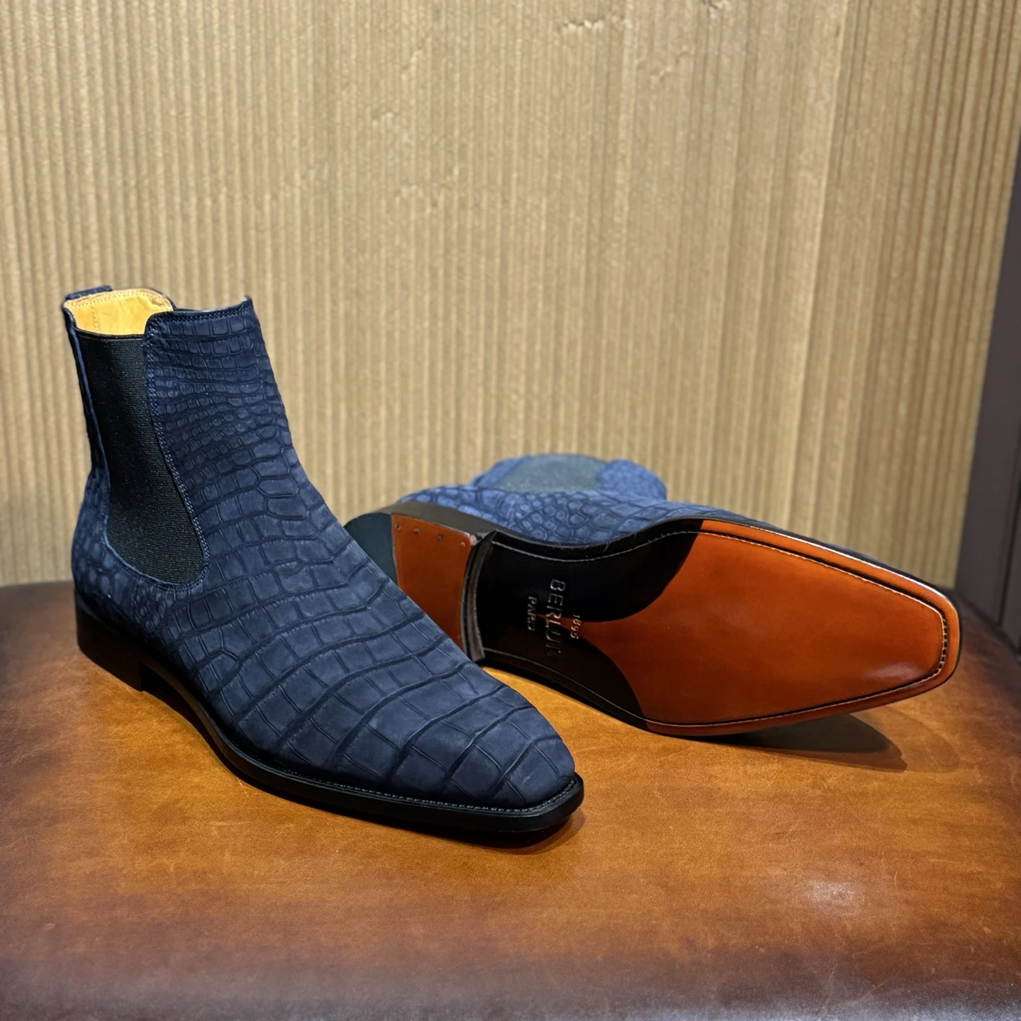 Мужские ботинки Berluti из крокодиловой кожи — это воплощение роскоши и элегантности. Эксклюзивная модель выполнена из высококачественной кожи крокодила насыщенного темно-синего оттенка с характерным рельефным узором. Эластичные вставки по бокам обеспечивают комфортную посадку и легкость при обувании, а классический силуэт Chelsea придаёт образу утонченность. Изысканная ручная отделка, фирменная форма носка и безупречно выполненные швы подчёркивают статус и индивидуальность владельца. Такие ботинки станут не только стильным акцентом в гардеробе, но и показателем безупречного вкуса и стремления к исключительному качеству.