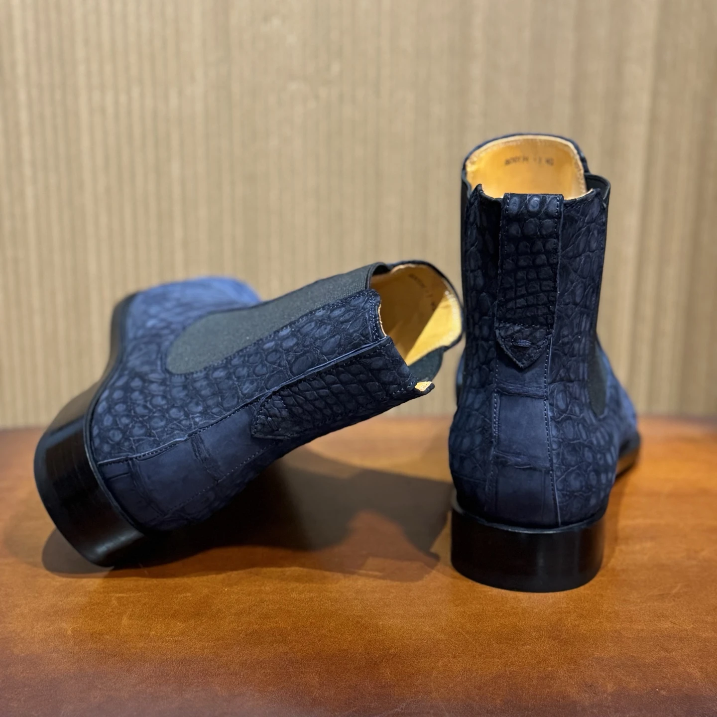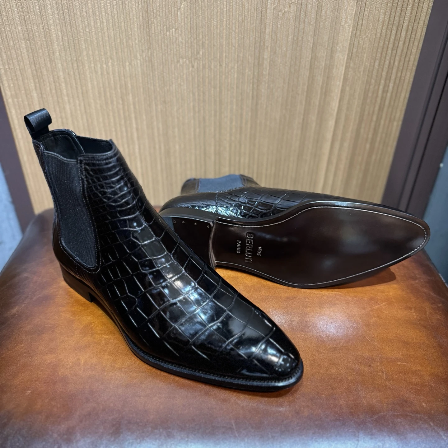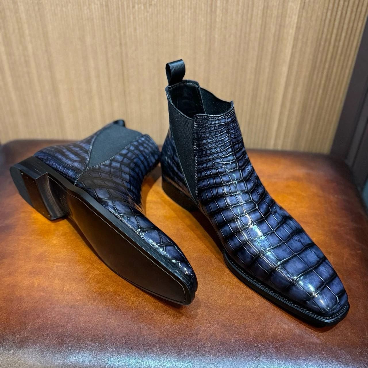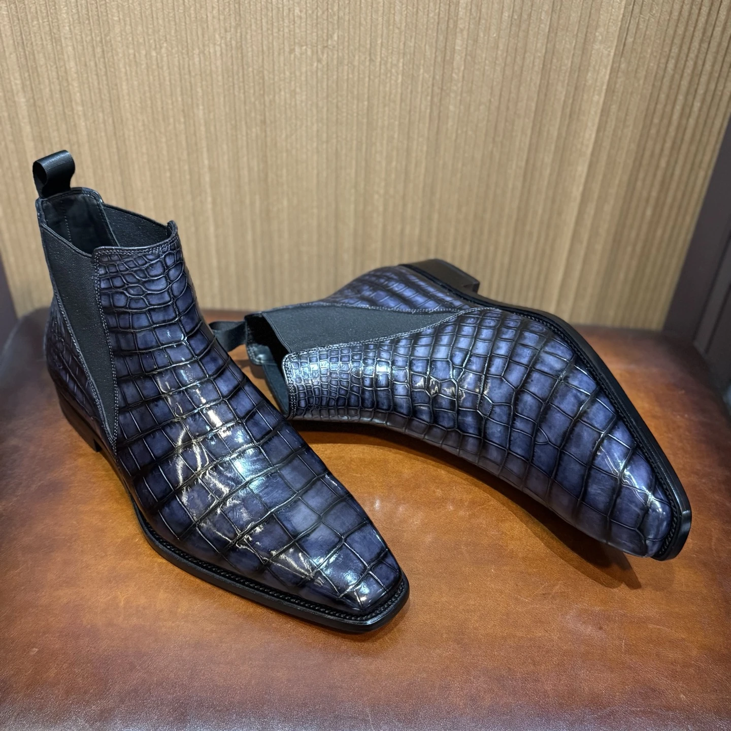 Мужские ботинки Berluti из крокодиловой кожи — это воплощение роскоши и элегантности. Эксклюзивная модель выполнена из высококачественной кожи крокодила насыщенного темно-синего оттенка с характерным рельефным узором. Эластичные вставки по бокам обеспечивают комфортную посадку и легкость при обувании, а классический силуэт Chelsea придаёт образу утонченность. Изысканная ручная отделка, фирменная форма носка и безупречно выполненные швы подчёркивают статус и индивидуальность владельца. Такие ботинки станут не только стильным акцентом в гардеробе, но и показателем безупречного вкуса и стремления к исключительному качеству.