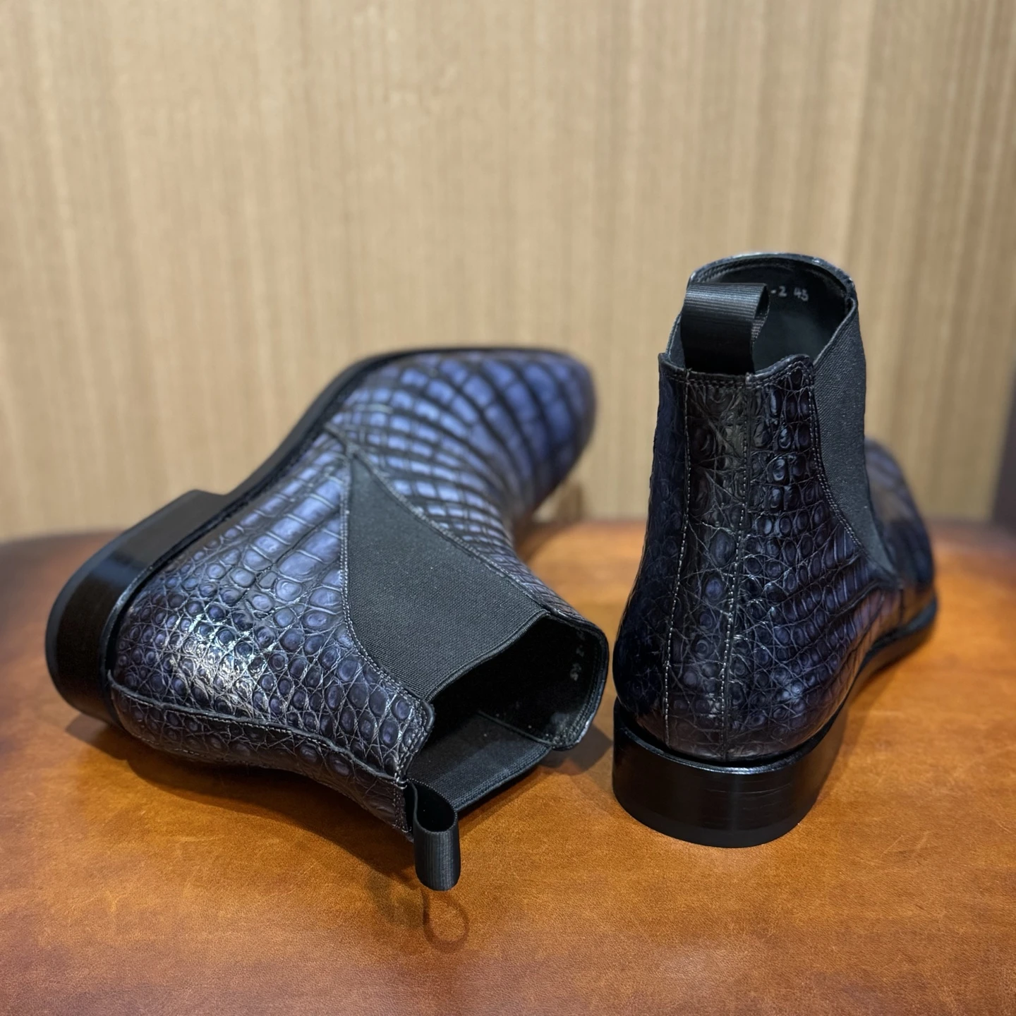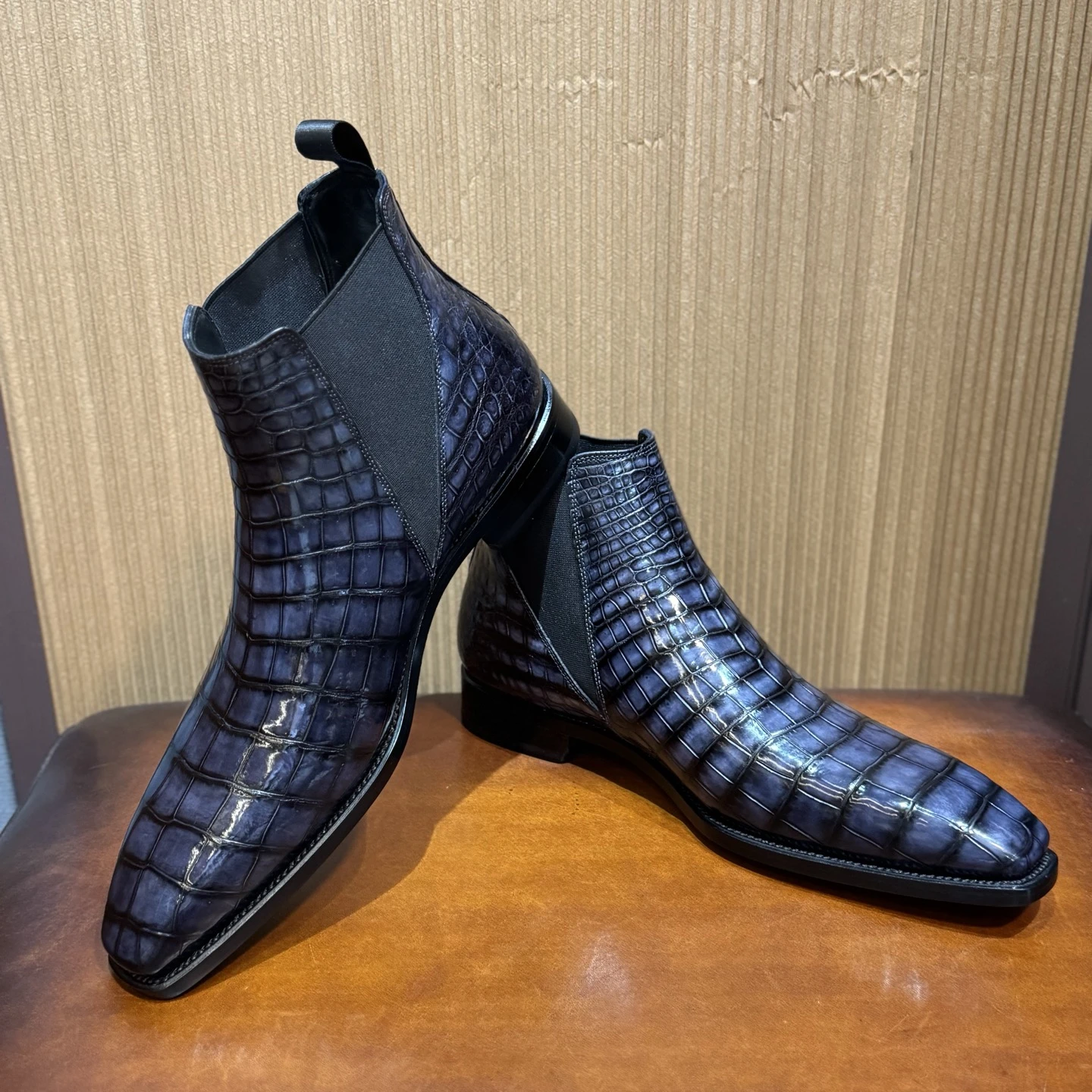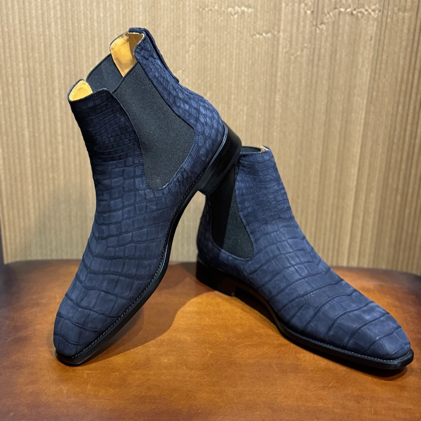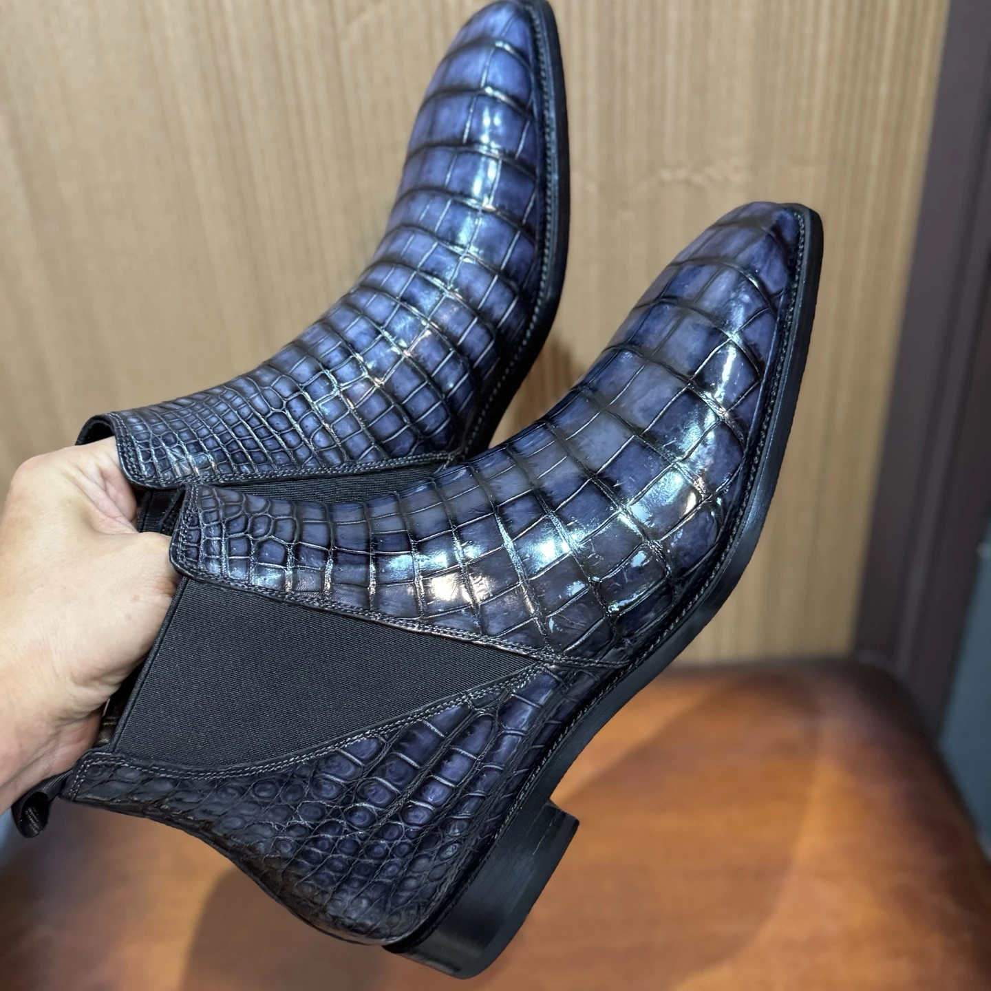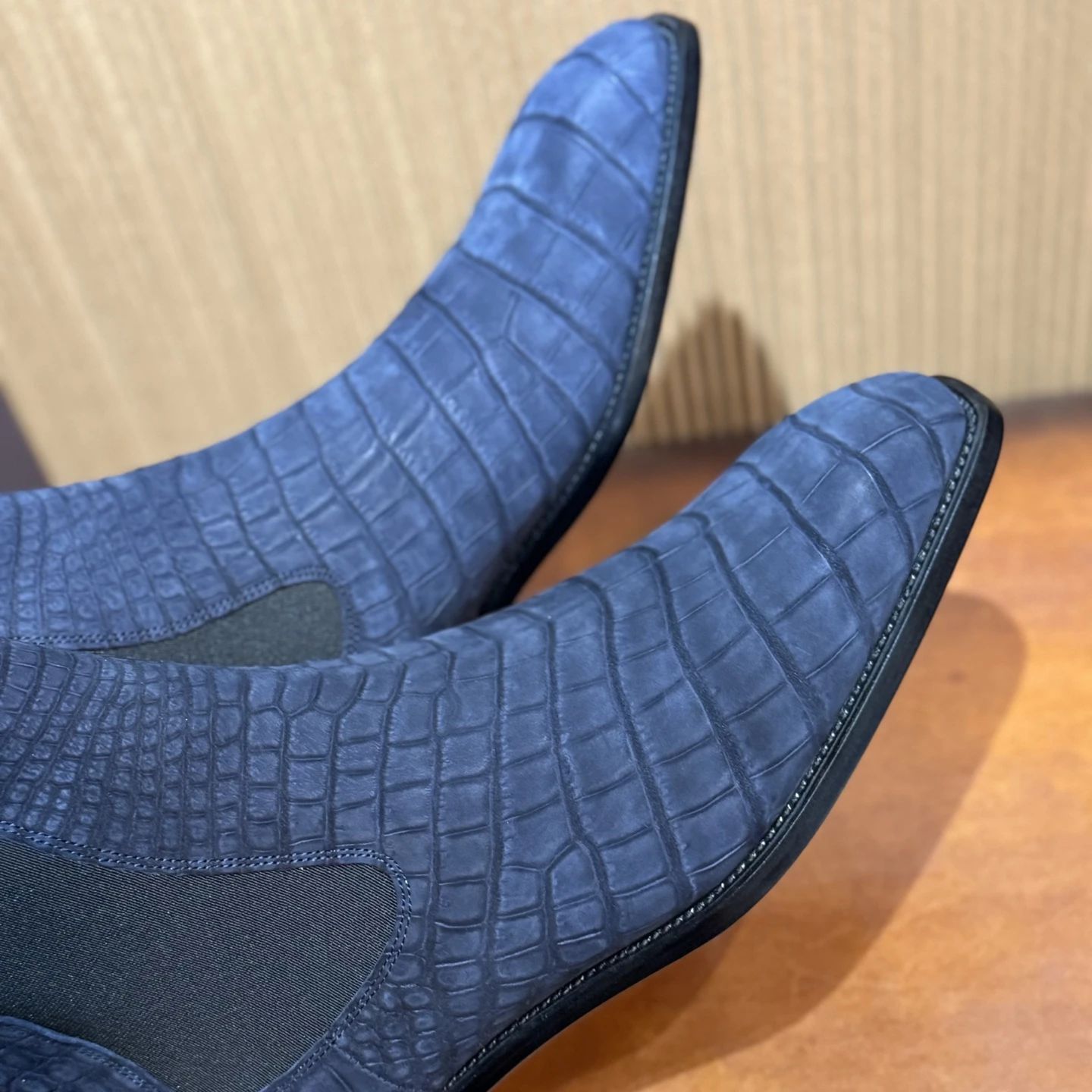 Мужские ботинки Berluti из крокодиловой кожи — это воплощение роскоши и элегантности. Эксклюзивная модель выполнена из высококачественной кожи крокодила насыщенного темно-синего оттенка с характерным рельефным узором. Эластичные вставки по бокам обеспечивают комфортную посадку и легкость при обувании, а классический силуэт Chelsea придаёт образу утонченность. Изысканная ручная отделка, фирменная форма носка и безупречно выполненные швы подчёркивают статус и индивидуальность владельца. Такие ботинки станут не только стильным акцентом в гардеробе, но и показателем безупречного вкуса и стремления к исключительному качеству.