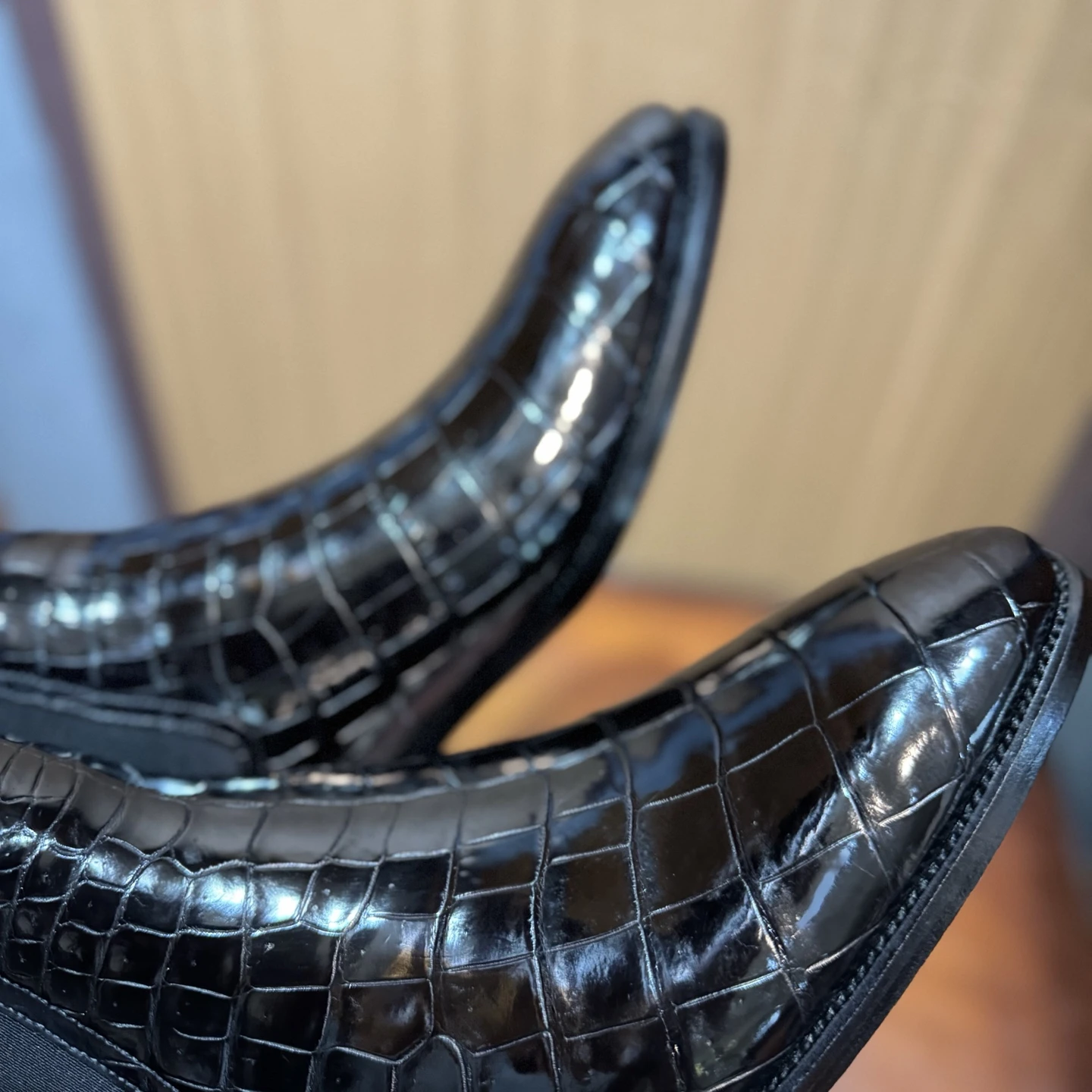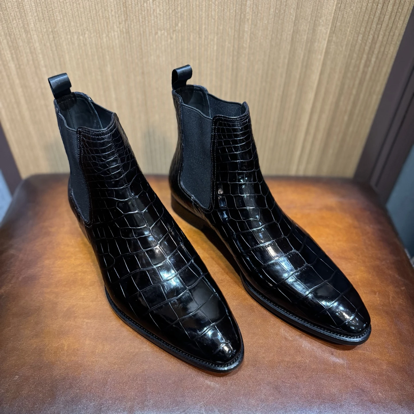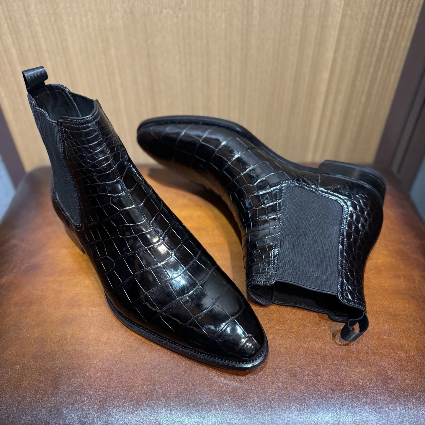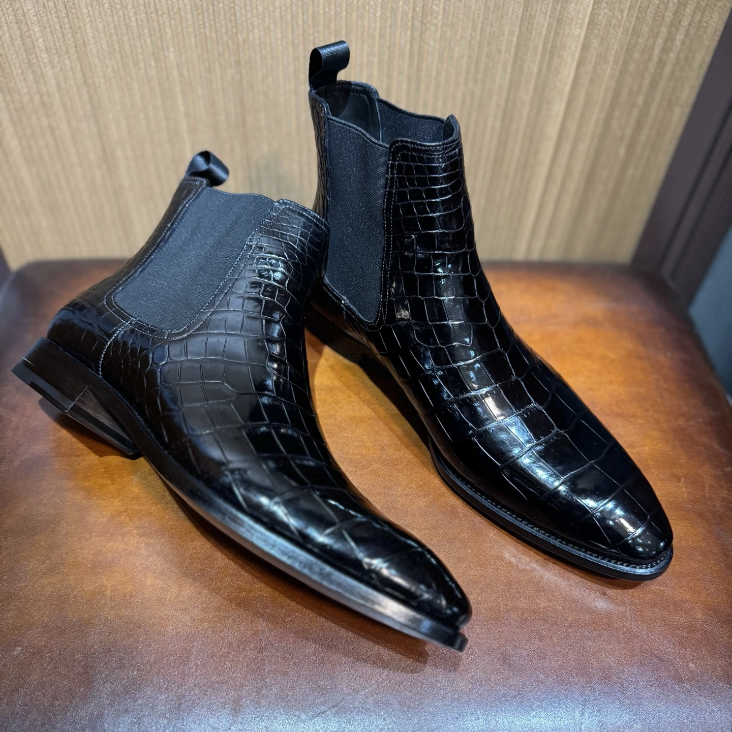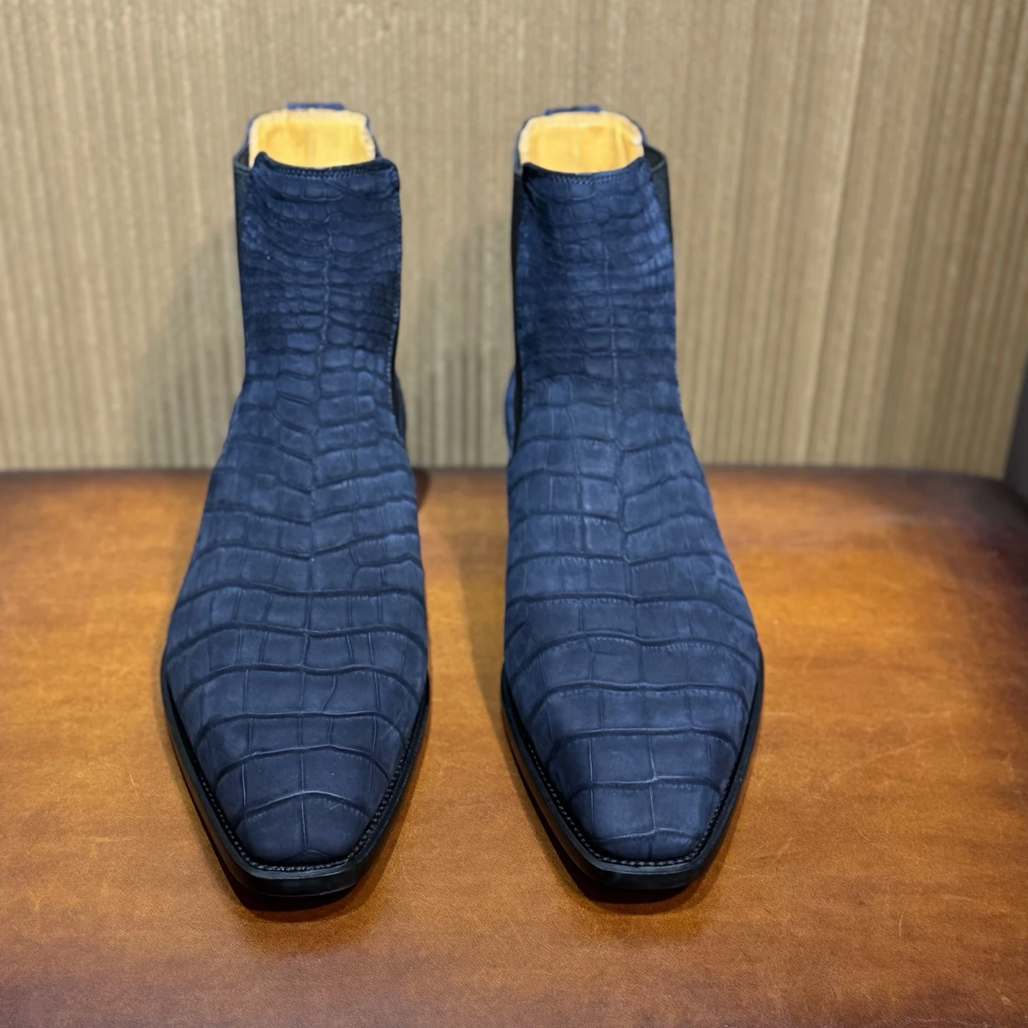 Мужские ботинки Berluti из крокодиловой кожи — это воплощение роскоши и элегантности. Эксклюзивная модель выполнена из высококачественной кожи крокодила насыщенного темно-синего оттенка с характерным рельефным узором. Эластичные вставки по бокам обеспечивают комфортную посадку и легкость при обувании, а классический силуэт Chelsea придаёт образу утонченность. Изысканная ручная отделка, фирменная форма носка и безупречно выполненные швы подчёркивают статус и индивидуальность владельца. Такие ботинки станут не только стильным акцентом в гардеробе, но и показателем безупречного вкуса и стремления к исключительному качеству.