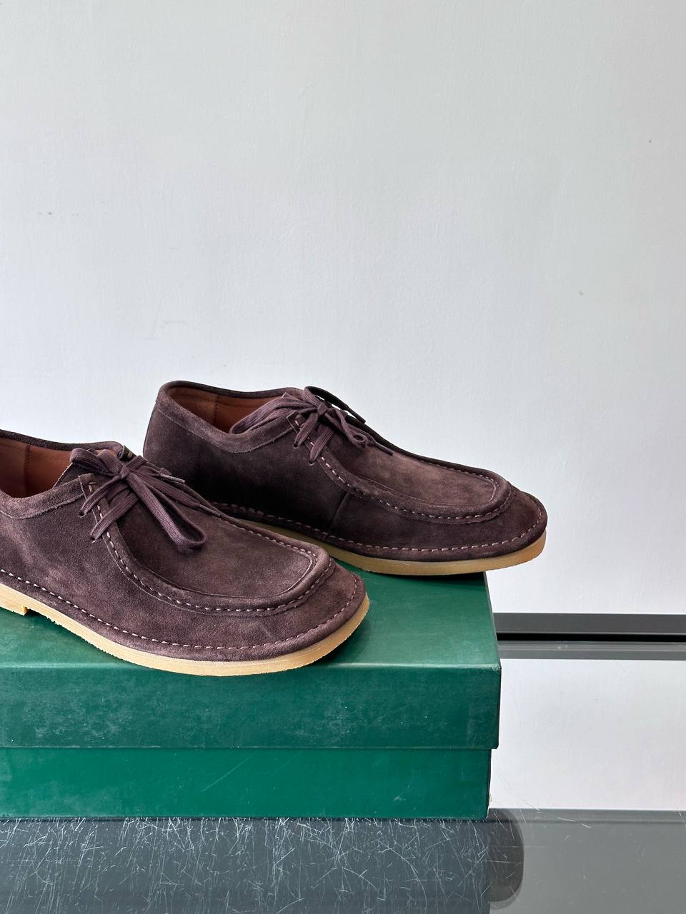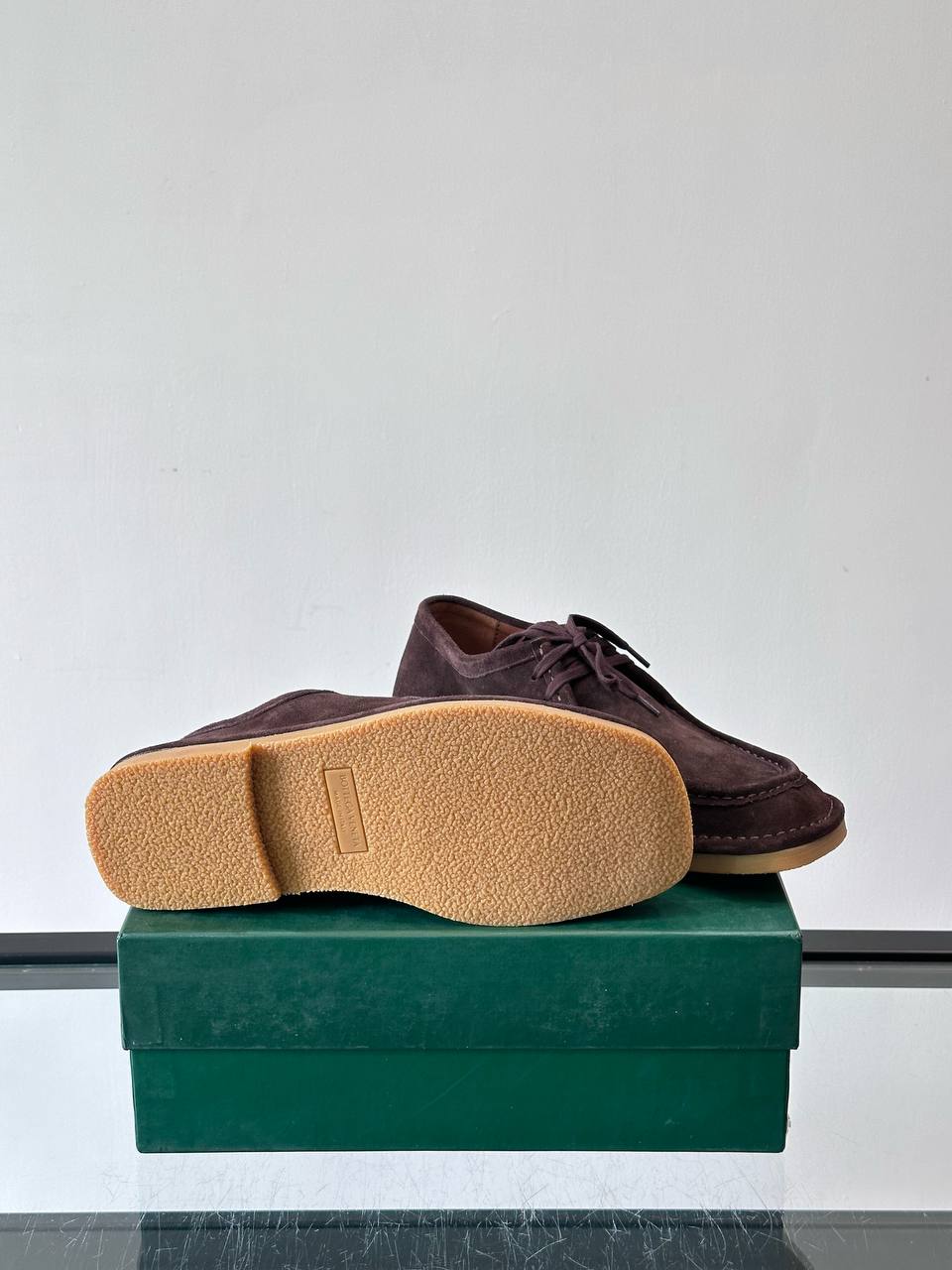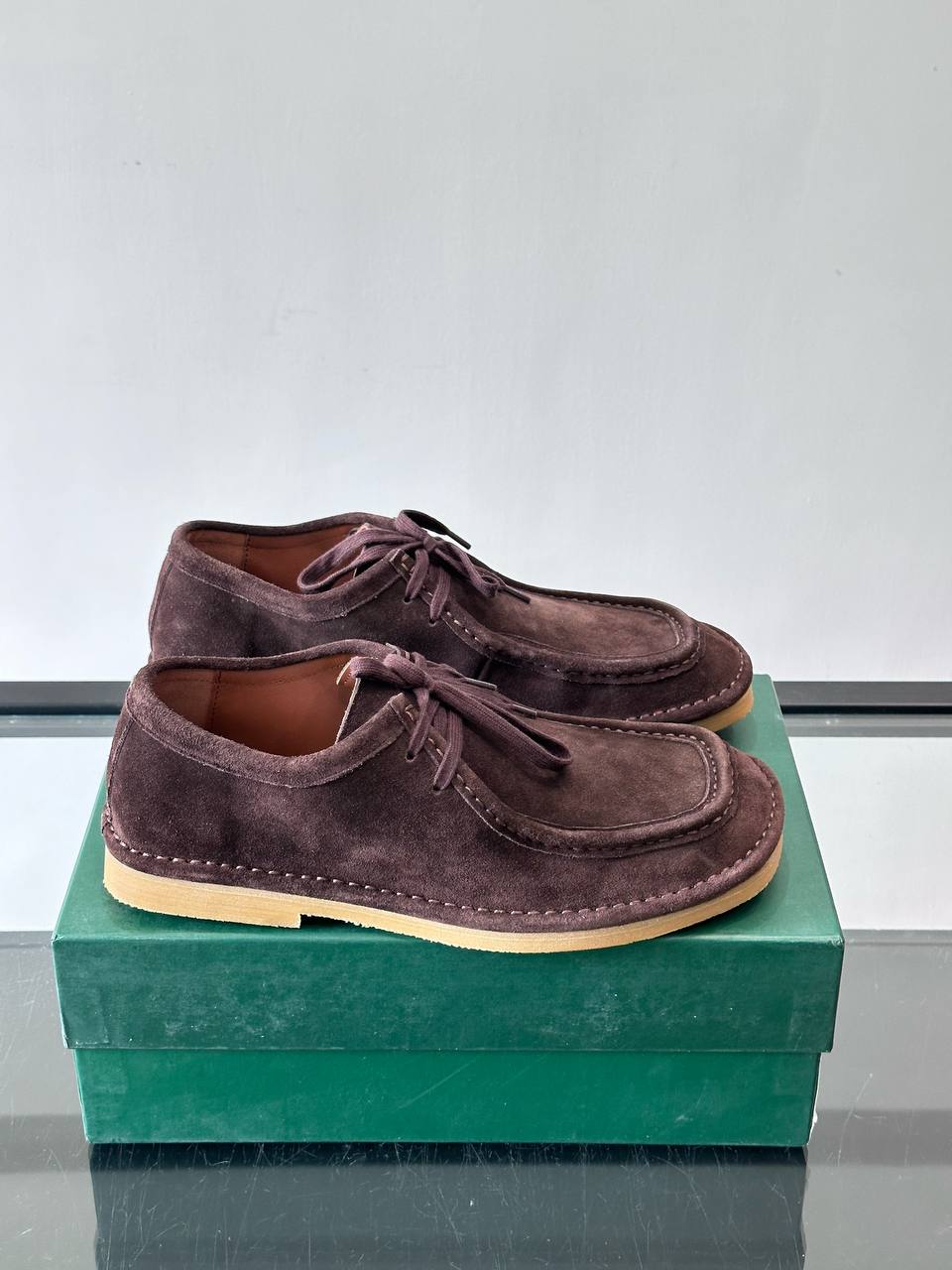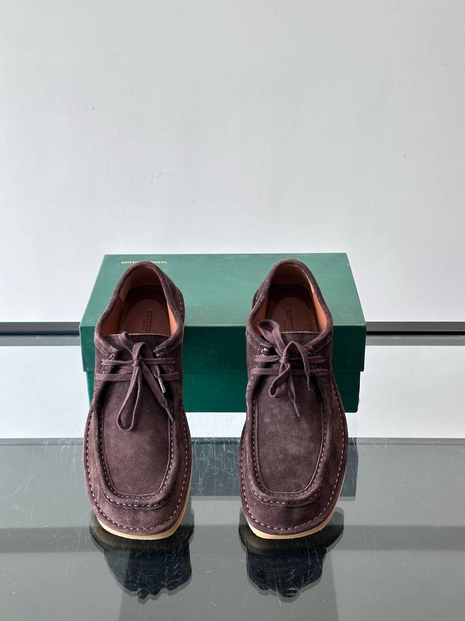 Элегантные мужские ботинки от Bottega Veneta в глубоком шоколадно-бордовом оттенке. Модель сочетает в себе классический мокасинный силуэт с современной городской эстетикой: мягкая замшевая поверхность, аккуратный апрон-носок с декоративной строчкой и контрастная светлая подошва.