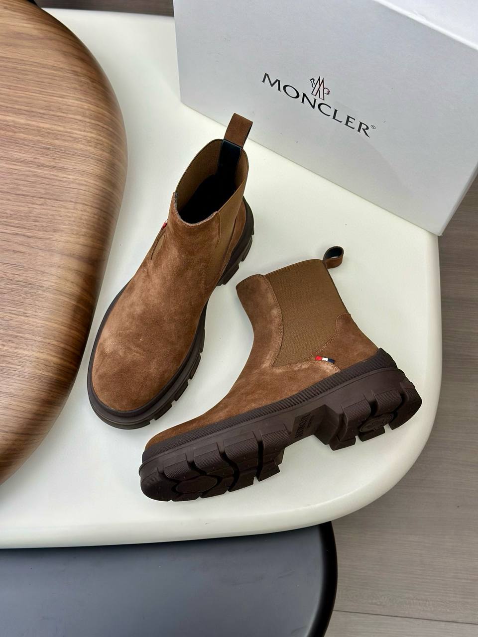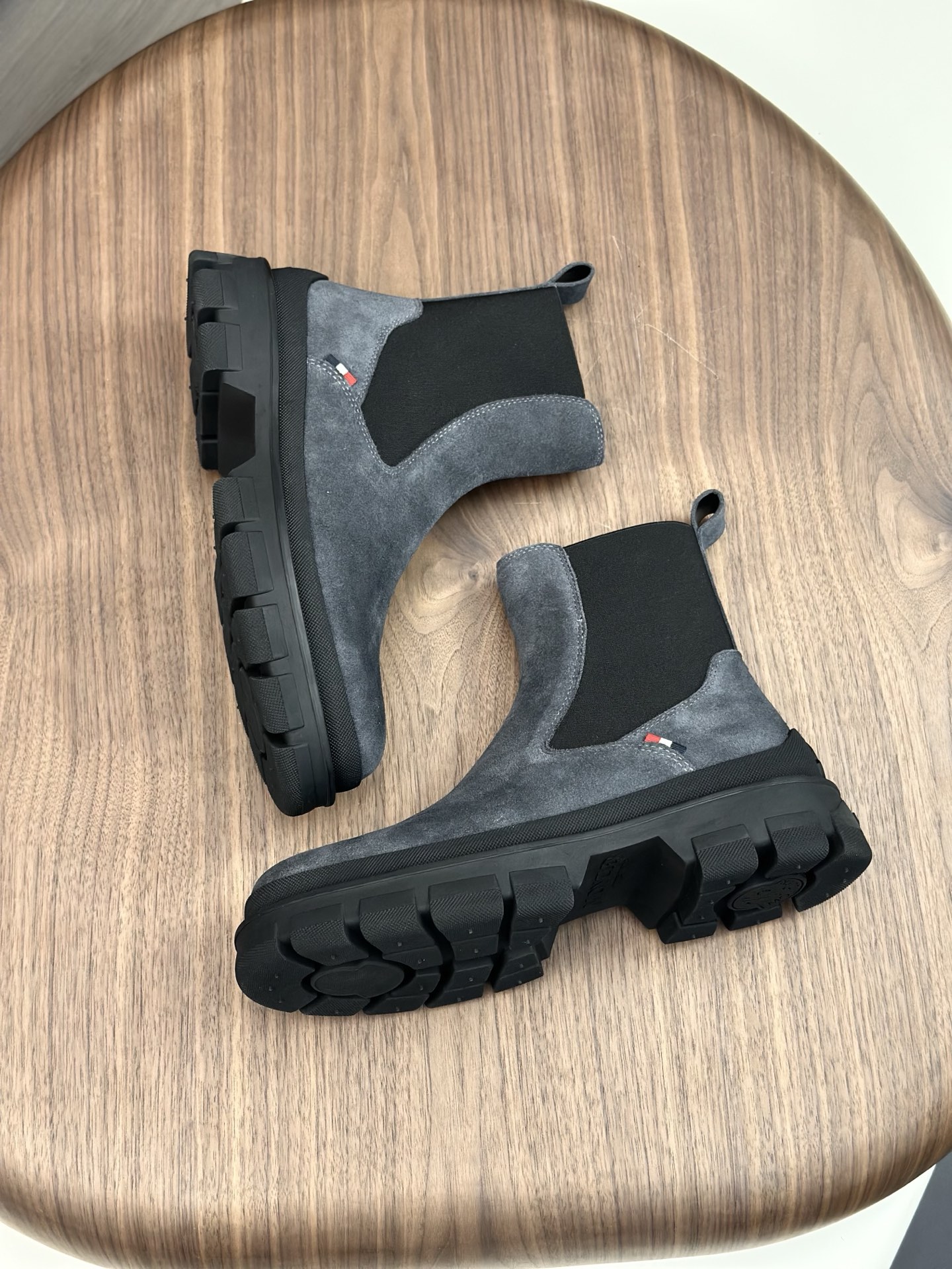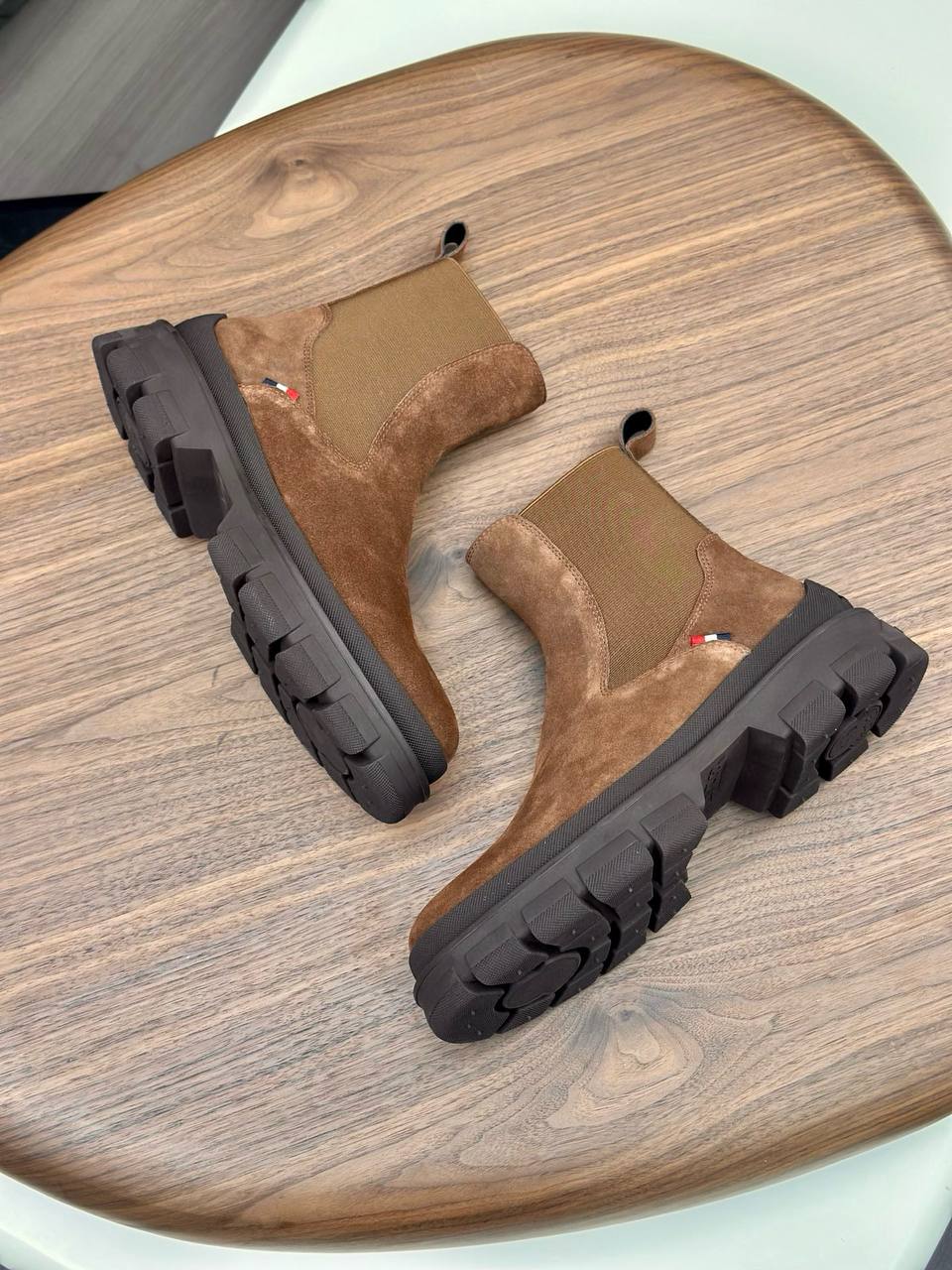 Ботинки Moncler сочетает в себе премиальные материалы и сдержанную элегантность. Верх из мягкой коровьей замши придаёт изделию благородную фактуру и утончённый оттенок, который легко вписывается в современный гардероб. Эластичные боковые вставки обеспечивают удобство при посадке на ногу и отражают классический челси‑крой, а задняя петля облегчает надевание. Массивная резиновая подошва с глубоким протектором добавляет мужскому образу спортивную динамику и обеспечивает надёжное сцепление с поверхностью. Маленький триколор‑акцент подчёркивает родство с фирменным стилем бренда, не отвлекая внимание от общего силуэта.