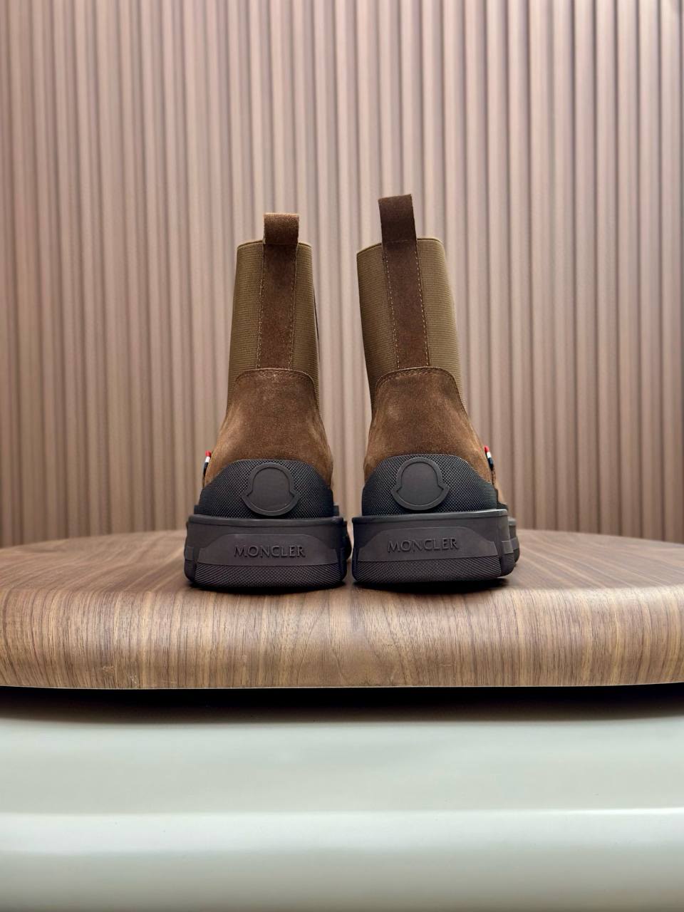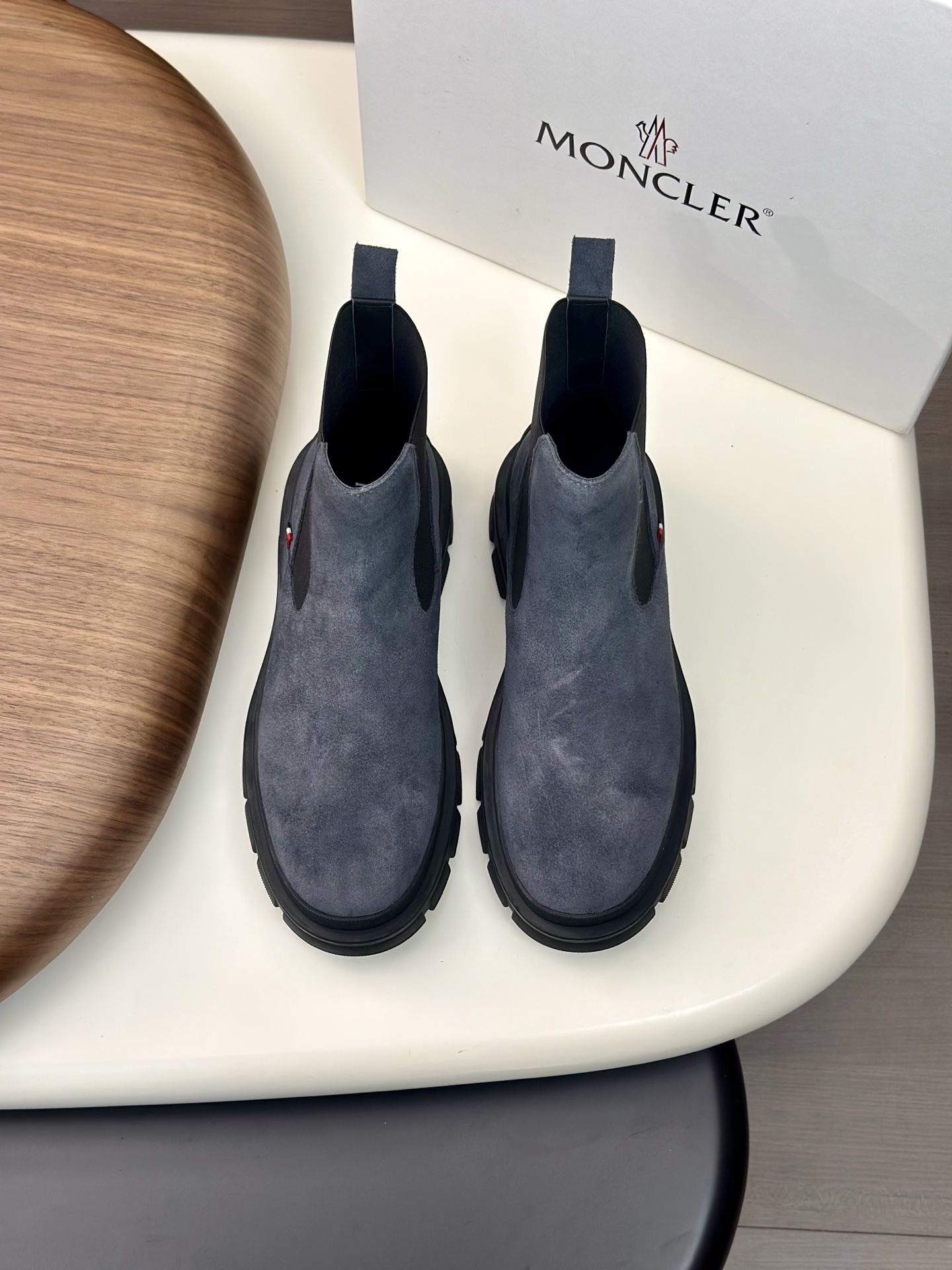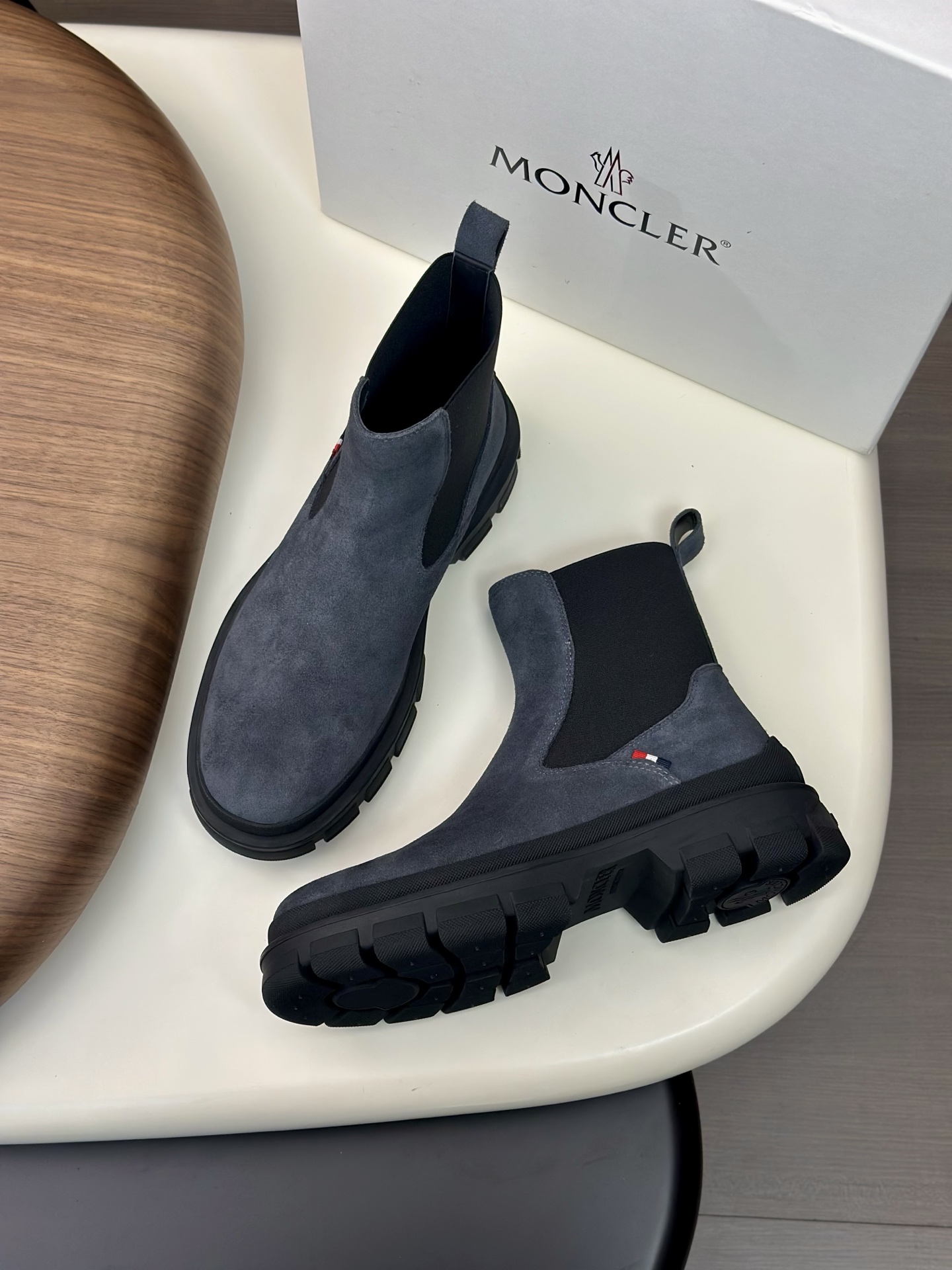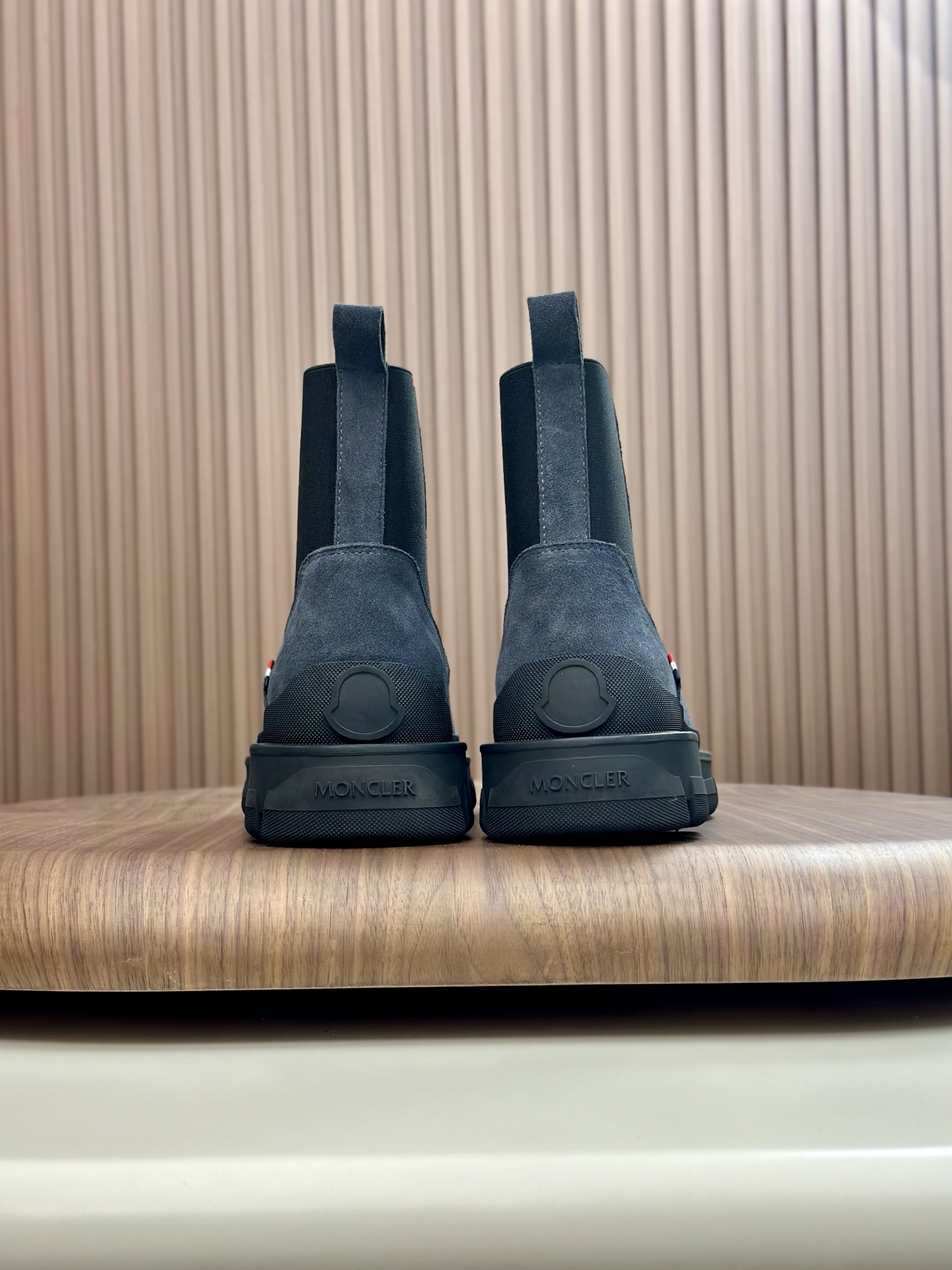 Ботинки Moncler сочетает в себе премиальные материалы и сдержанную элегантность. Верх из мягкой коровьей замши придаёт изделию благородную фактуру и утончённый оттенок, который легко вписывается в современный гардероб. Эластичные боковые вставки обеспечивают удобство при посадке на ногу и отражают классический челси‑крой, а задняя петля облегчает надевание. Массивная резиновая подошва с глубоким протектором добавляет мужскому образу спортивную динамику и обеспечивает надёжное сцепление с поверхностью. Маленький триколор‑акцент подчёркивает родство с фирменным стилем бренда, не отвлекая внимание от общего силуэта.