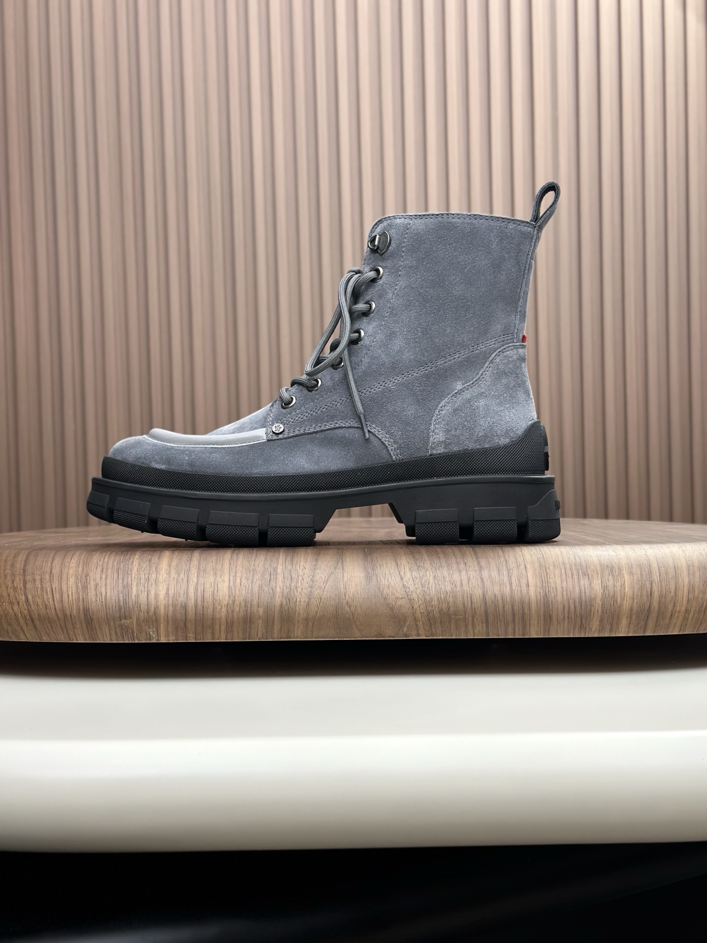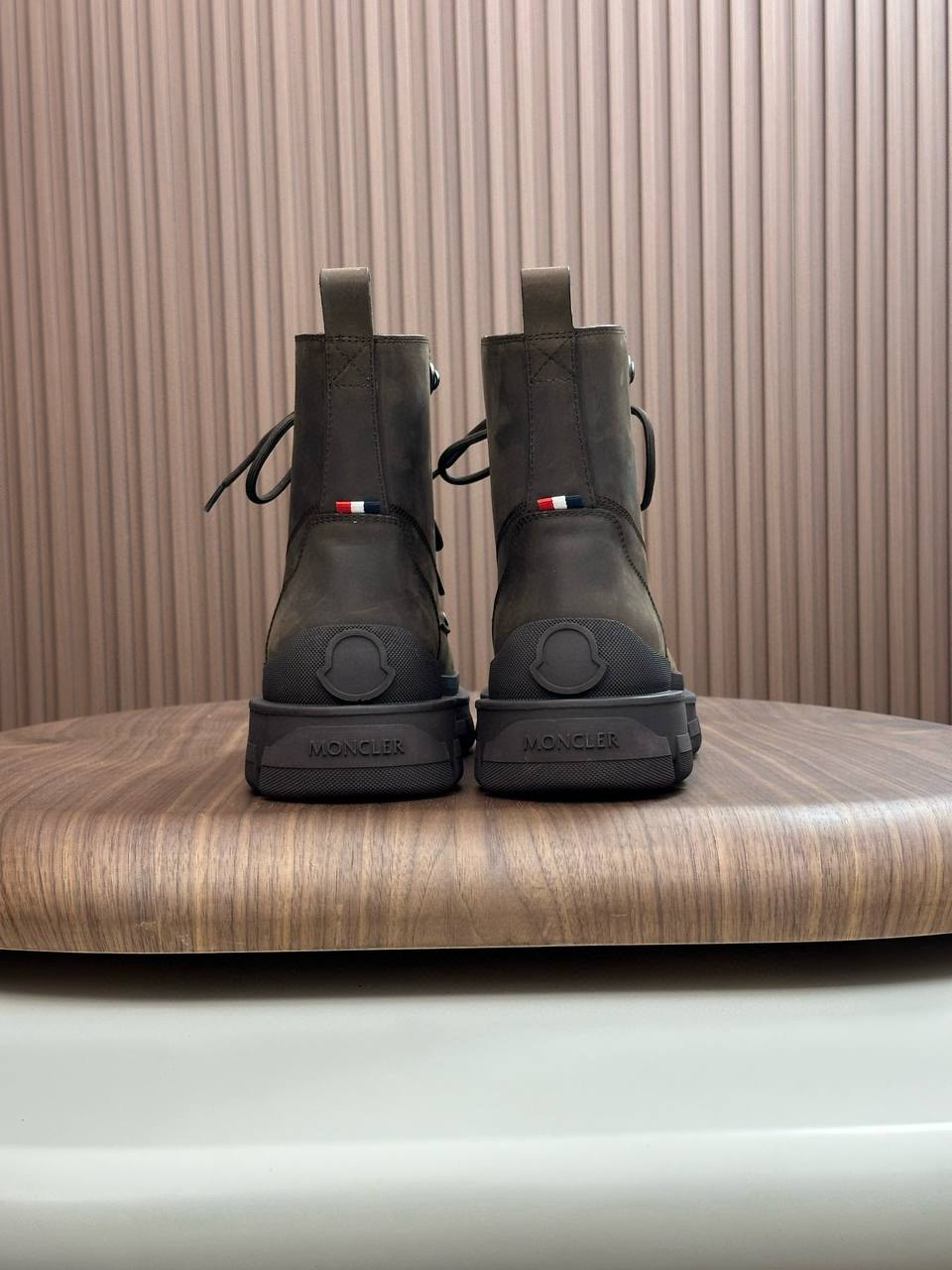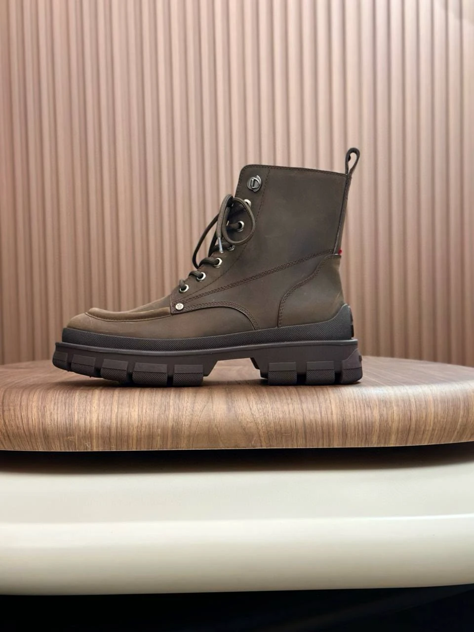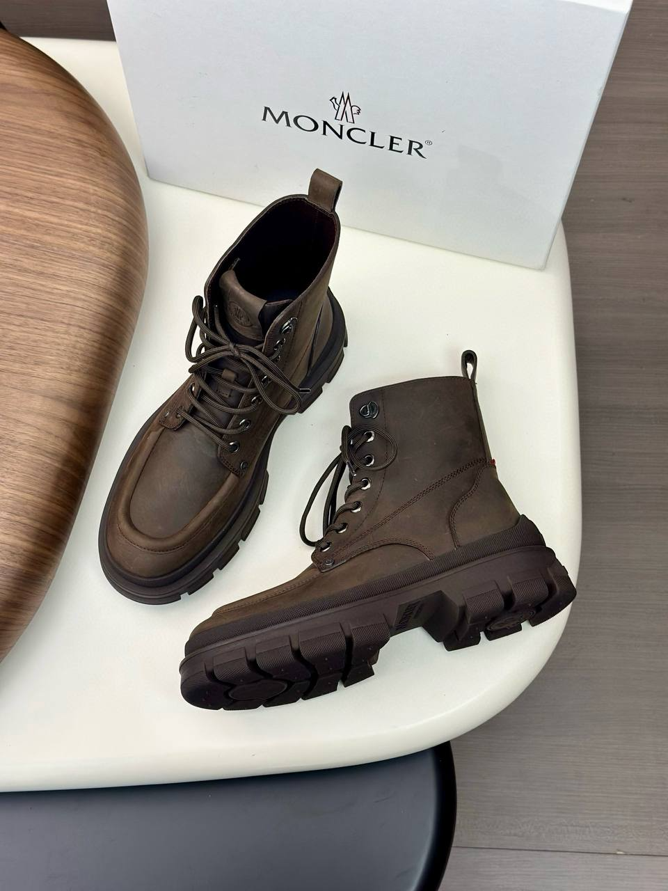 Элегантные и практичные ботинки Moncler из натуральной коровьей кожи в тёплом коричневом оттенке. Мягкая матовая фактура кожи, прочная рифлёная подошва и лаконичная шнуровка через металлические люверсы делают эту модель отличным выбором для города и активного отдыха в холодный сезон.