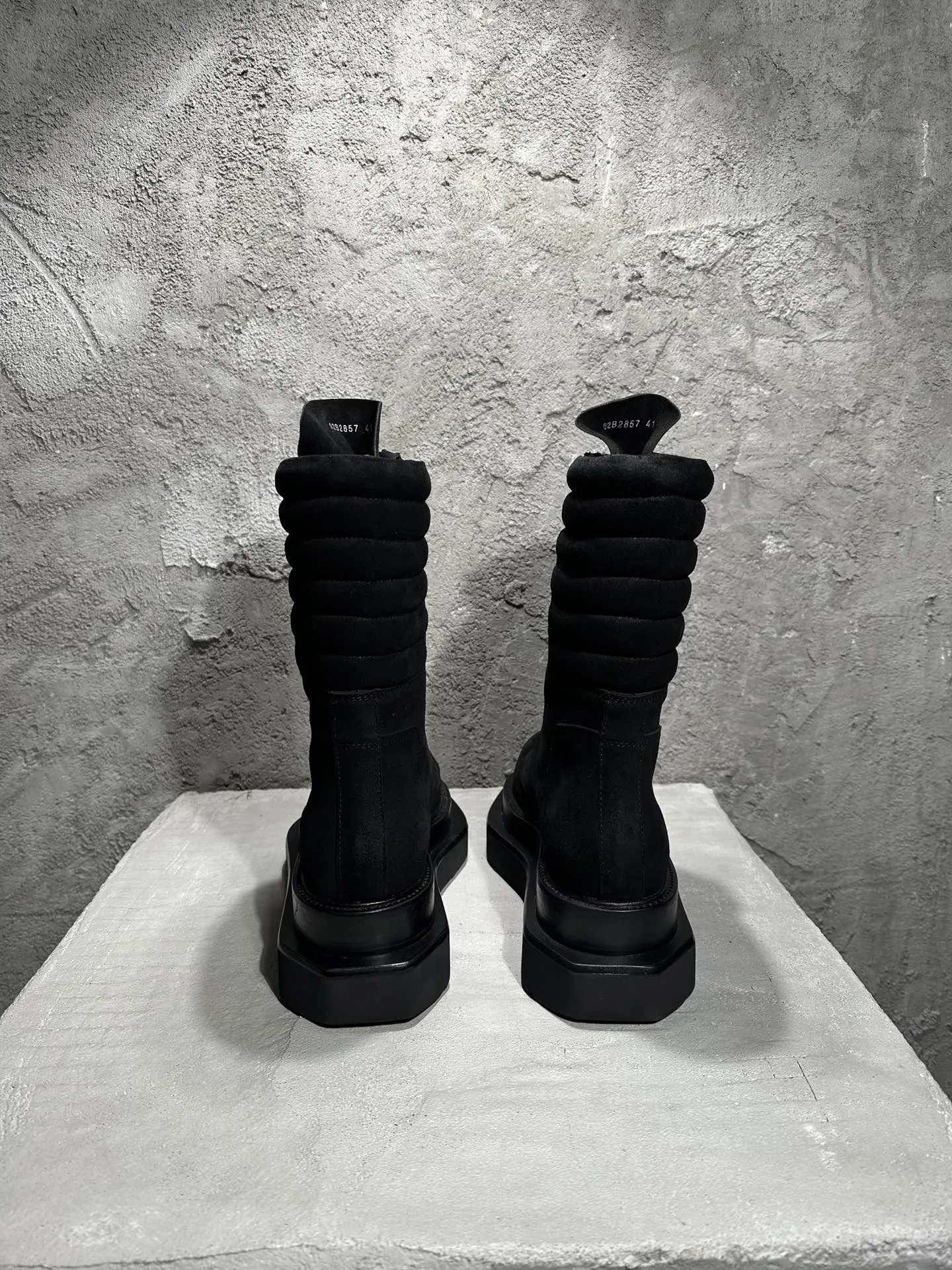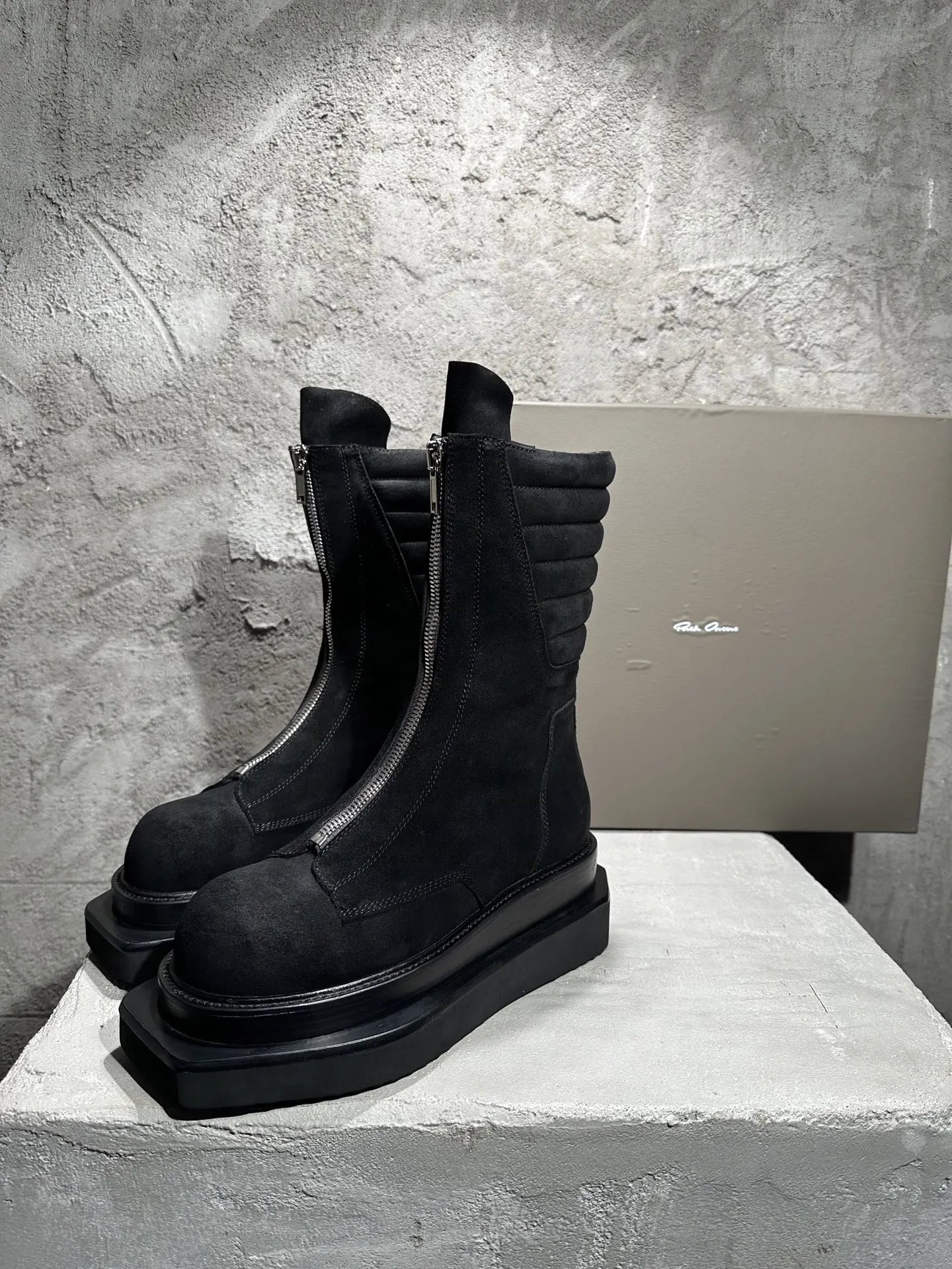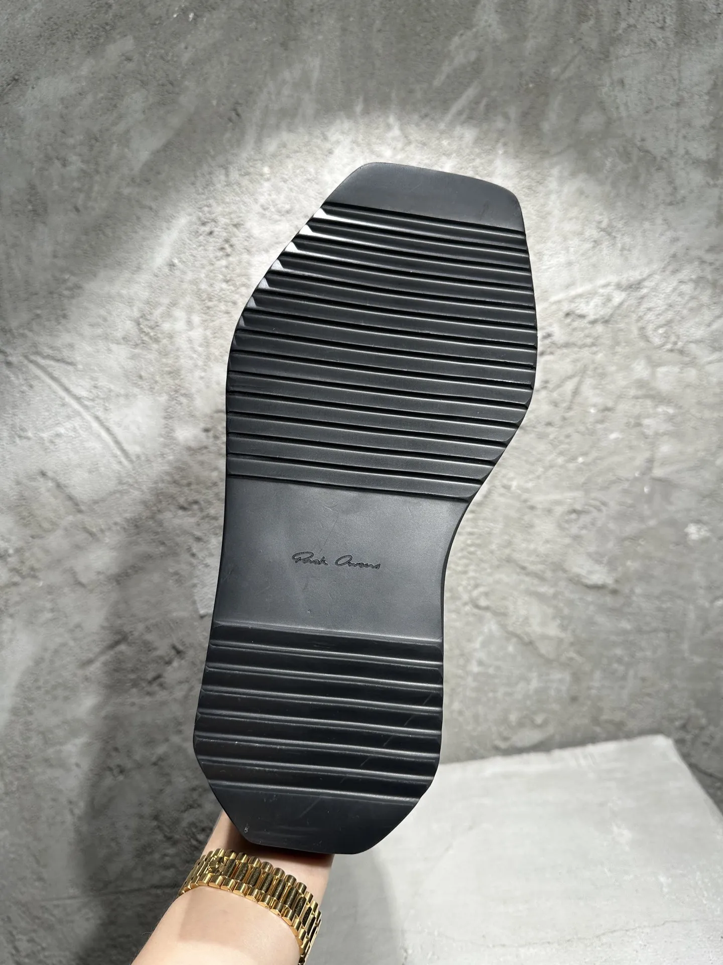 Ботинки Rick Owens из коллекции весна-лето 2023 — это стильная и утонченная обувь, подходящая для осенне-зимнего сезона. Они выделяются своей толстой геометрической подошвой с неровной формой, которая придаёт образу индивидуальность и оригинальность. Средняя застежка-молния облегчает процесс обувания и добавляет функциональности. Материалы — это продуманная многослойная комбинация: верх из вощеной матовой коровьей кожи, обеспечивающей прочность и стильный вид, и подкладка и стельки из окрашенной в воду коровьей кожи для дополнительного комфорта. Толщина подошвы и использование легких износостойких материалов делают ботинки не только стильными, но и практичными.
