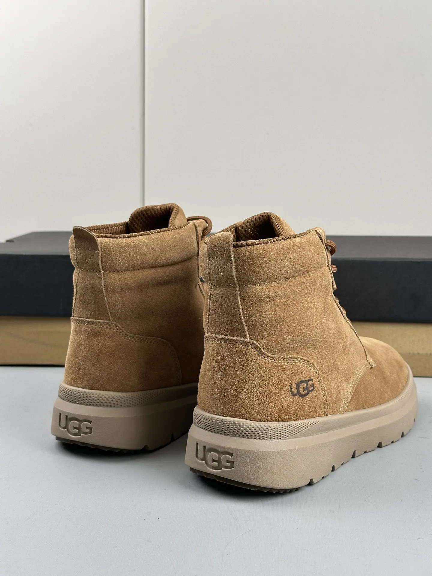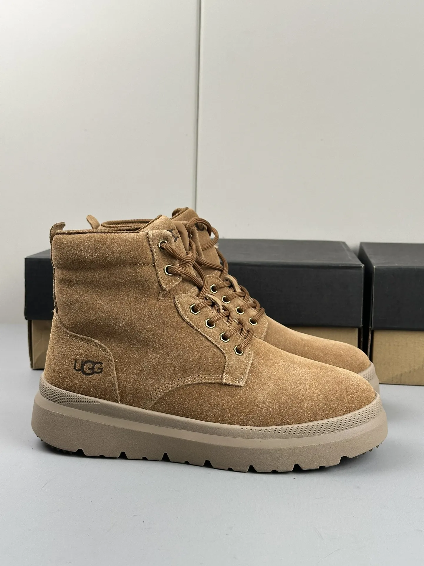Ботинки UGG с шерстяной стелькой и меховой подкладкой идеально подходят для холодной погоды, обеспечивая тепло и уют. Легкая подошва добавляет удобства при длительной носке, а дизайн с логотипом бренда подчеркивает стильный вид.
