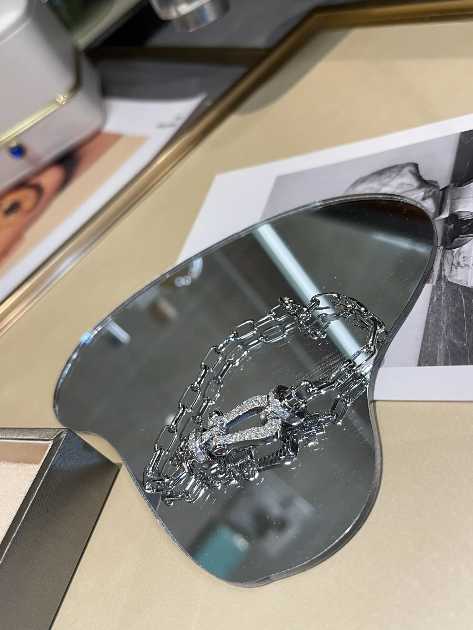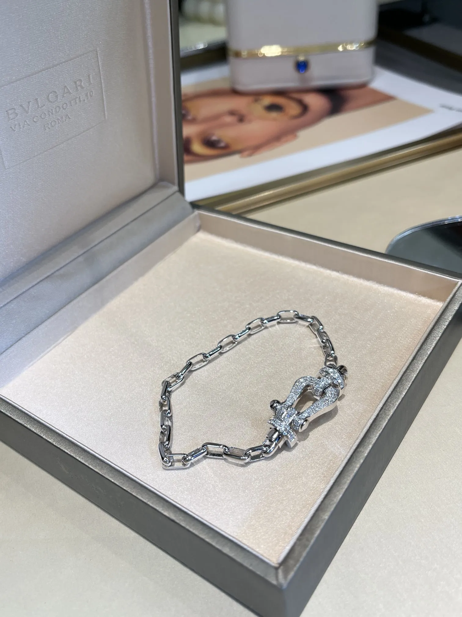 Браслет изготовлен из 18-каратного белого золота с пряжкой-подковой и бриллиантами. Пряжка-подкова является центральным элементом браслета, символизируя удачу и процветание. Элегантные линии и форма создают впечатление легкости и утонченности.