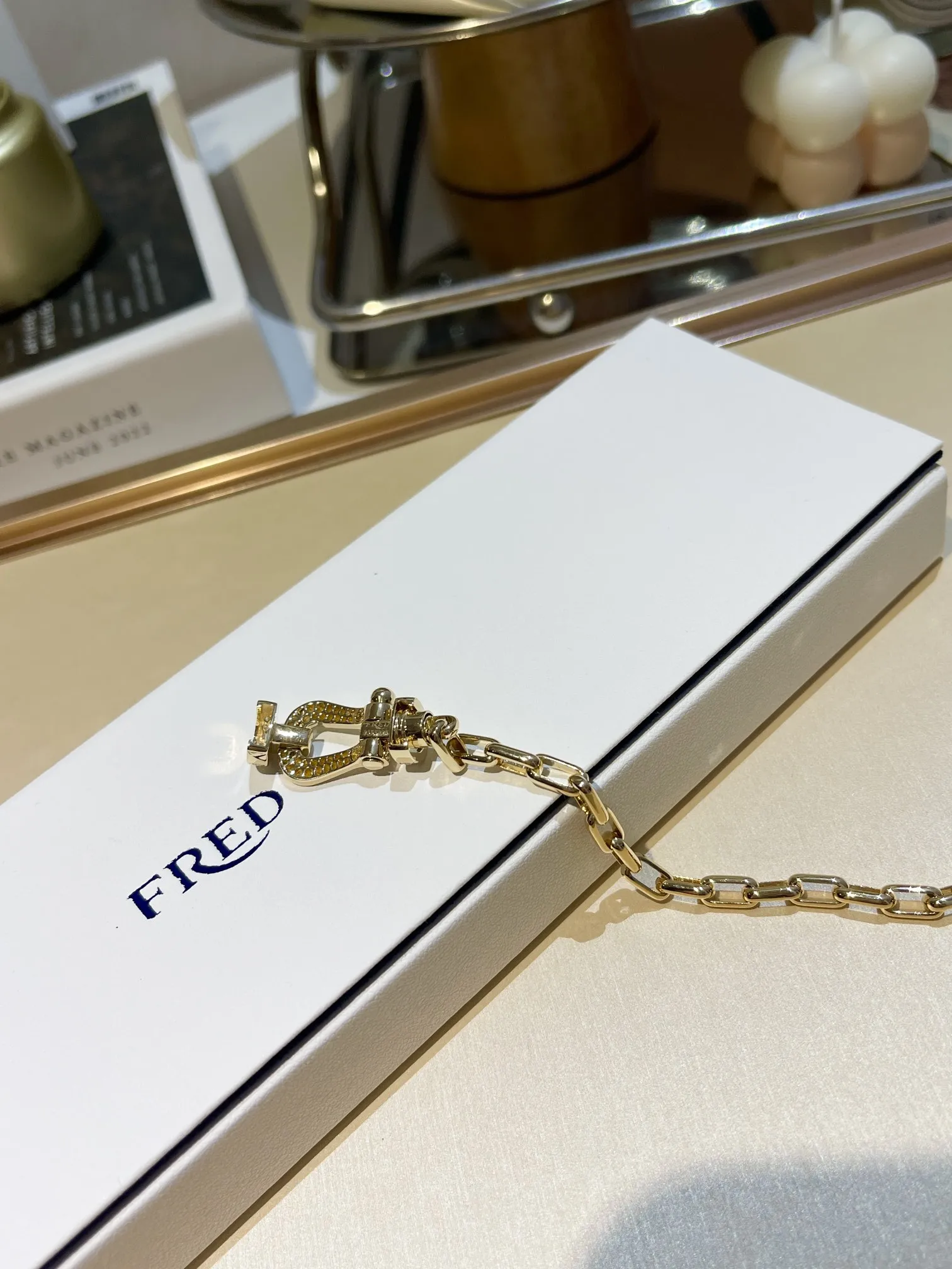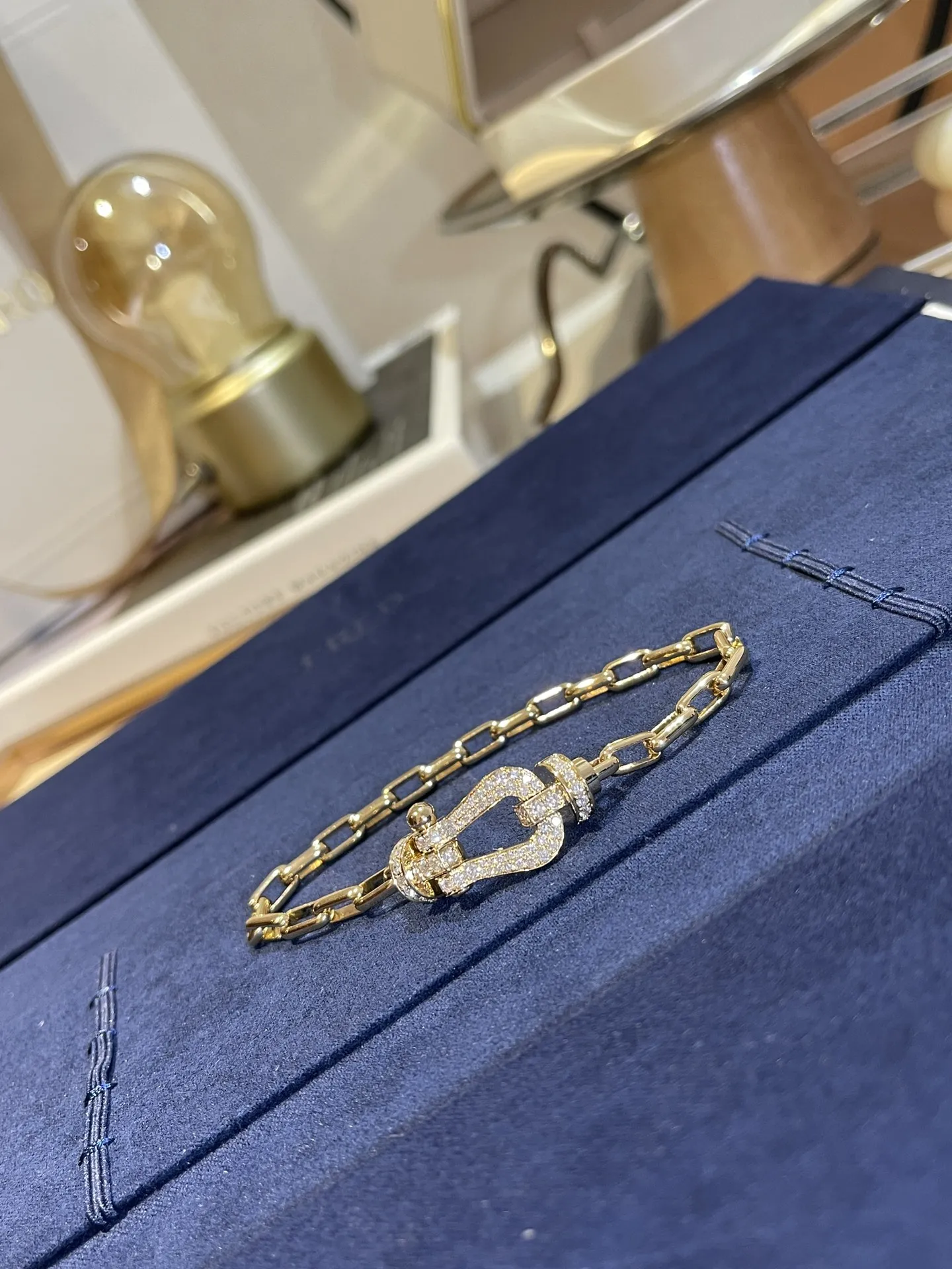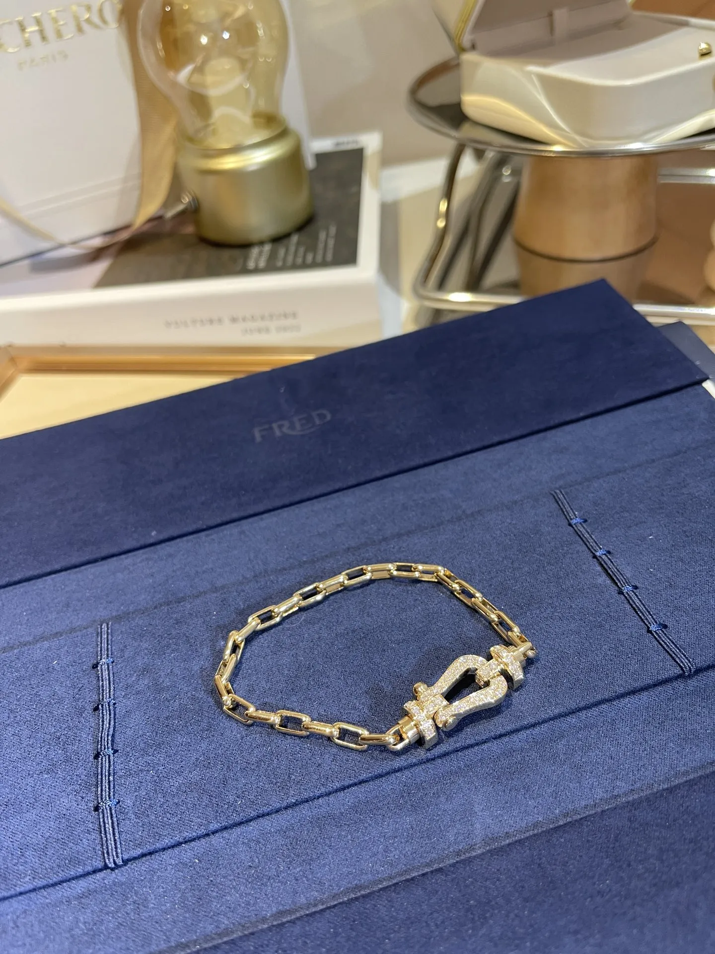 Браслет Fred изготовлен из 18-каратного желтого золота с пряжкой-подковой и бриллиантами. Пряжка в форме подковы символизирует удачу. Бриллианты, искусно инкрустированные в пряжку, добавляют блеска и роскоши.