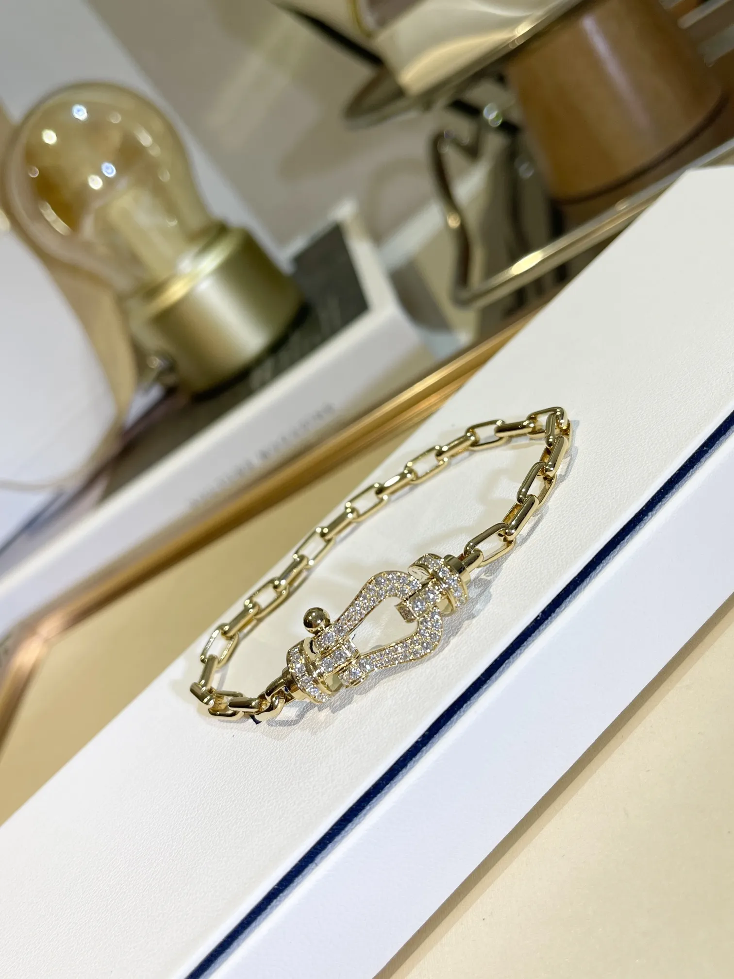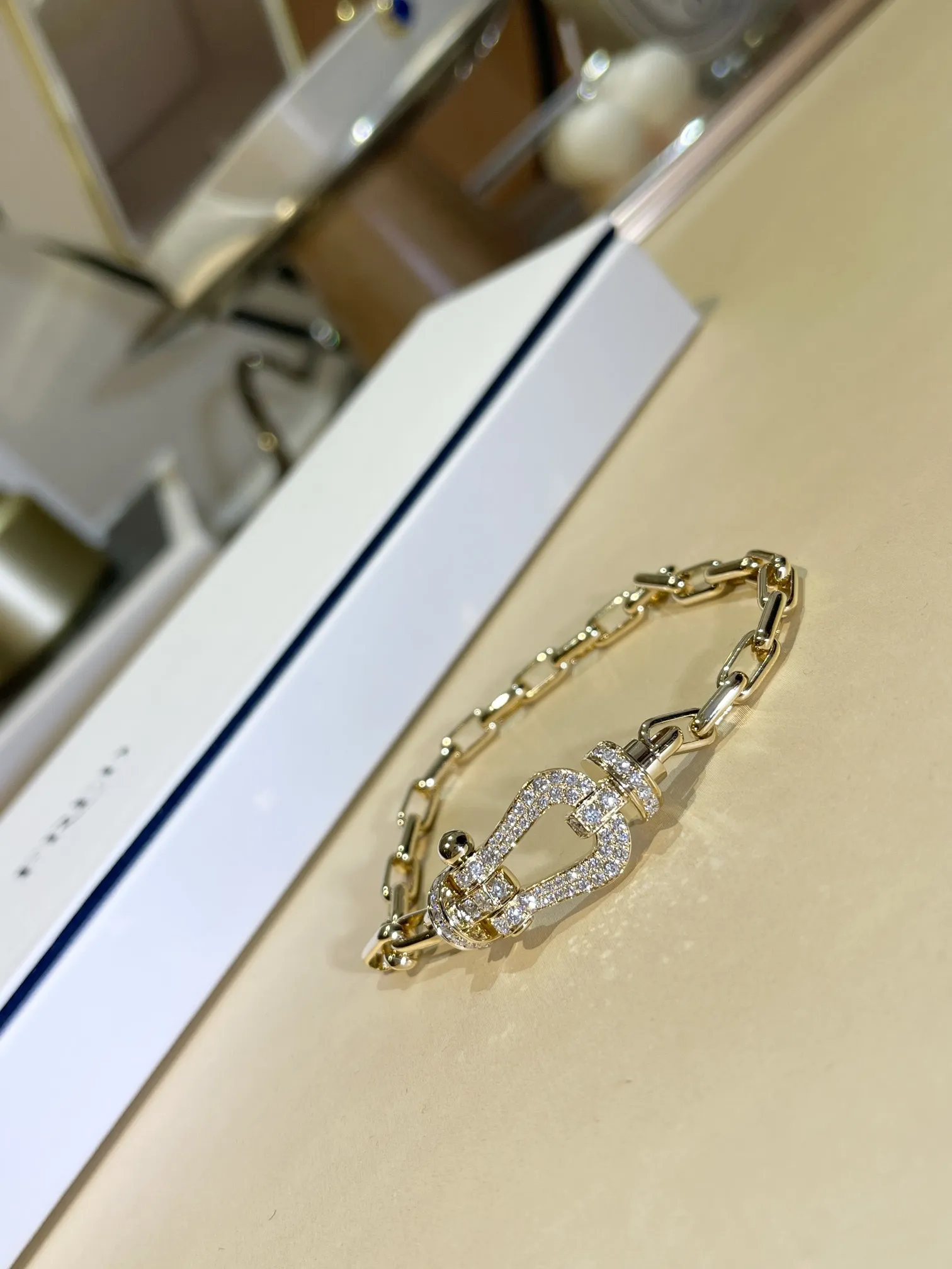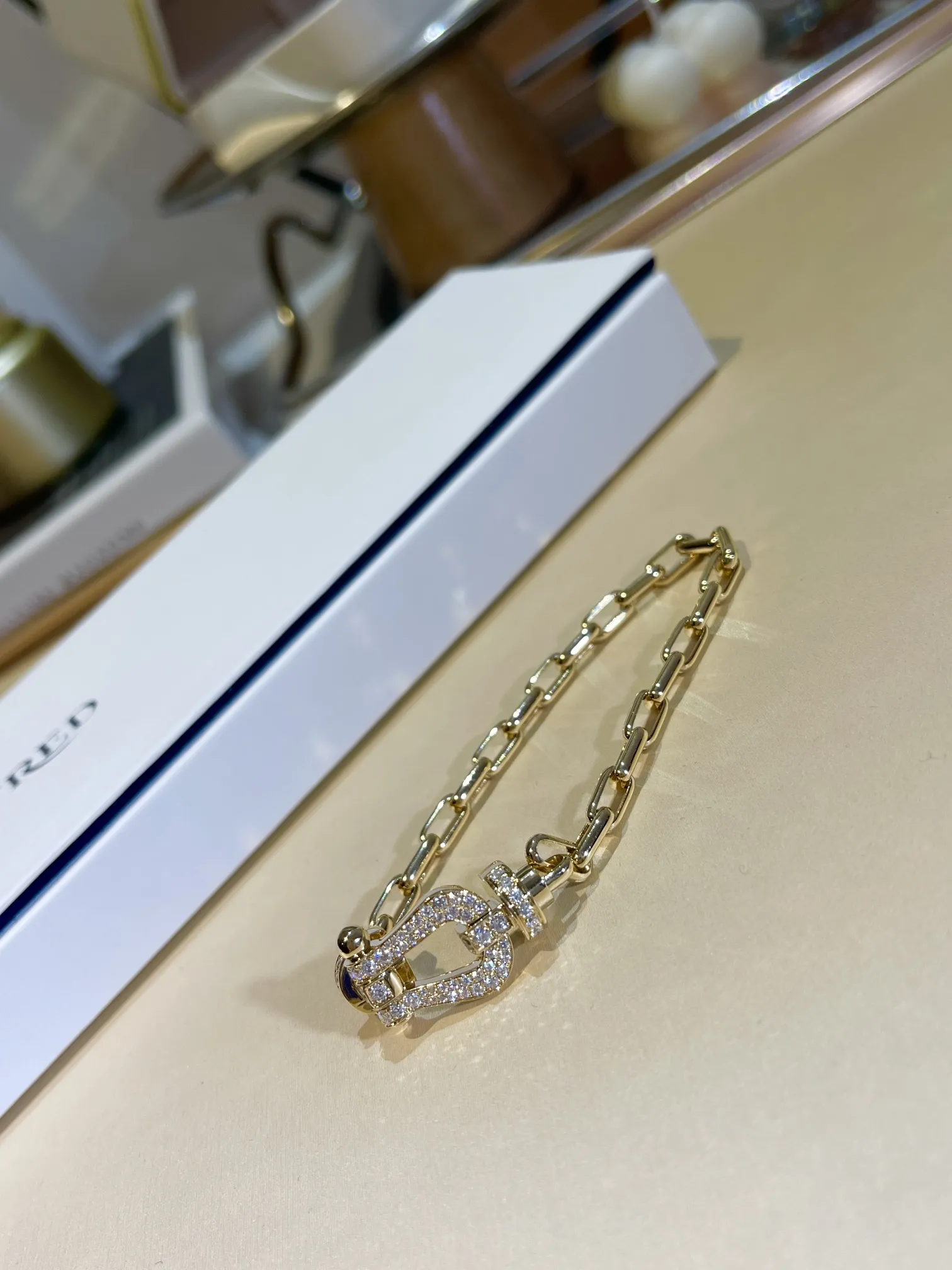 Браслет Fred изготовлен из 18-каратного желтого золота с пряжкой-подковой и бриллиантами. Пряжка в форме подковы символизирует удачу. Бриллианты, искусно инкрустированные в пряжку, добавляют блеска и роскоши.