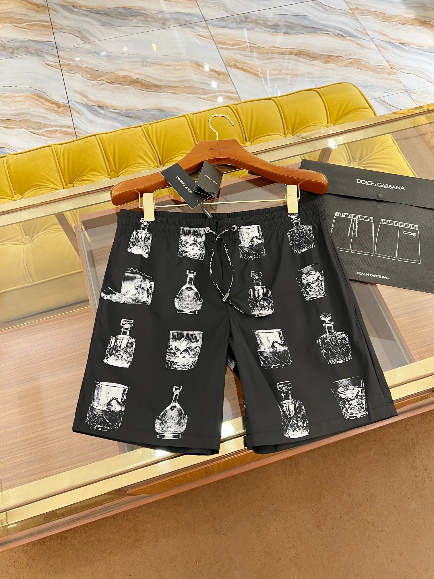 Мужские шорты Louis Vuitton выполнены из высококачественного материала, который обеспечивает комфорт и легкость в носке. Модель представлена в классическом черном цвете с оригинальным белым принтом в виде бутылок и бокалов, что придаёт изделию стильный и современный вид.