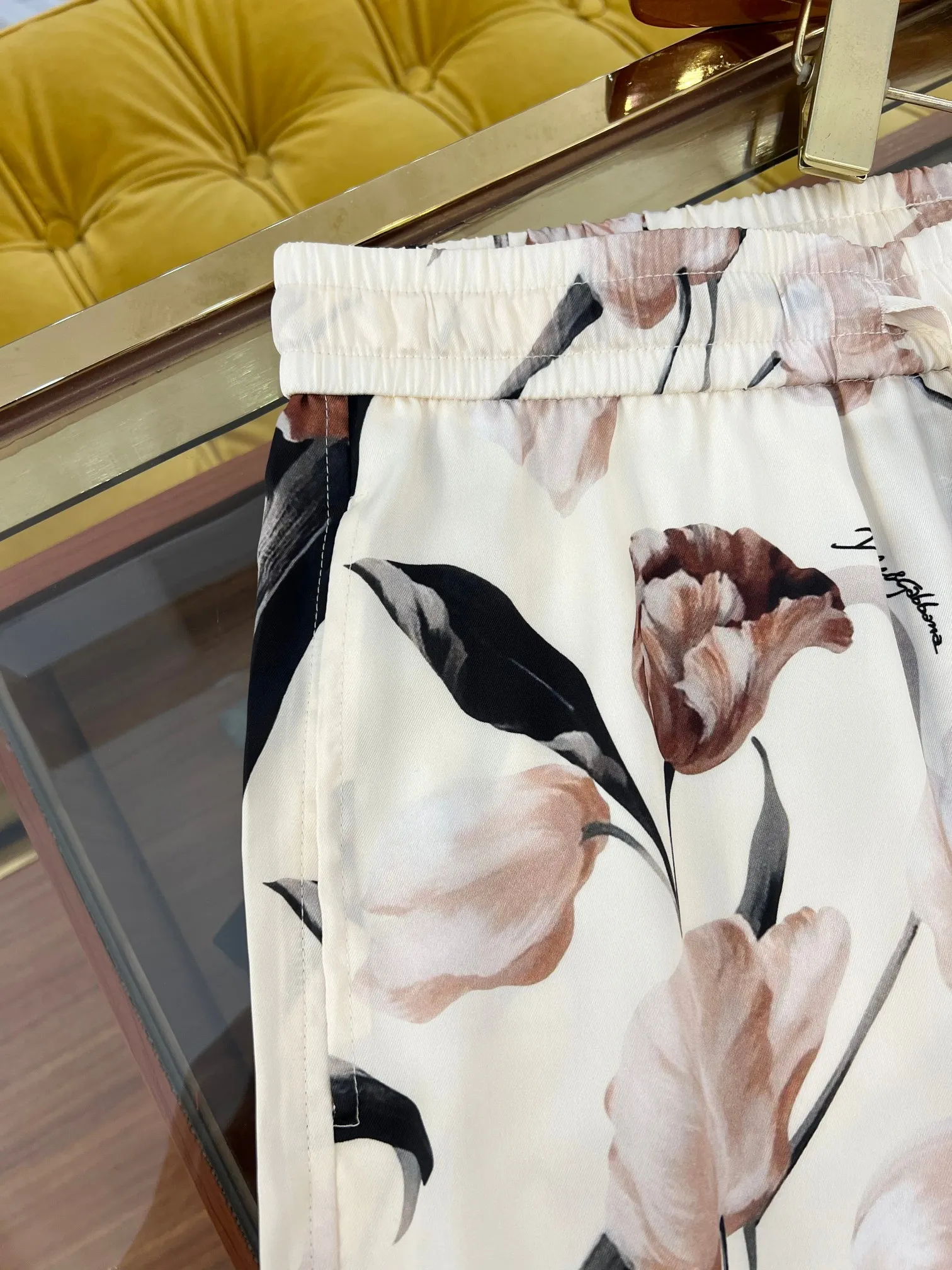 Белая основа украшена крупным цветочным принтом в нежных бежево-коричневых тонах, что придает образу особую изысканность и свежесть. Эластичный пояс гарантирует удобную посадку, а прямой крой обеспечивает свободу движений. Идеальный выбор для летнего гардероба и стильного отдыха.
