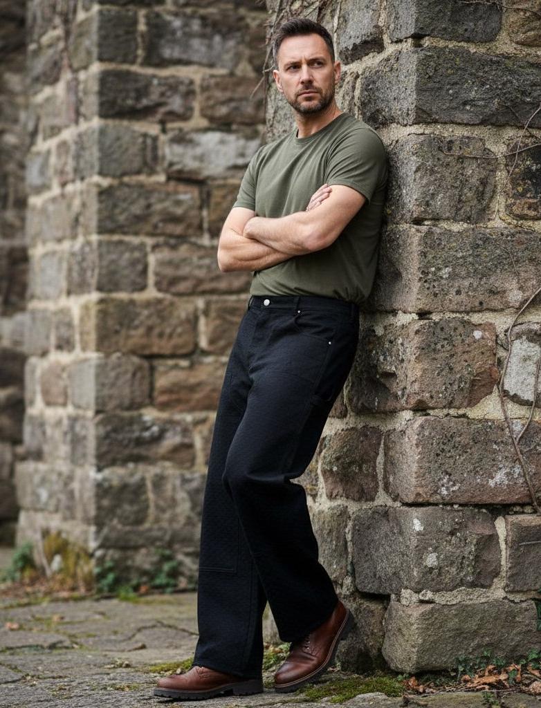 • Крой: прямые штанины, свободная посадка по бедру и голени.
