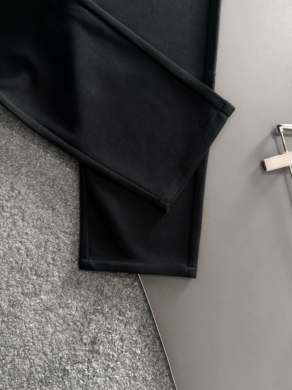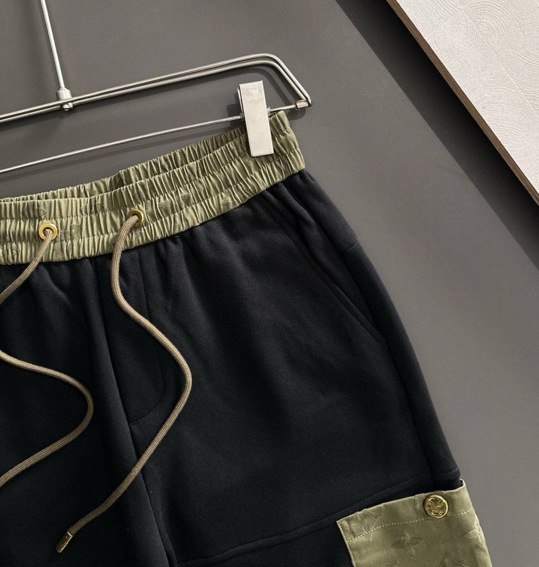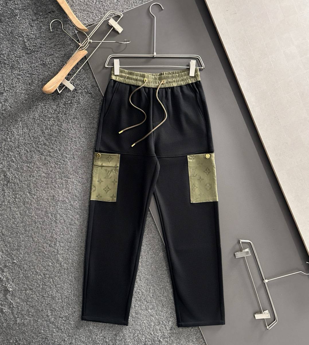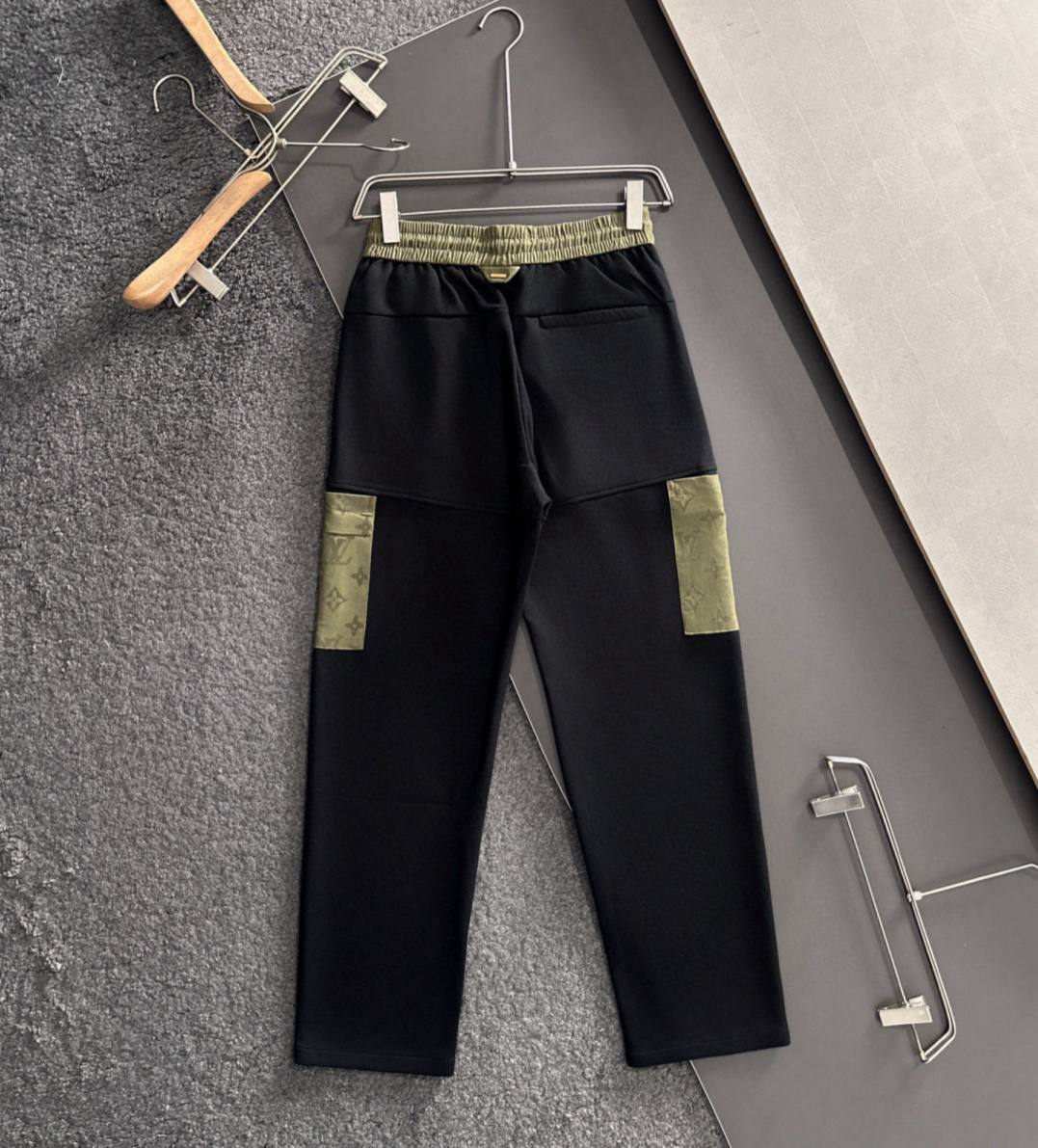 Брюки выполнены в современном спортивно-элегантном ключе: ровный, слегка зауженный к низу силуэт сочетается с комфортной эластичной талией на кулиске. Талия оформлена в контрастном оливковом оттенке с затягивающимся шнурком и металлическими наконечниками золотистого тона. На передней части бедер расположены выразительные накладные карманы прямоугольной формы в оливковом цвете с характерным монограмм-рисунком LOUIS VUITTON — аккуратно пришитые, с декоративной пуговицей/застёжкой сверху. Швы на уровне колена визуально делят изделие и придают современную структурированность. Низ брюк прямой/слегка зауженный, без манжет, что делает модель универсальной для сочетания как со спортивной, так и с более элегантной обувью.