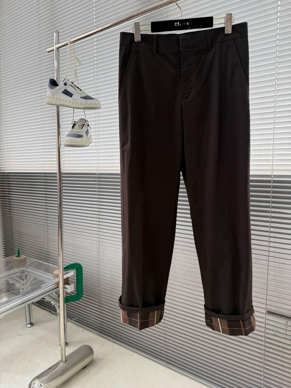 • Отвороты: заметные отвороты с контрастной подкладкой в клетку — изящный акцент, придающий брюкам характер и возможность менять настроение образа.