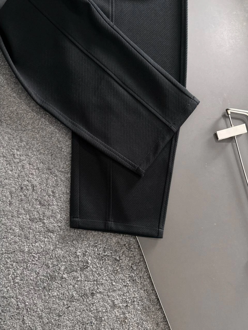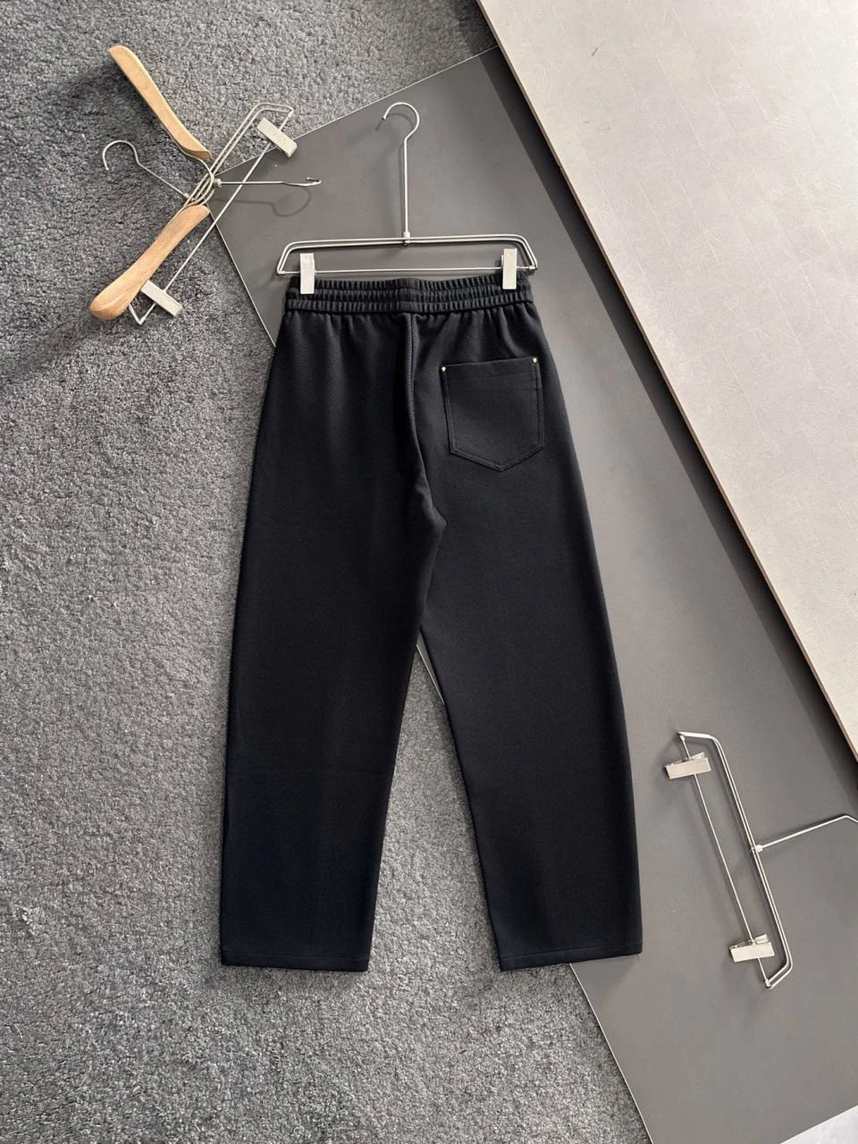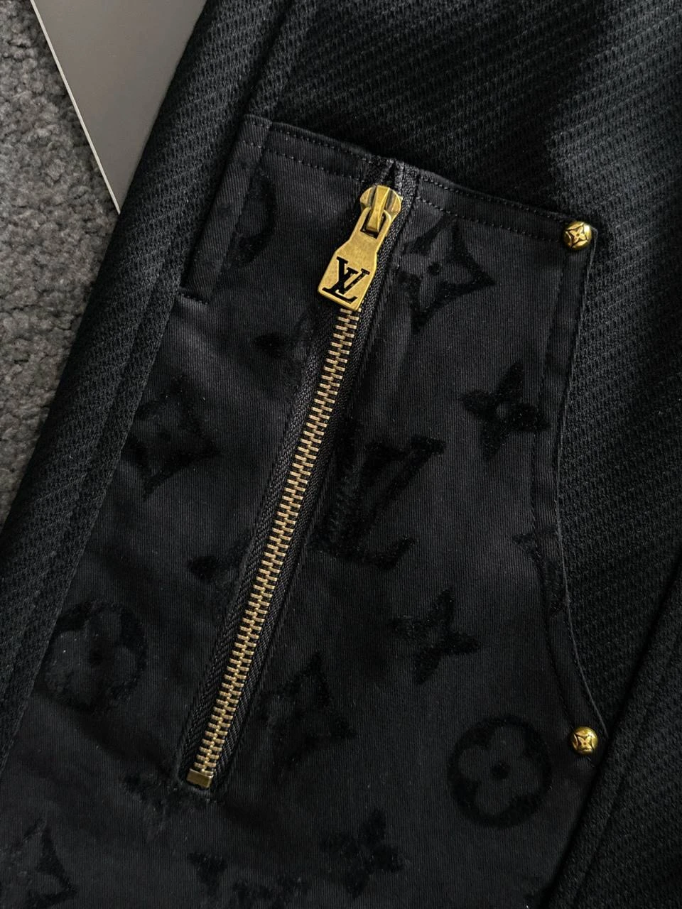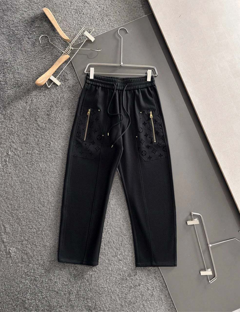 Брюки Louis Vuitton сочетают удобство джоггеров с утончённой эстетикой дома моды. Плотный эластичный технический трикотаж обеспечивает аккуратную посадку и мягкую структуру, при этом сохраняет форму при носке. Эластичный пояс с внутренним шнурком позволяет легко регулировать посадку, а контрастные декоративные швы по передней части визуально удлиняют силуэт. Два накладных передних кармана с вертикальными молниями и золотистой фурнитурой оформлены тональным принтом Monogram, который деликатно подчёркивает брендовый характер вещи, не нарушая сдержанной монохромной палитры. Низ брюк имеет слегка укороченную, зауженную к лодыжке линию, что делает модель идеальной для сочетания с кроссовками или лоферами.
