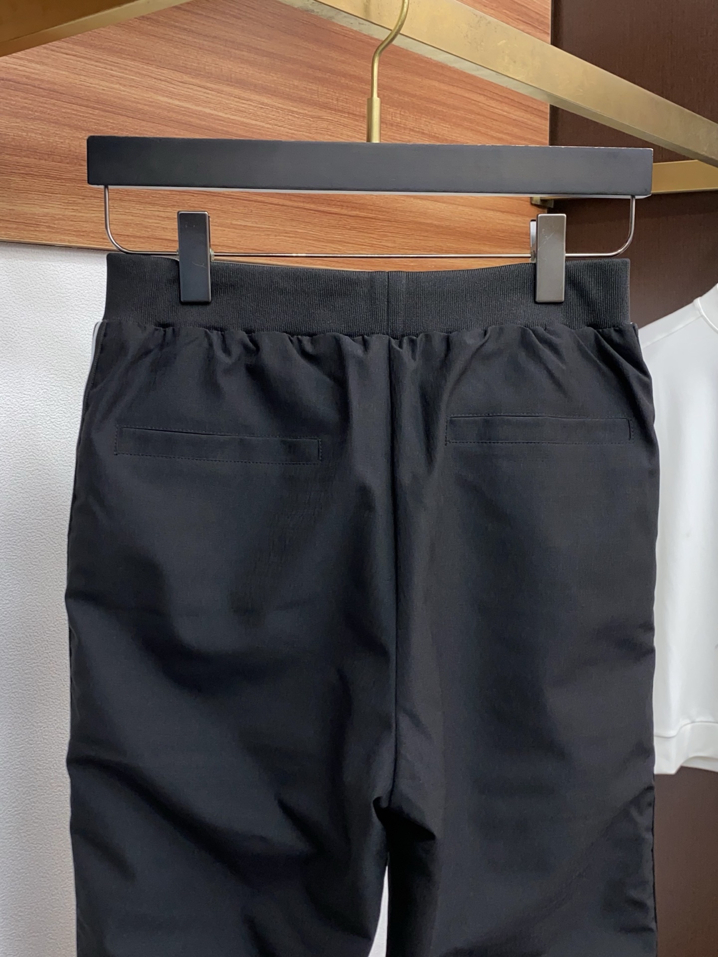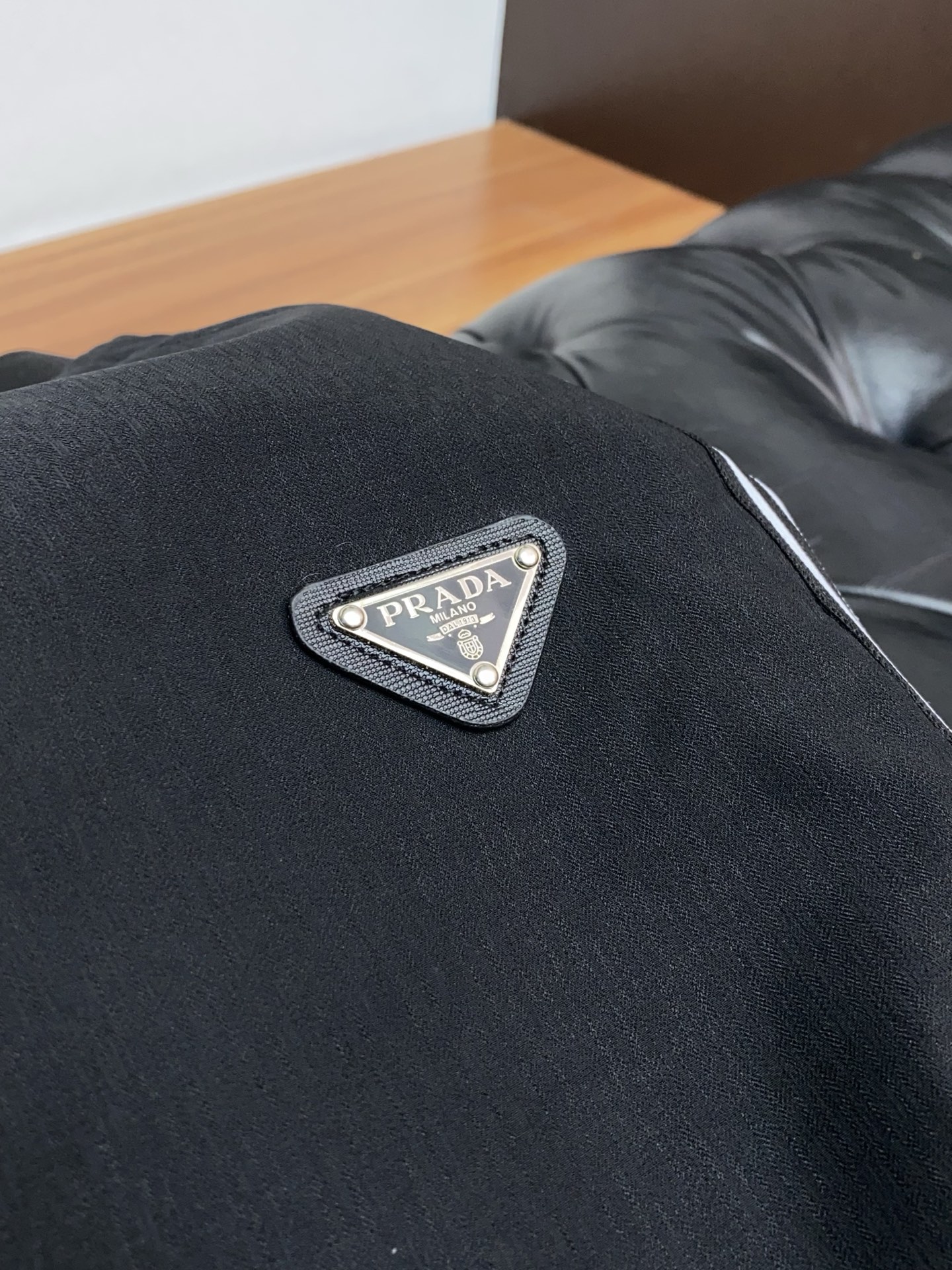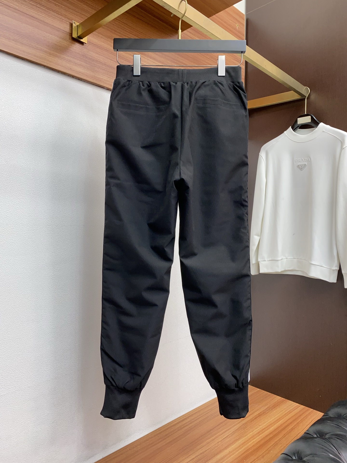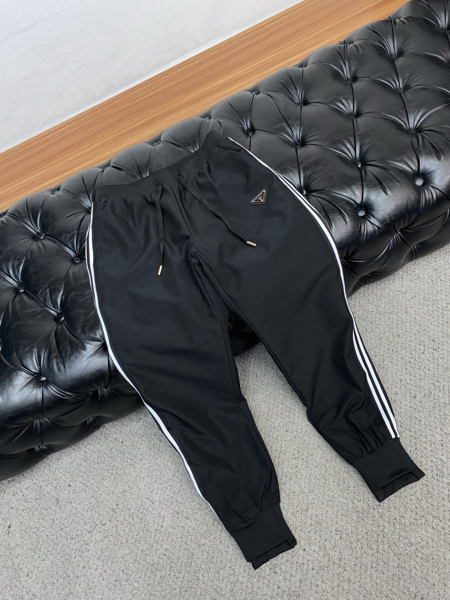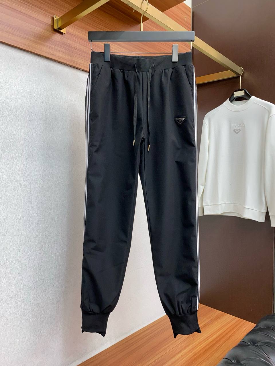 • Декор: контрастные тонкие белые лампасы вдоль боковых швов придают динамику; металлизированный или эмалированный треугольный логотип PRADA на левом бедре — фирменный акцент.