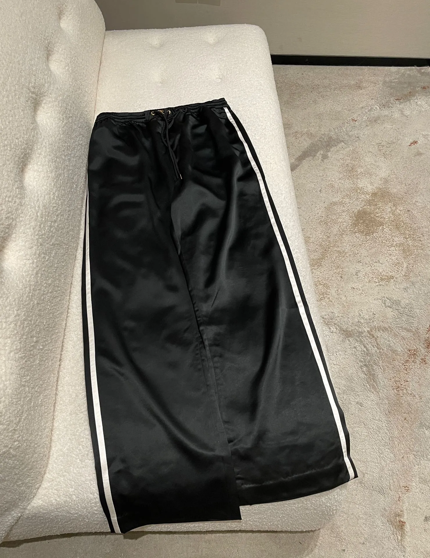 Брюки-джоггеры Celine из ацетатного шелка — отличный выбор для тех, кто ценит комфорт и стиль. Эластичная резинка на талии и пояс на шнурке делают брюки удобными и легко настраиваемыми по фигуре, что идеально подходит для повседневного ношения. Контрастные цвета по бокам добавляют динамики и современности, а плавные линии подчеркивают силуэт.