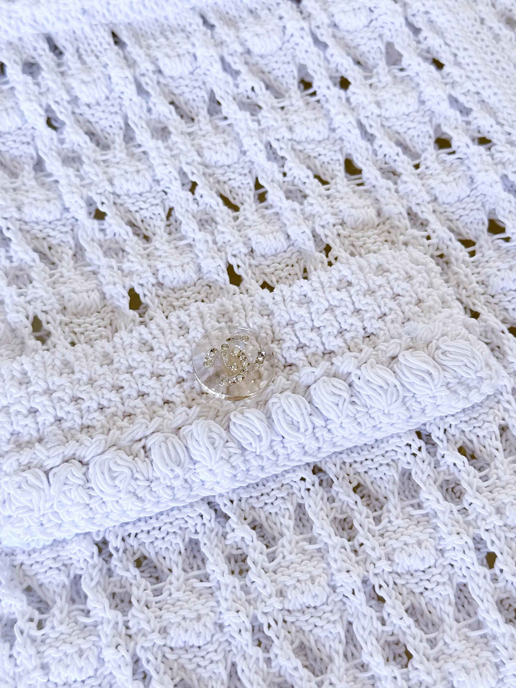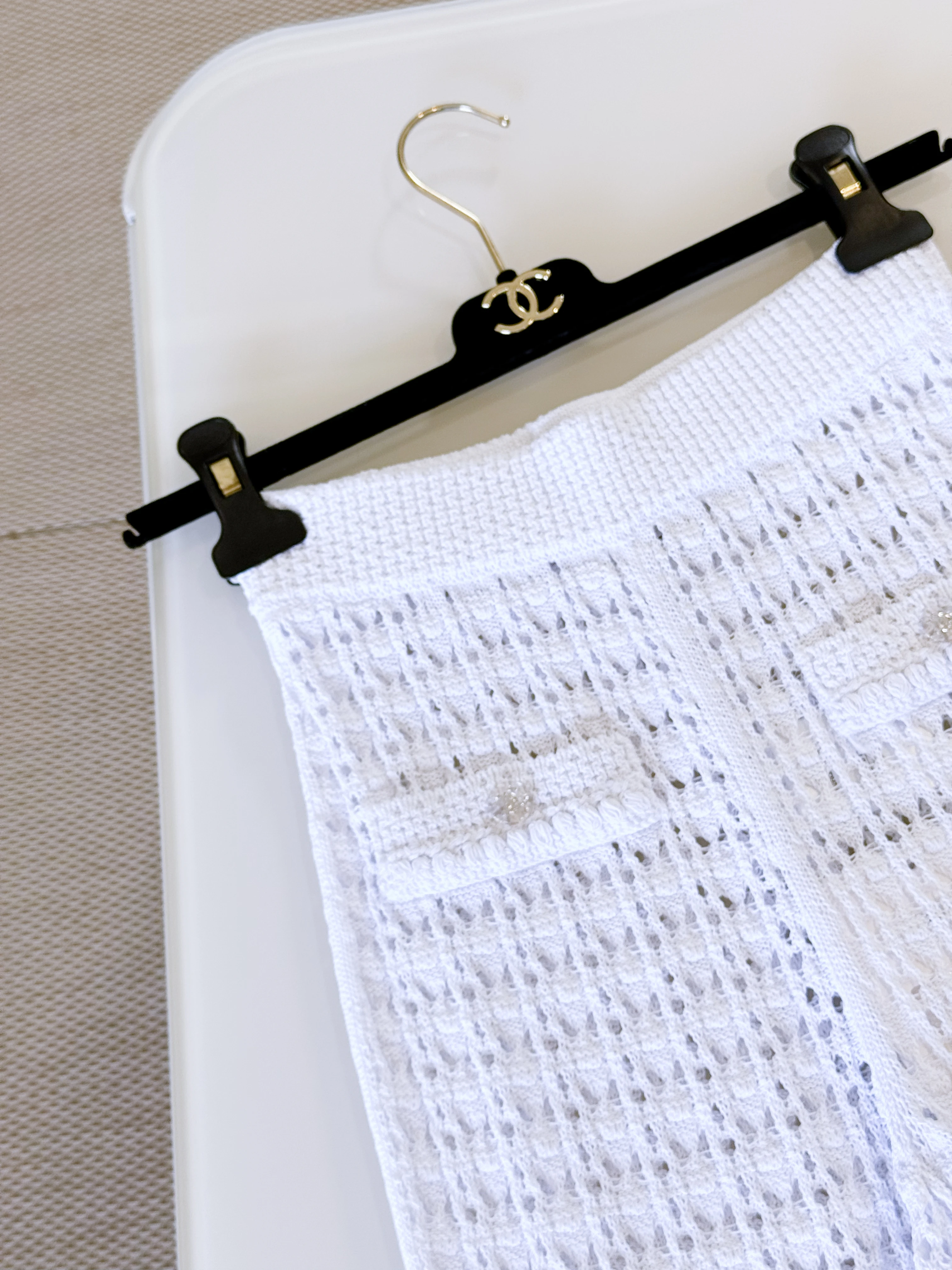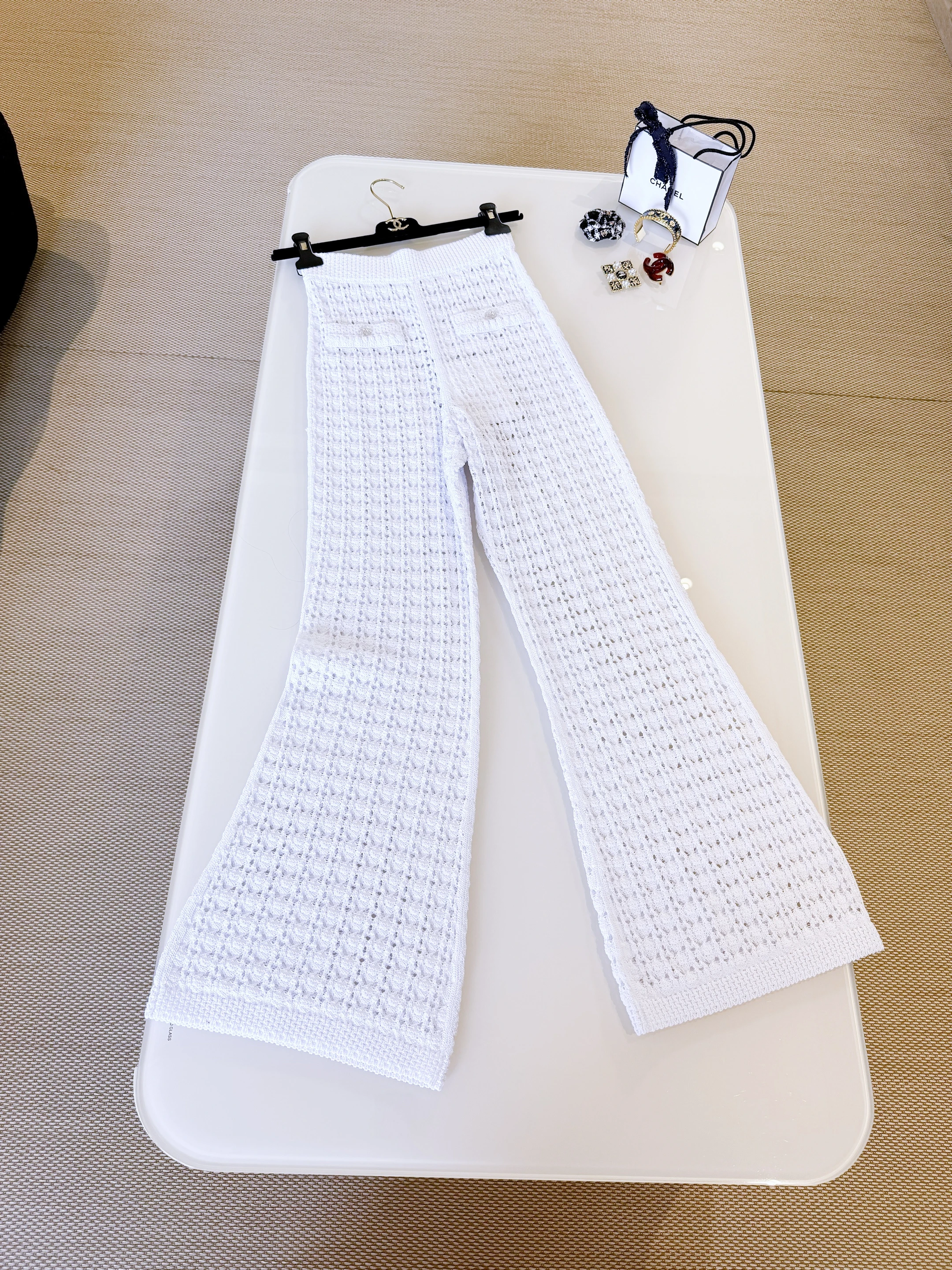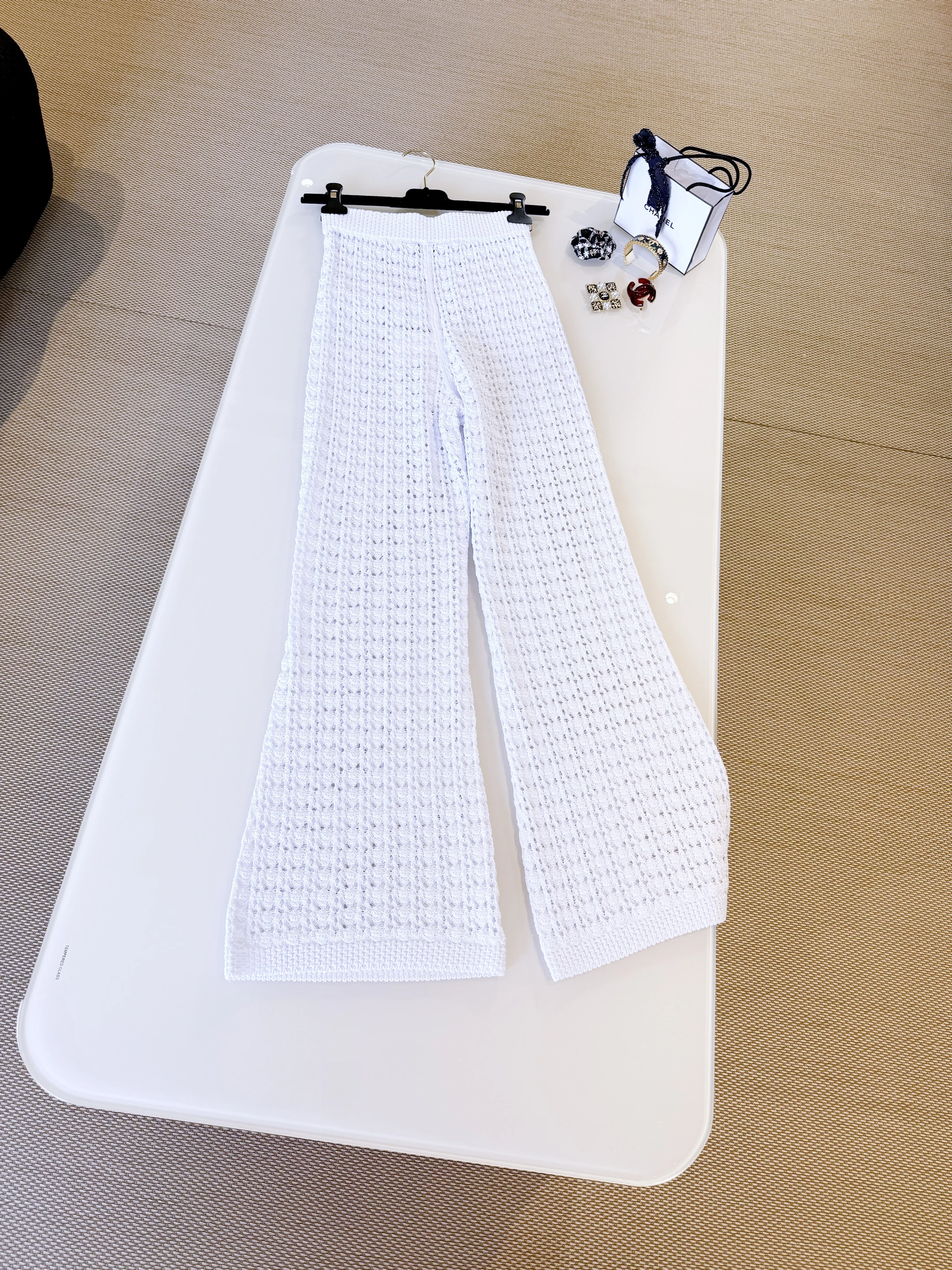 Элегантные женские брюки CHANEL в ажурной вязаной технике — легкая, воздушная модель с высокой талией и выразительным расклешением. Изысканный белый оттенок и аккуратная отделка создают непринужденный, но утончённый образ для тёплого сезона и вечера в стиле «шик с легкостью».