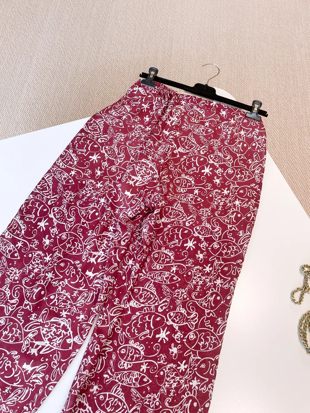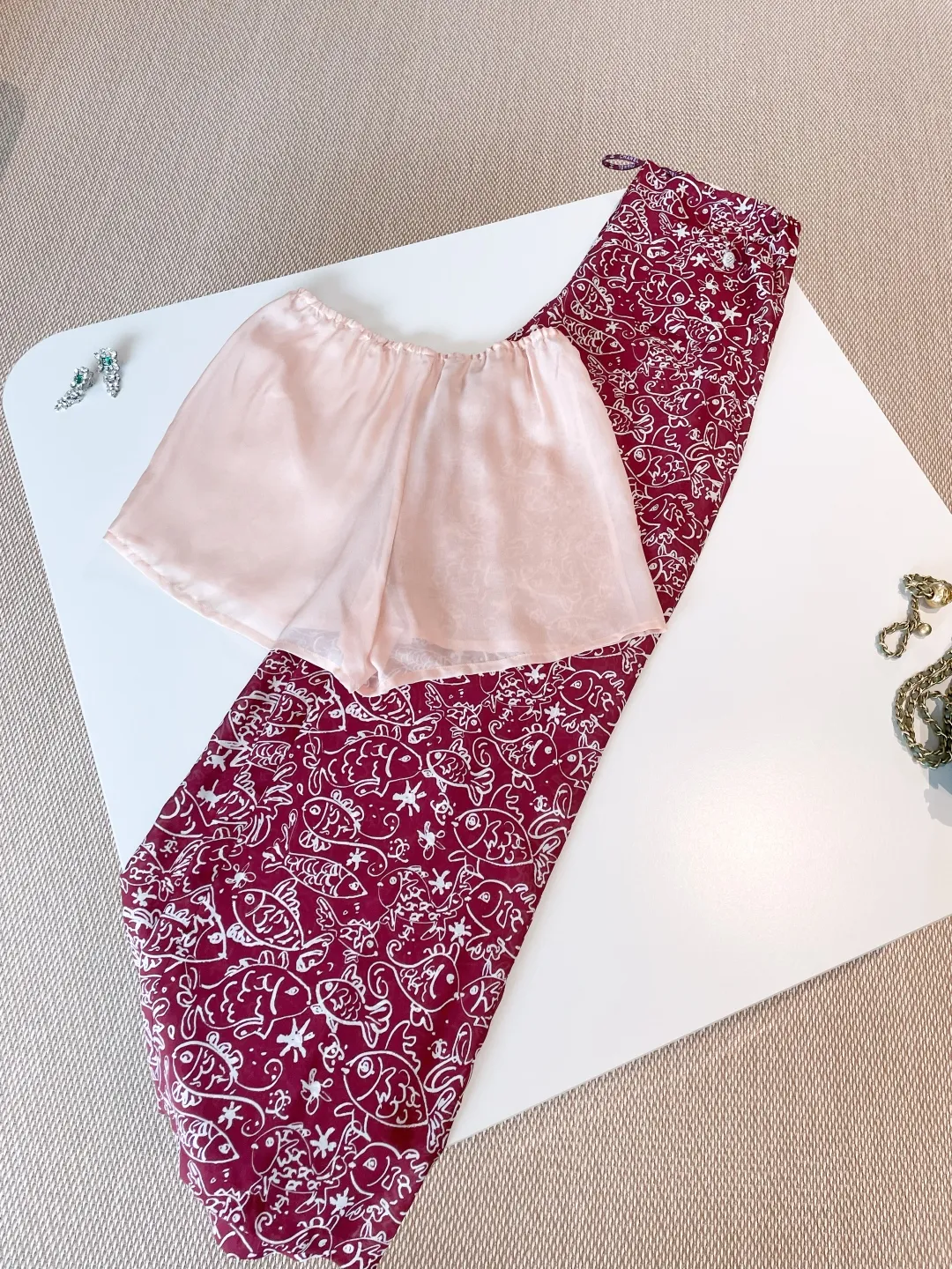 Погрузитесь в мир изысканного комфорта с этим уникальным комплектом из двух предметов 25. Изготовленный из шелка высшего качества с авторским рыбным принтом, расписанным вручную, этот комплект обладает неповторимым шармом. Мягкий, струящийся крой обеспечивает свободу движений, а невесомая ткань дарит ощущение нежности на коже.