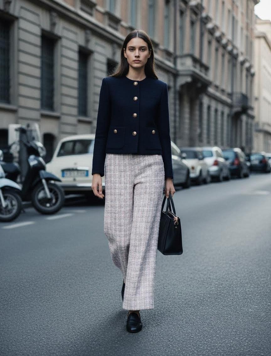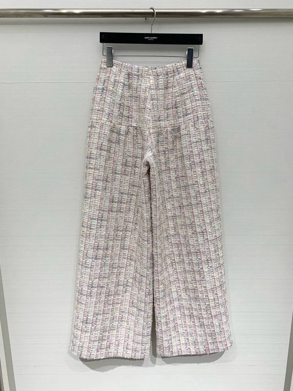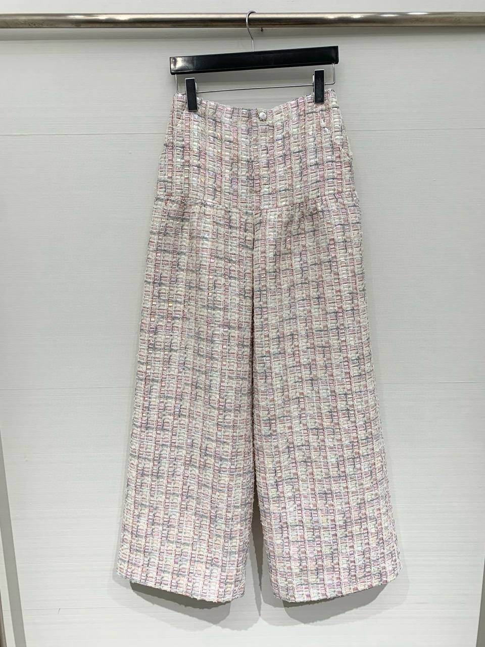 Элегантные брюки-кулоты из плотного твида с выраженной текстурой и мягкой пастельной палитрой. Высокая посадка и широкий укороченный силуэт создают модный, в то же время женственный образ — идеальны для повседневного офиса и городских выходов.