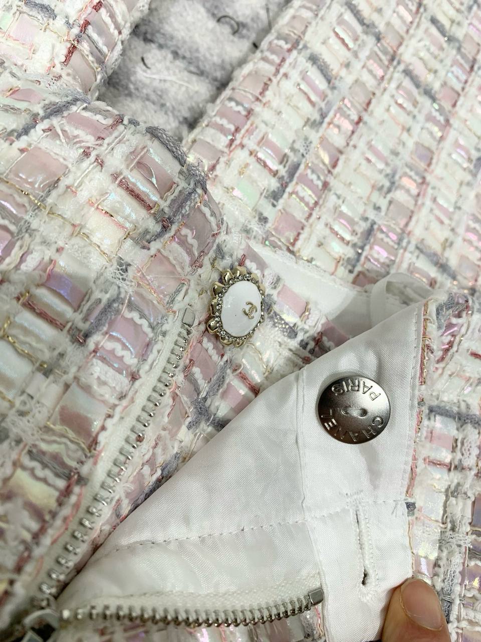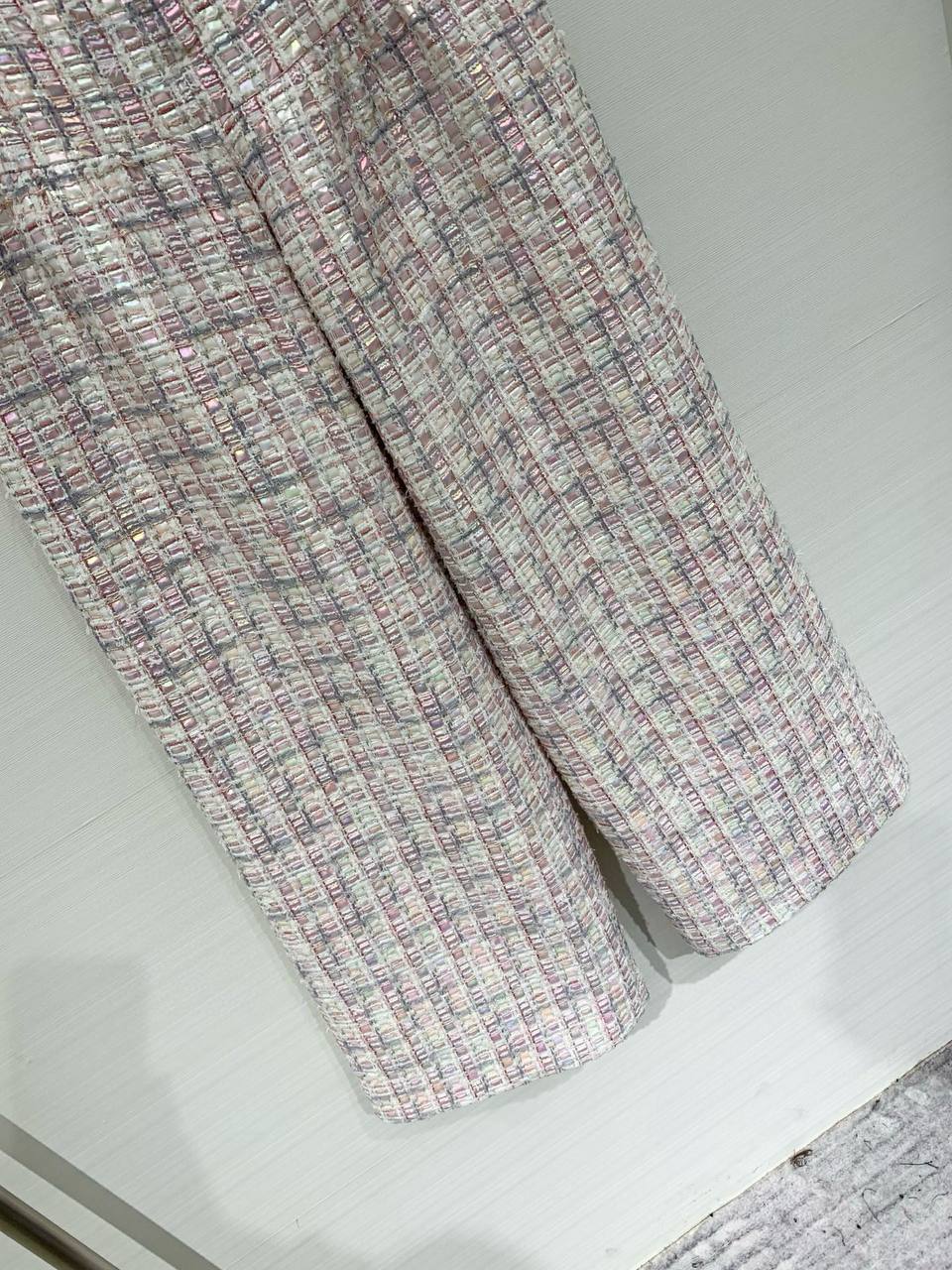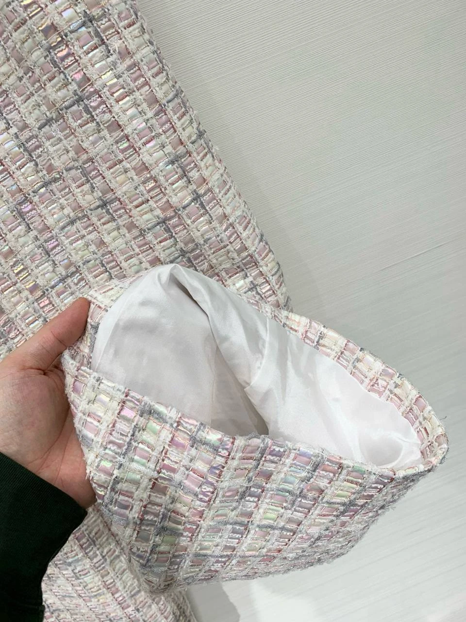 • Материал и фактура: плотный твид/букле с видимой фактурной клеткой, в которой переплетены белые и пастельные нити. Ткань придаёт изделию структуру и лёгкий визуальный объём.