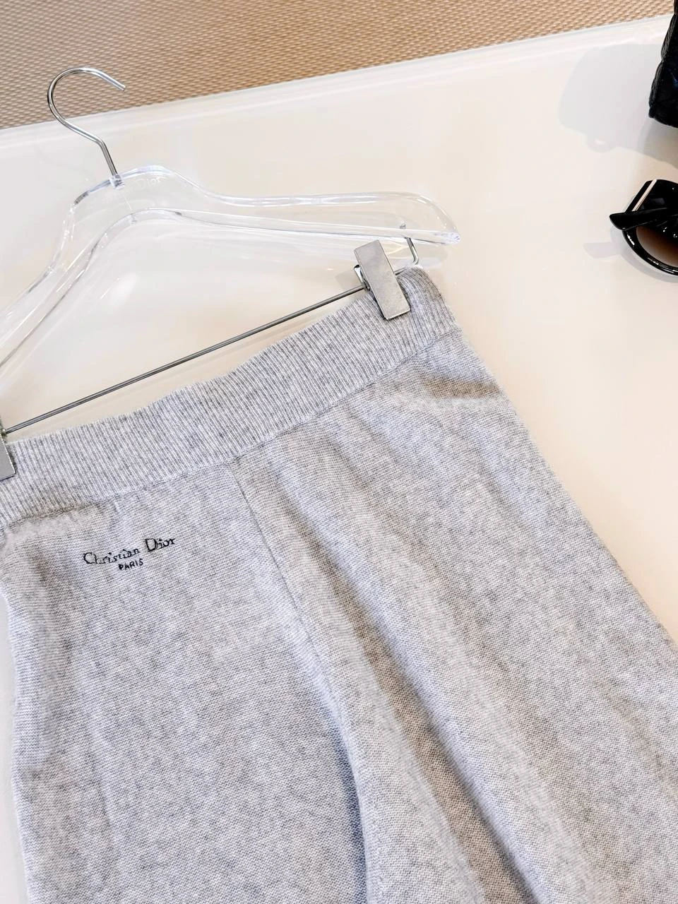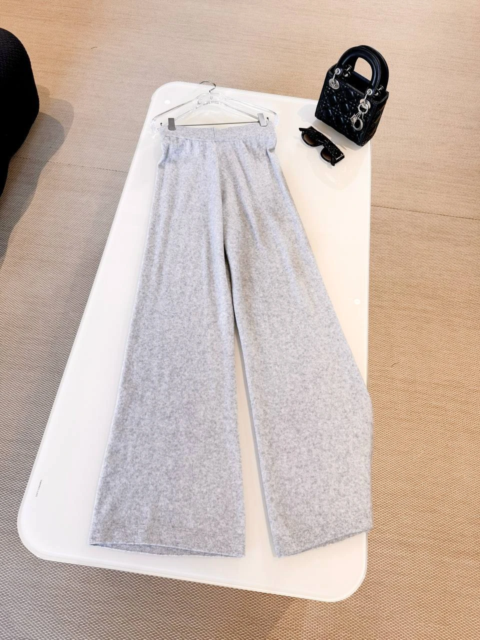 Элегантные широкие брюки из мягкого вязаного трикотажа светло‑серого оттенка. Высокая линия талии с эластичным поясом, расслабленный палаццо‑силуэт и минималистичная отделка делают модель идеальной для образов в стиле «casual‑luxury» и для комфортной городской повседневности.