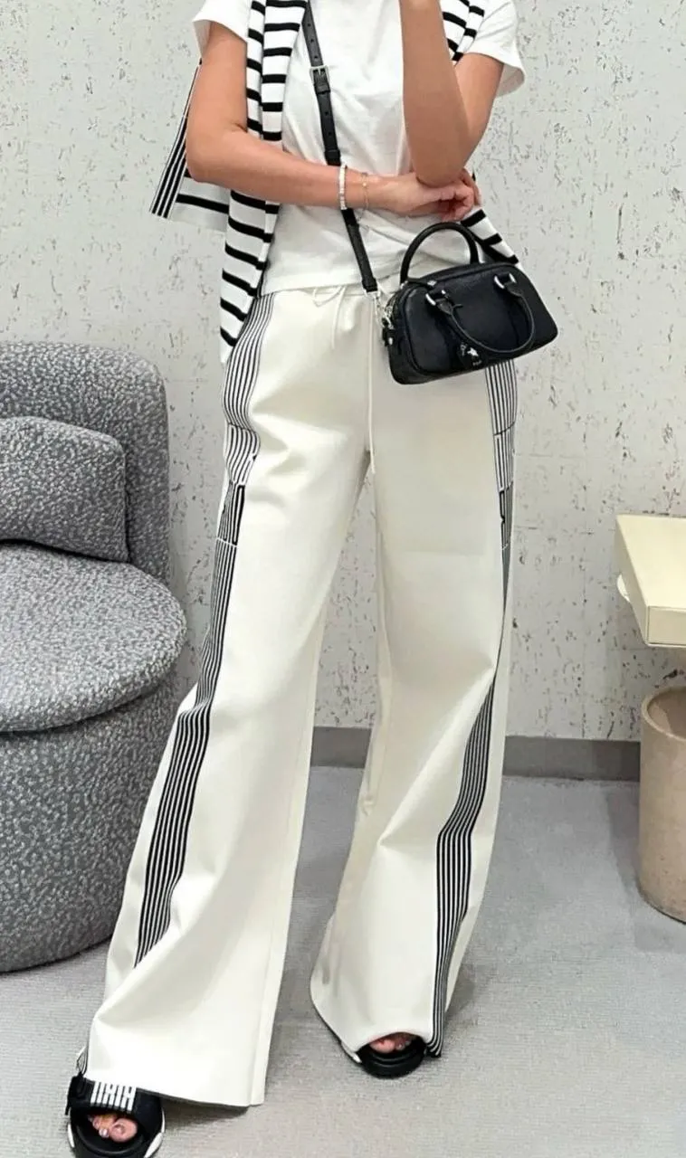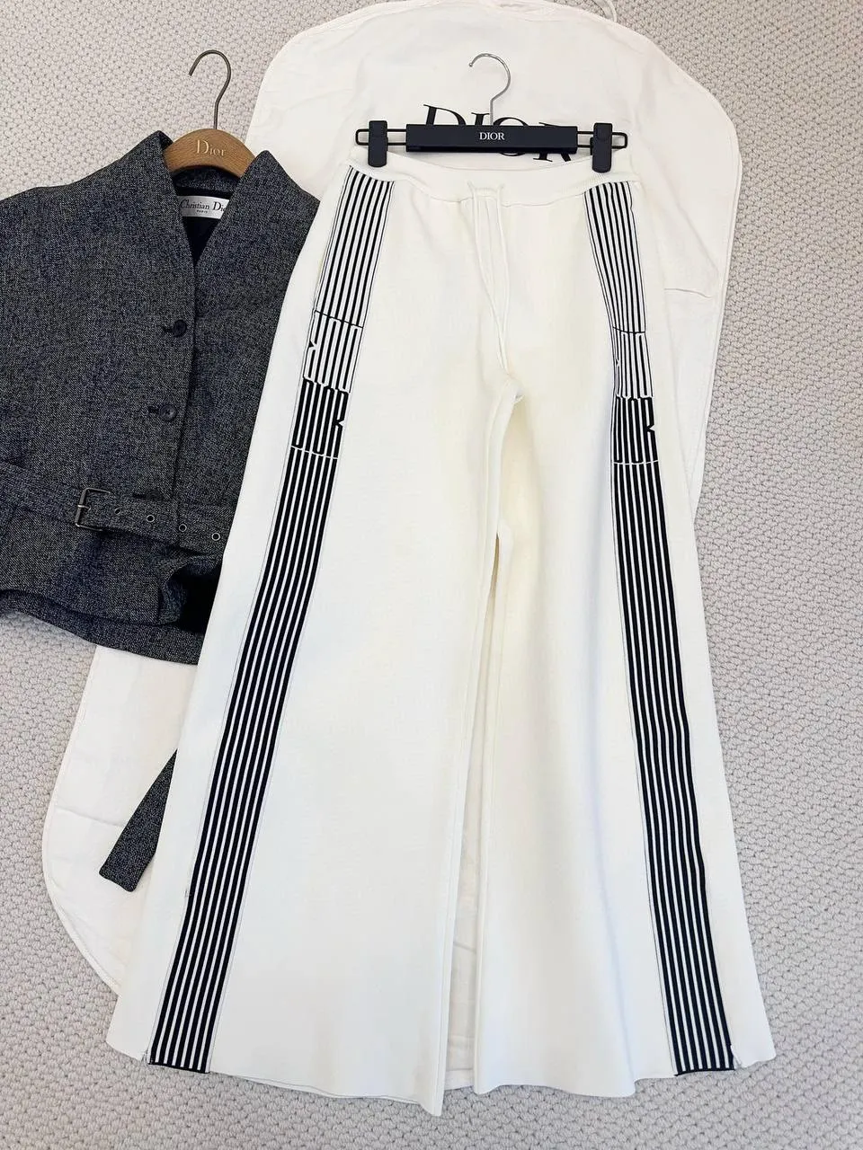 Новые широкие спортивные брюки Dior 2025 визуально удлиняют ноги и создают стройный силуэт. Изюминка модели - геометрические буквы Dior по бокам, создающие эффект утягивающих штанин. Брюки украшены стильным черным жаккардовым узором в полоску Dior Graphique. Комфорт и удобство обеспечивают эластичная талия на шнурке и практичные боковые карманы. Легко сочетаются с элегантными пиджаками, создавая смелый и ультрамодный образ в духе подиумных показов.