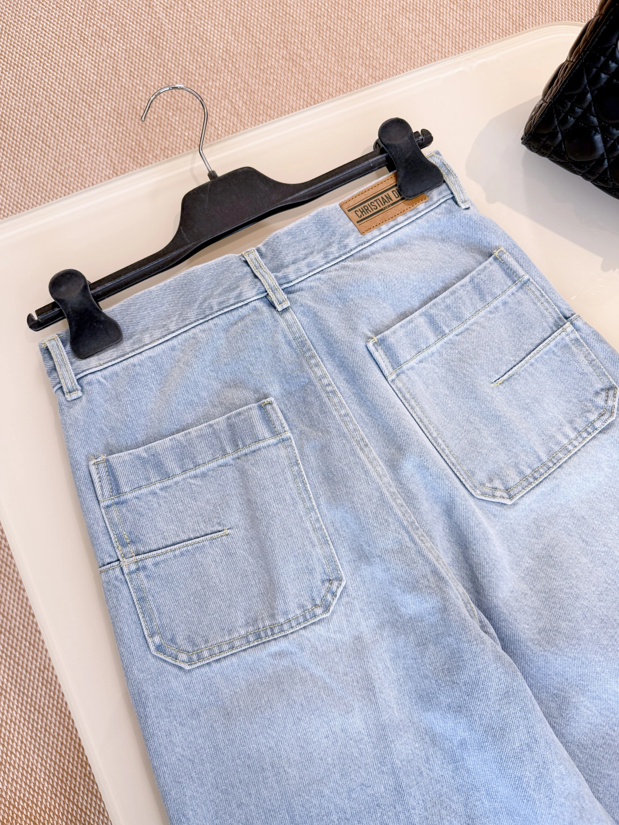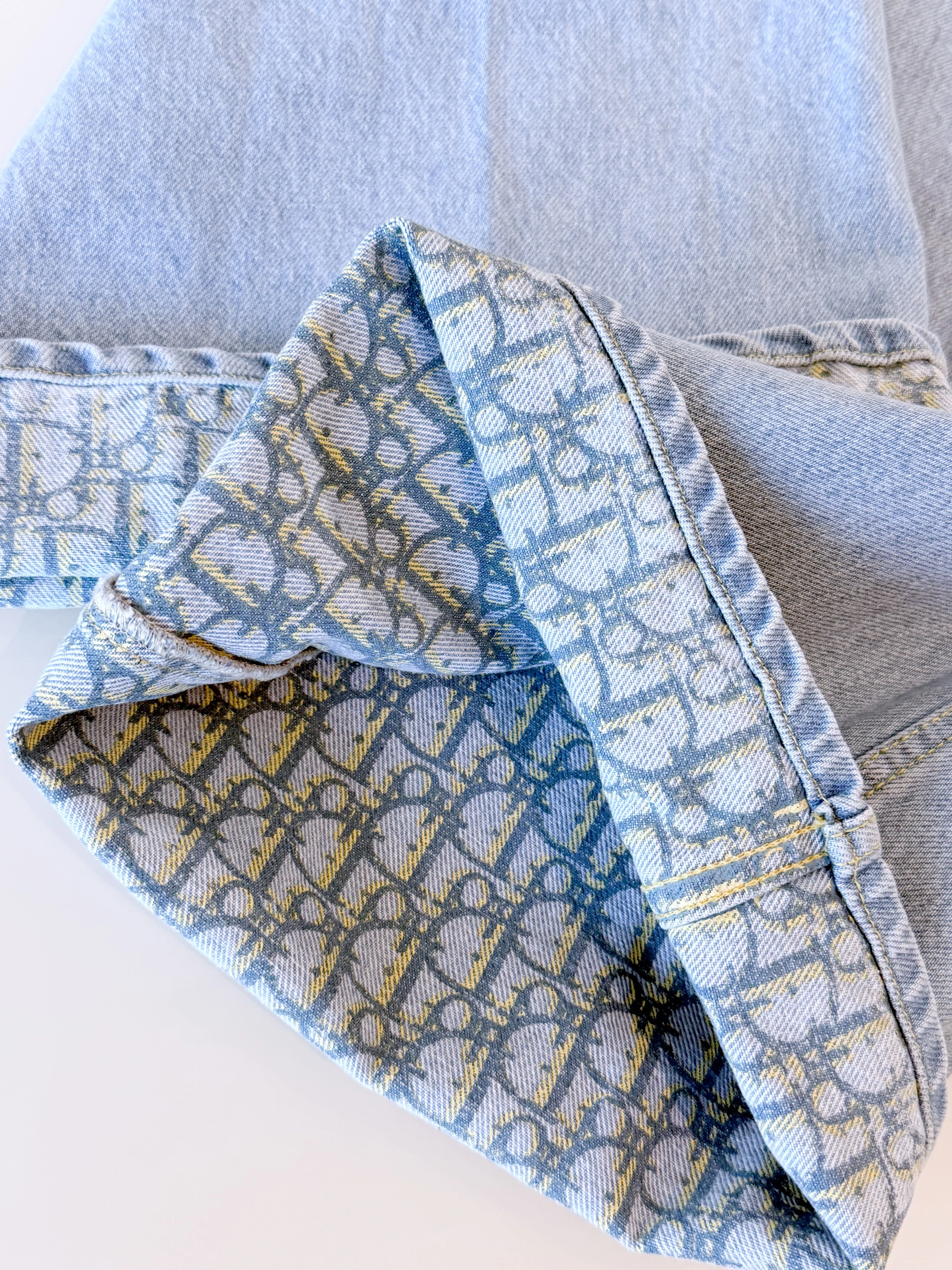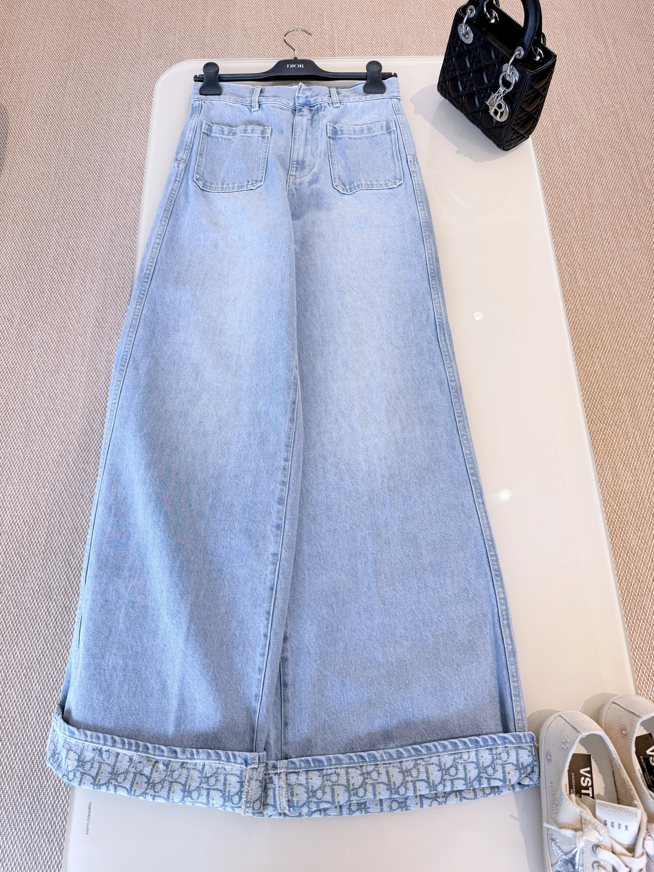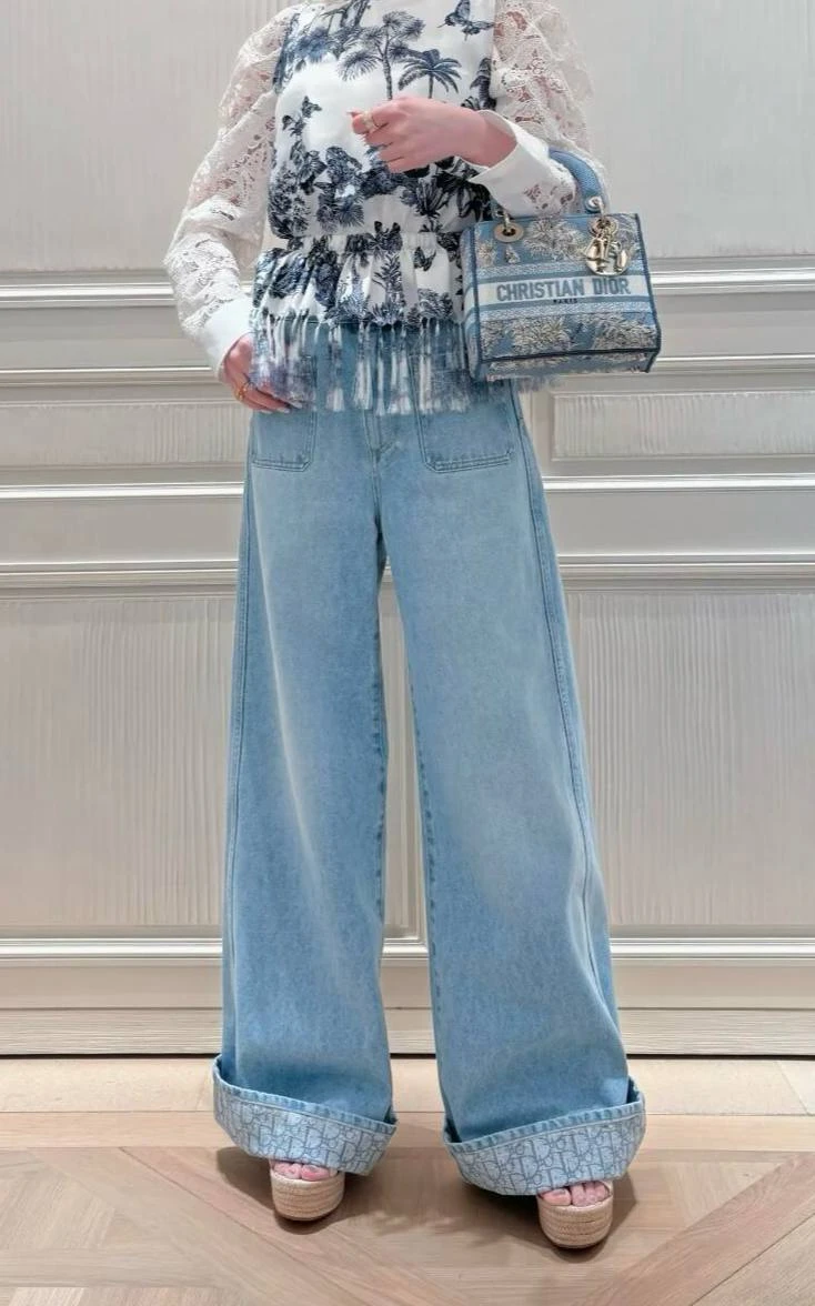 Эти стильные брюки от Christian Dior выполнены из высококачественного хлопка в светло-голубом оттенке денима. Модель отличается свободным кроем, прямыми широкими штанинами и высокой посадкой, благодаря чему обеспечивает максимальный комфорт и элегантный силуэт. На задней стороне расположены два накладных кармана, а по подвороту брюк — фирменный узор Dior, который добавляет изысканный акцент и подчеркивает эксклюзивность изделия. Брюки идеально сочетаются как с повседневными образами, так и с более элегантными комплектами.