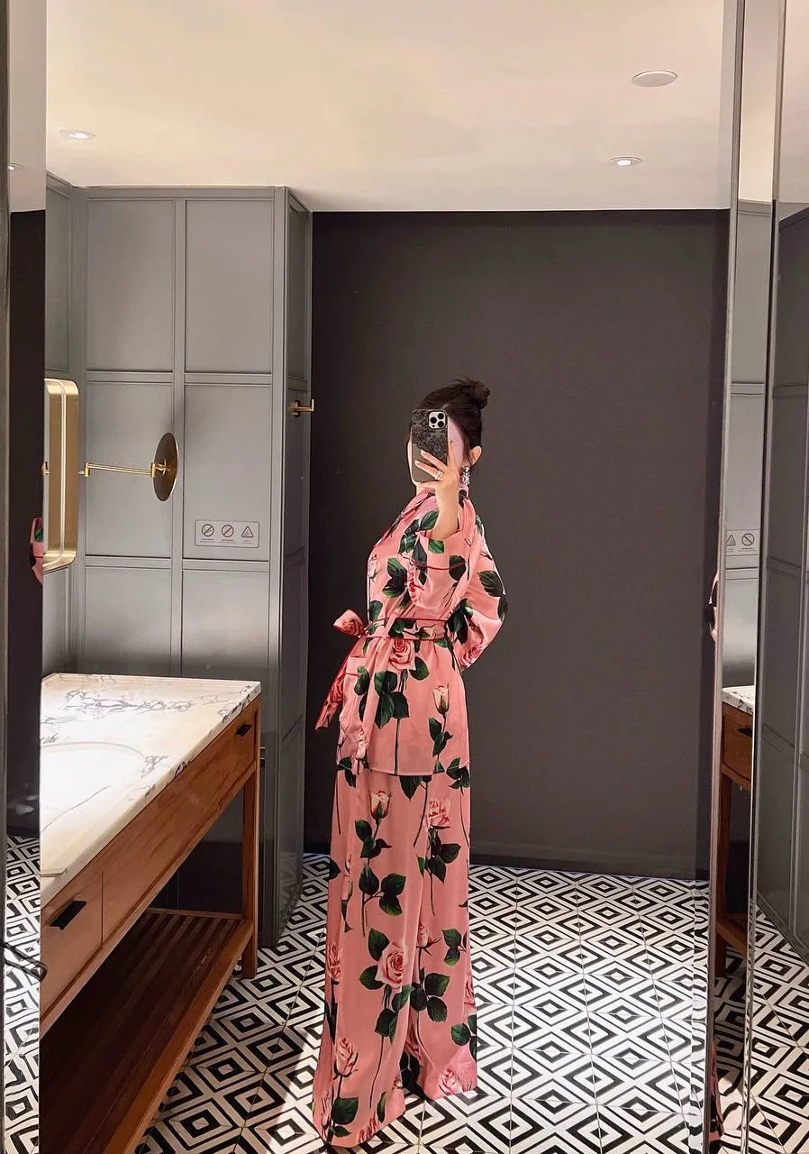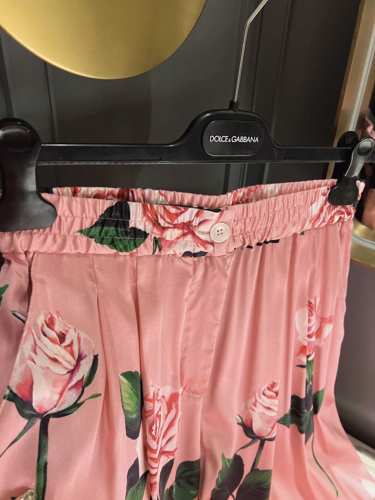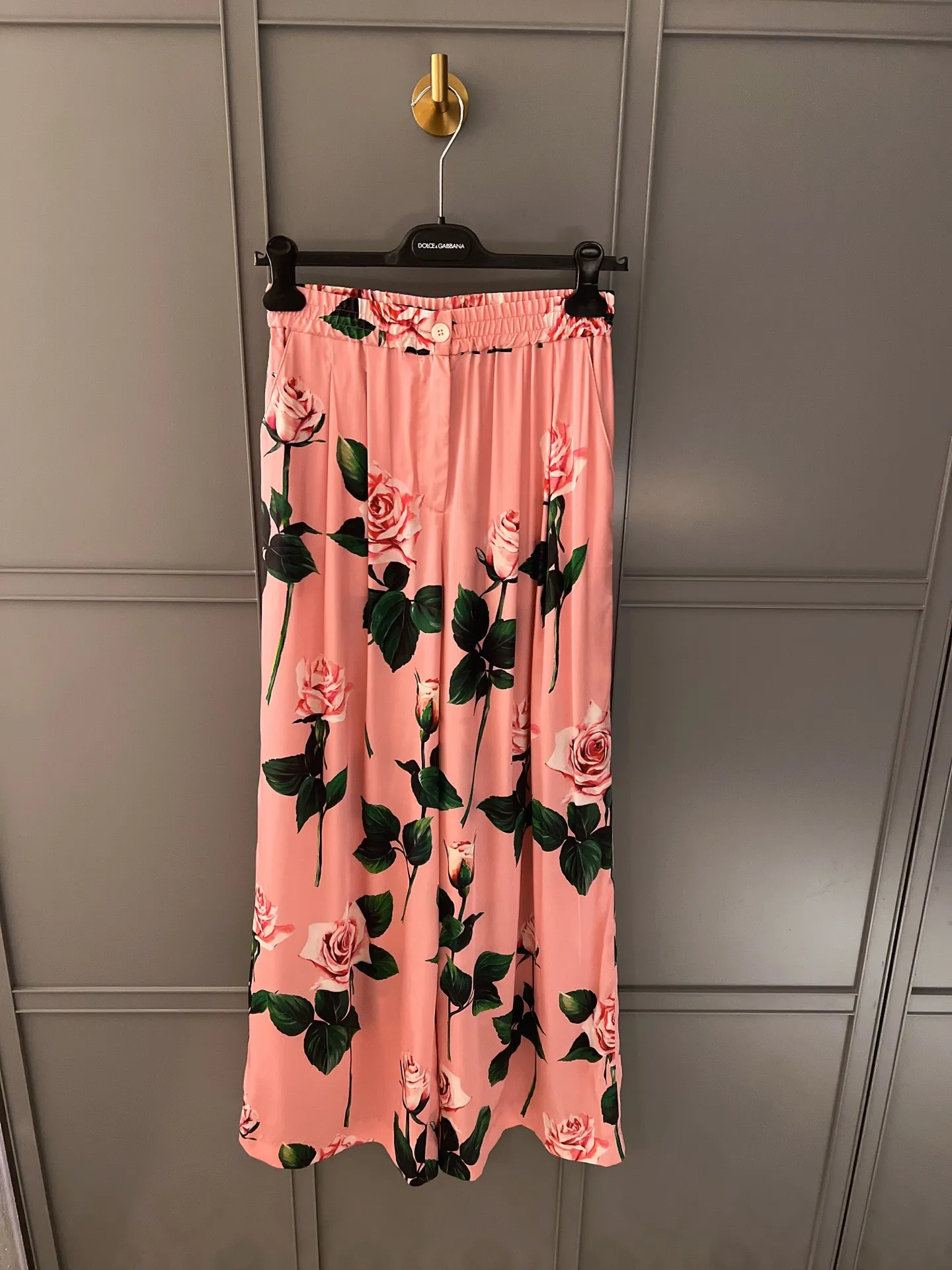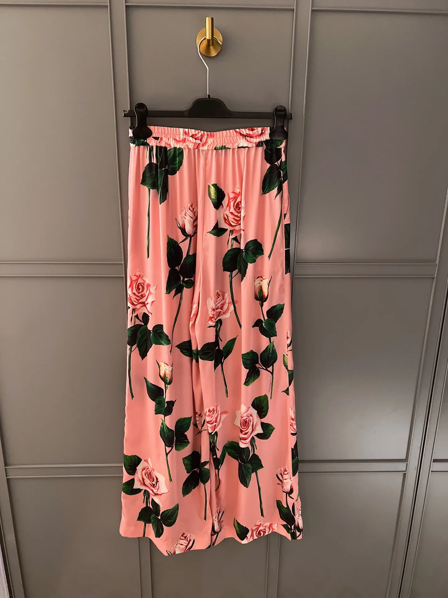 Эти шелковые атласные брюки нежно-розового оттенка с изысканным принтом роз окутают вас мягким прикосновением и подарят ощущение роскоши. Легкий, струящийся силуэт идеально подходит для создания элегантных и непринужденных образов.