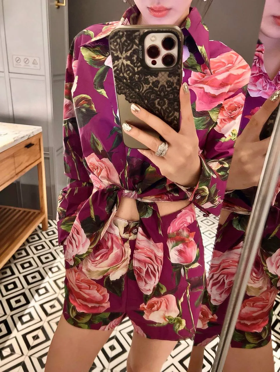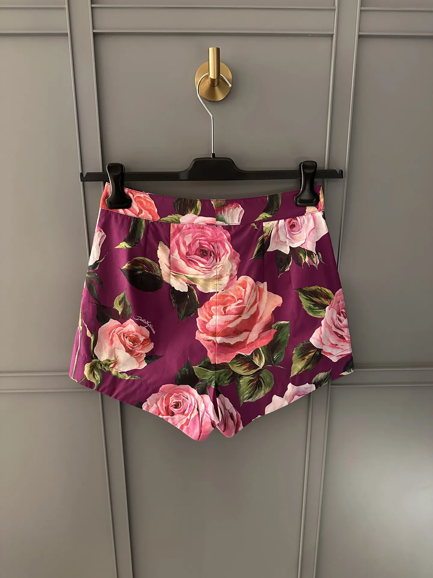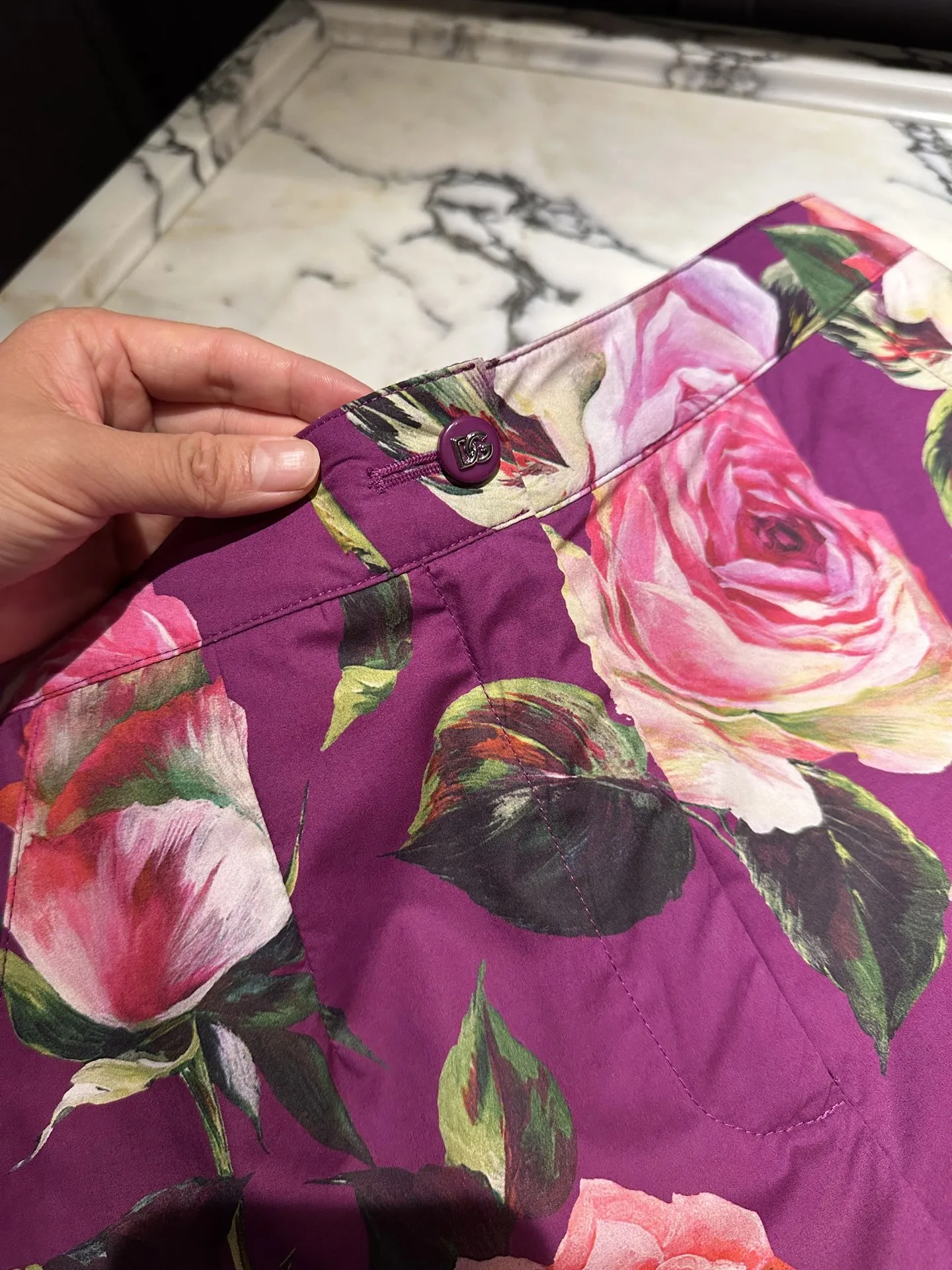 Шорты Dolce & Gabbana, выполненные из хлопка, представляют собой стильный и яркий элемент гардероба. Их характерным украшением являются крупные цветочные принты с розами на фиолетовом фоне, что придаёт им романтичный и жизнерадостный вид. Такие шорты идеально подойдут для летних прогулок, пляжного отдыха или расслабленного времяпрепровождения. Комбинируйте их с простым топом или блузой, чтобы создать модный и стильный образ.