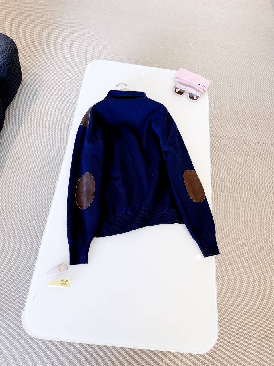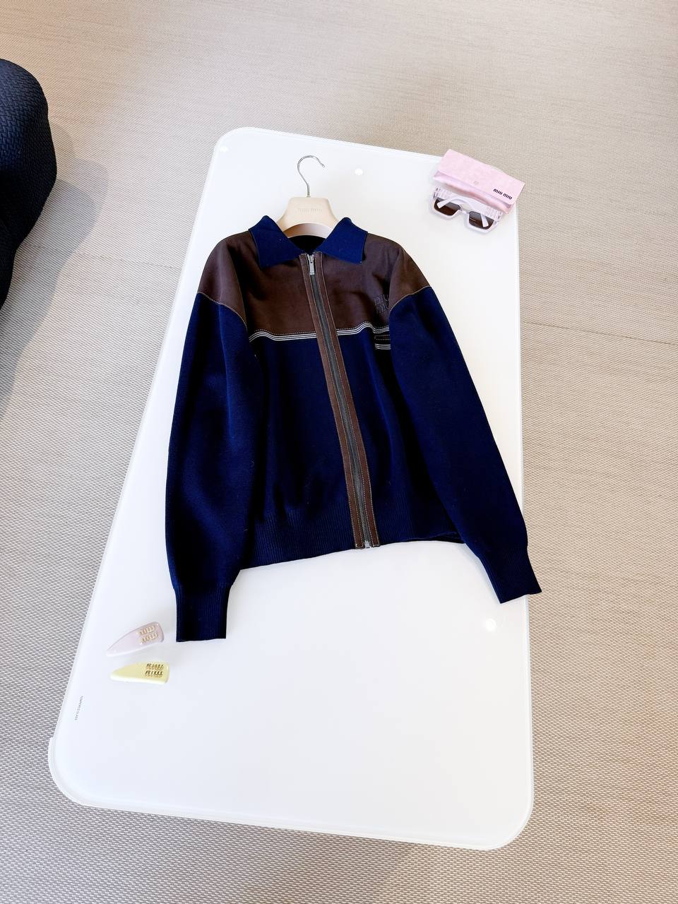 Стильная двуфактурная толстовка MIU MIU на центральной металлической молнии. По фото — лаконичный женственный силуэт с рубчатой манжетой и поясом, контрастной верхней кокеткой и аккуратным воротником‑рубашкой. Идеальный вариант для городских образов в межсезонье.