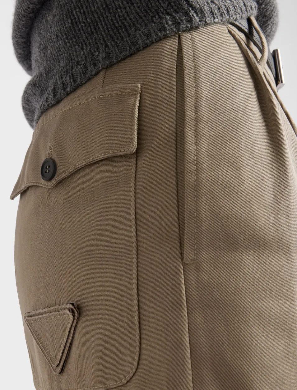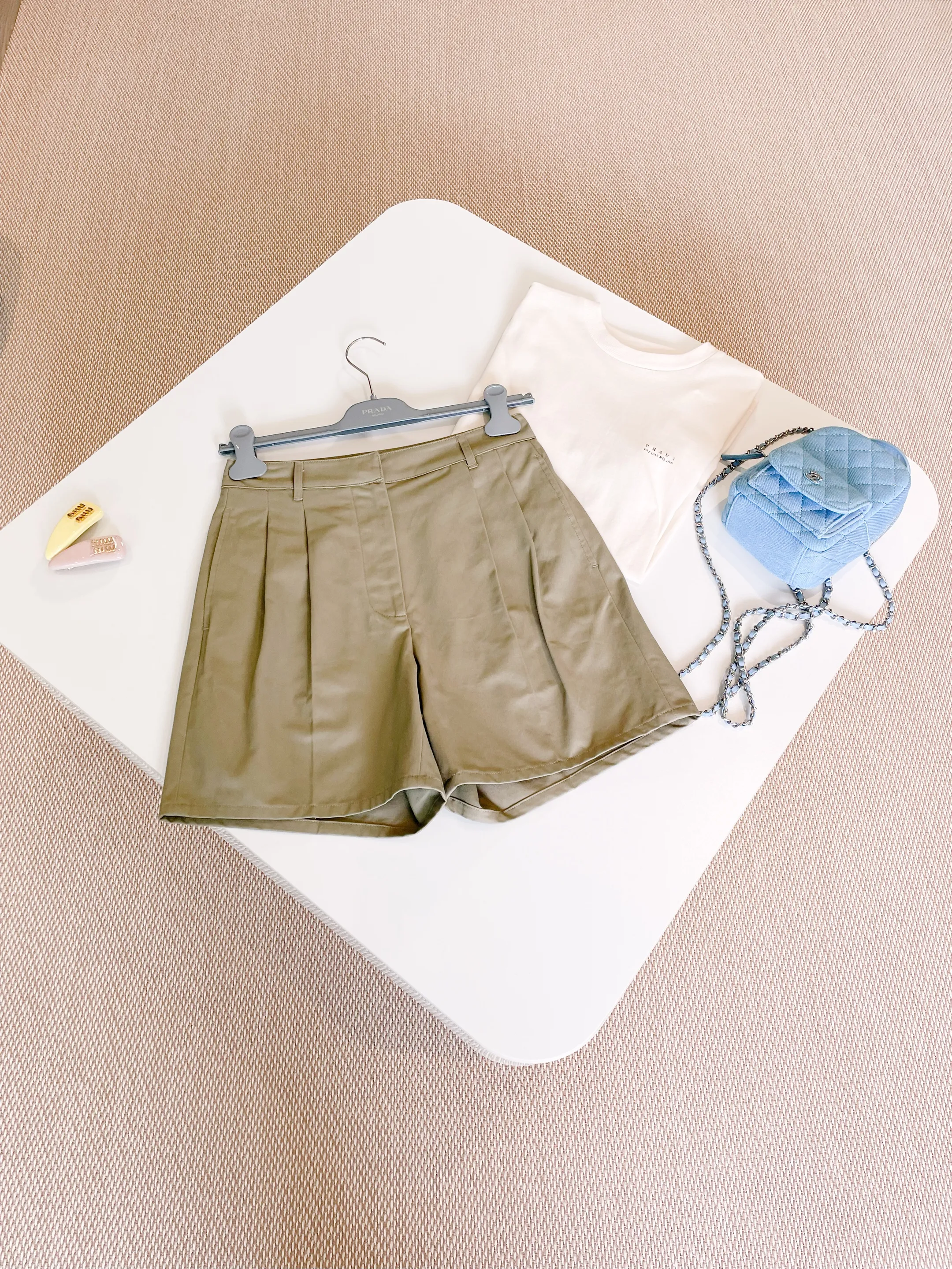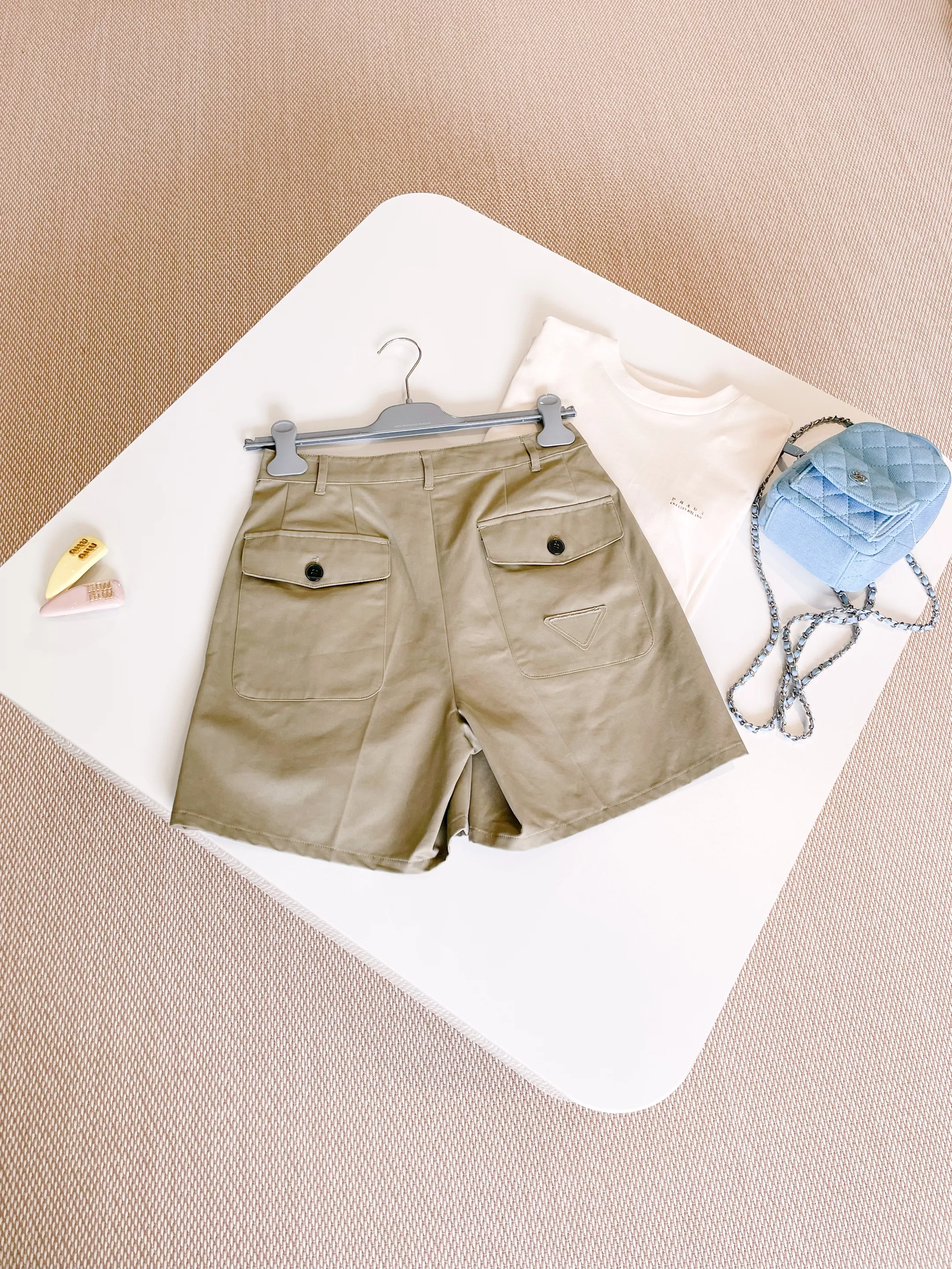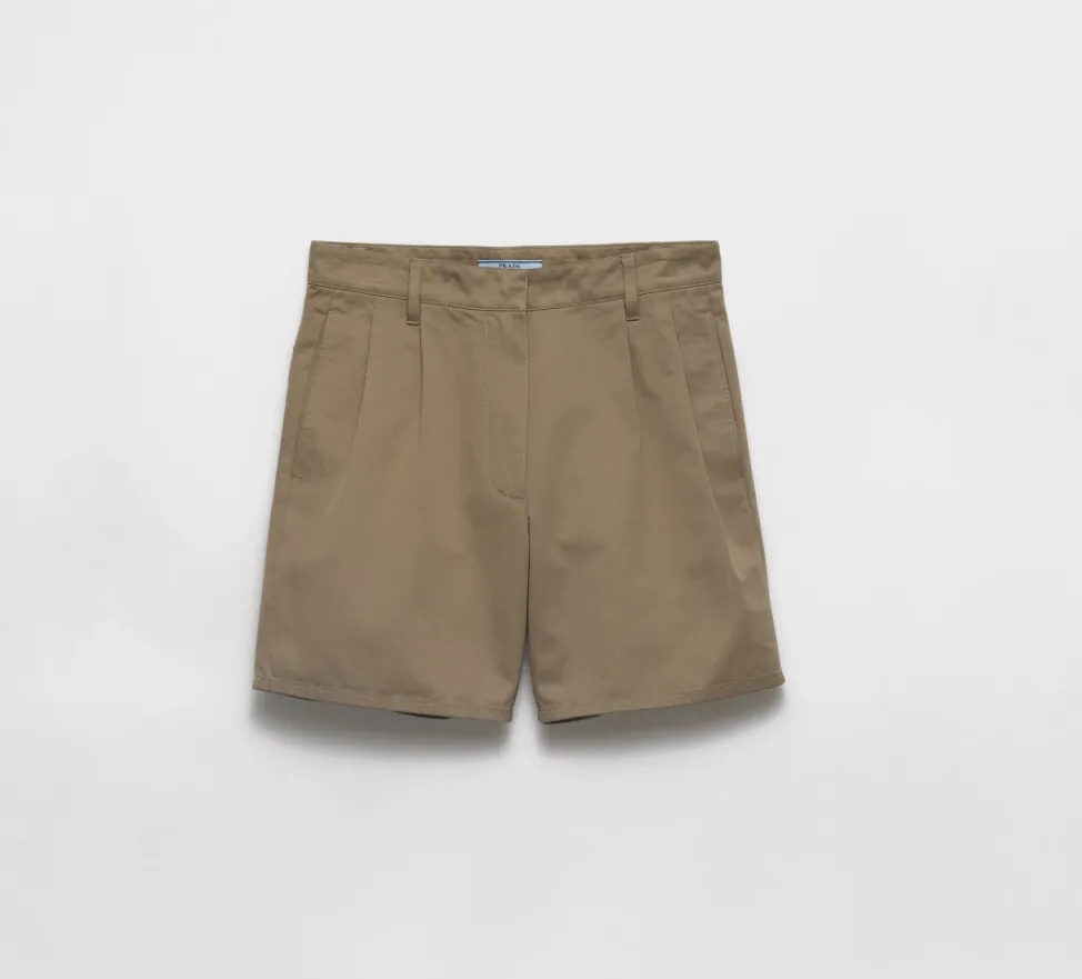 Шорты от Prada, выполненные из высококачественного хлопка, идеально подойдут для создания стильного и комфортного образа. Классический крой с зауженной талией и легкими складками придаёт им элегантность, а нейтральный песочный цвет позволяет легко сочетать их с различными верхами и аксессуарами.