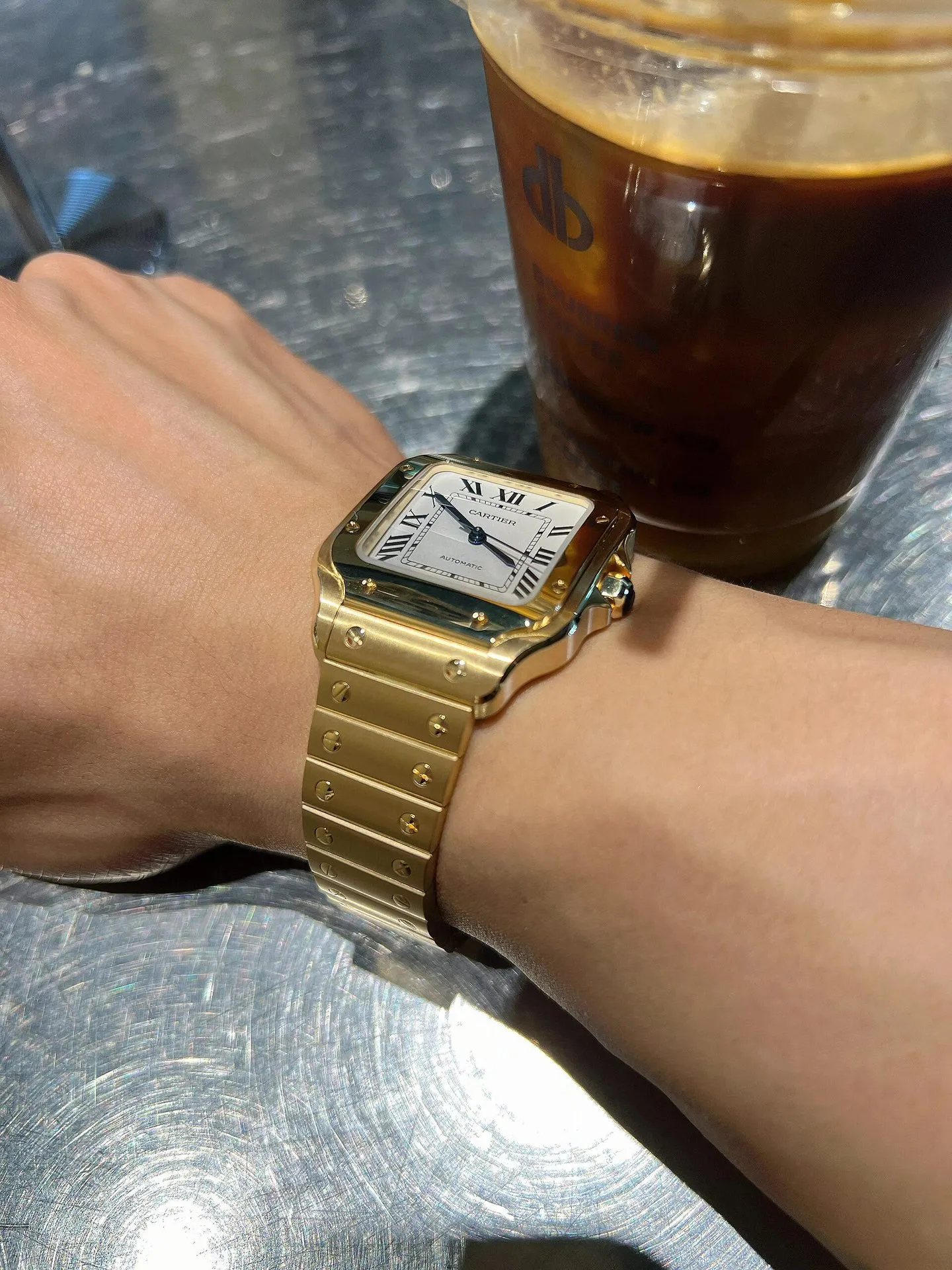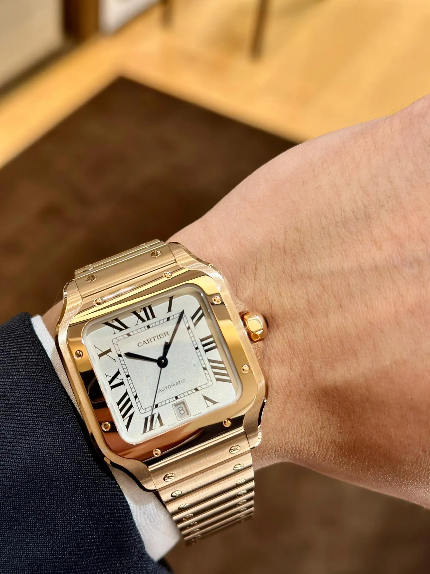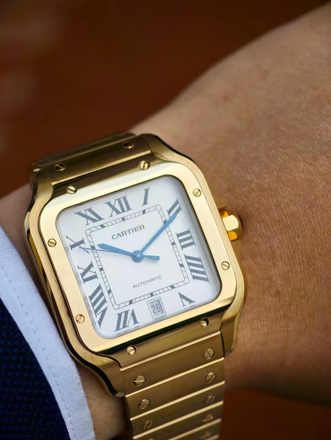 Циферблат имеет характерный для модели Santos дизайн с римскими цифрами и стрелками, которые обеспечивают отличную читаемость.