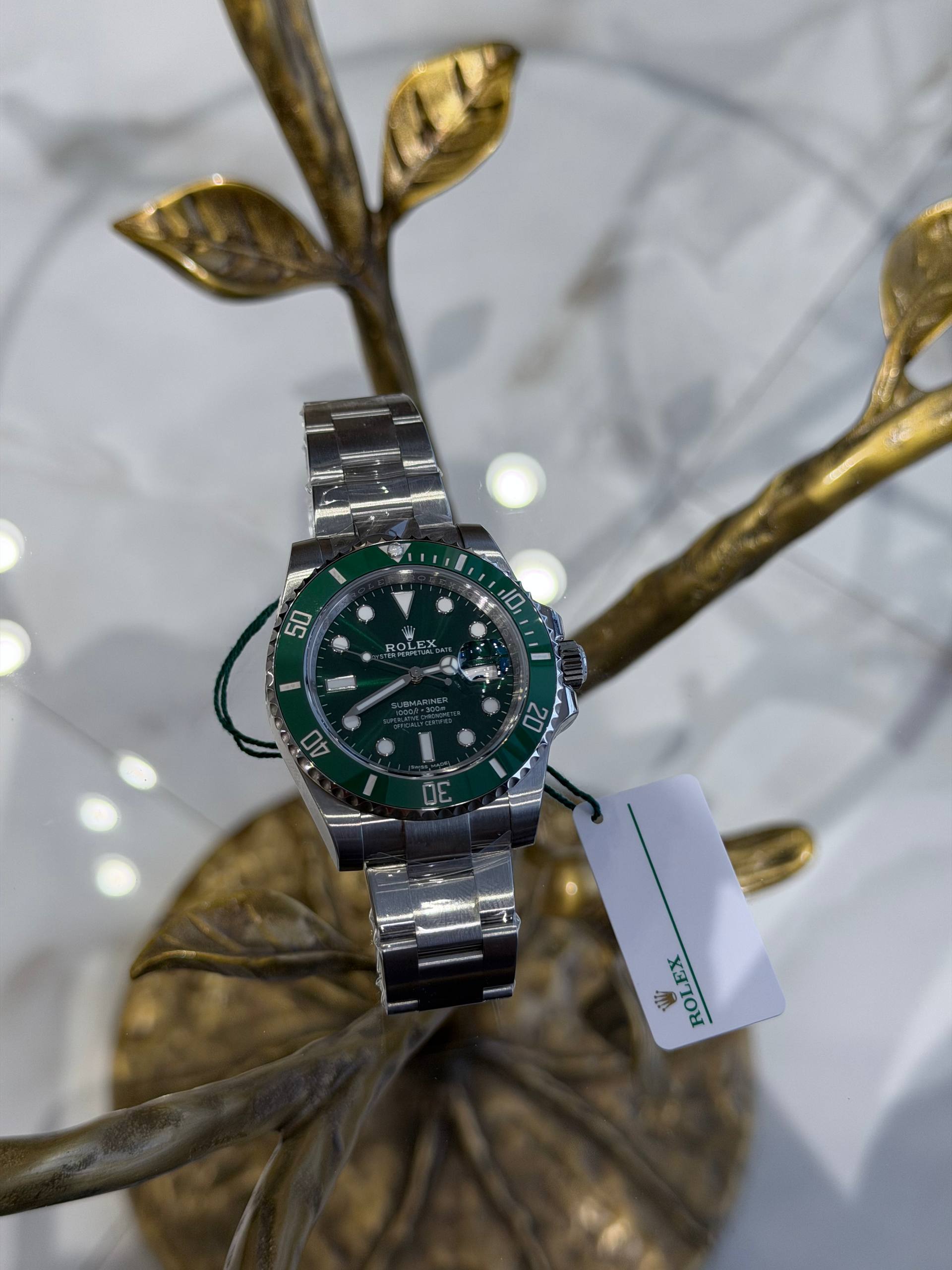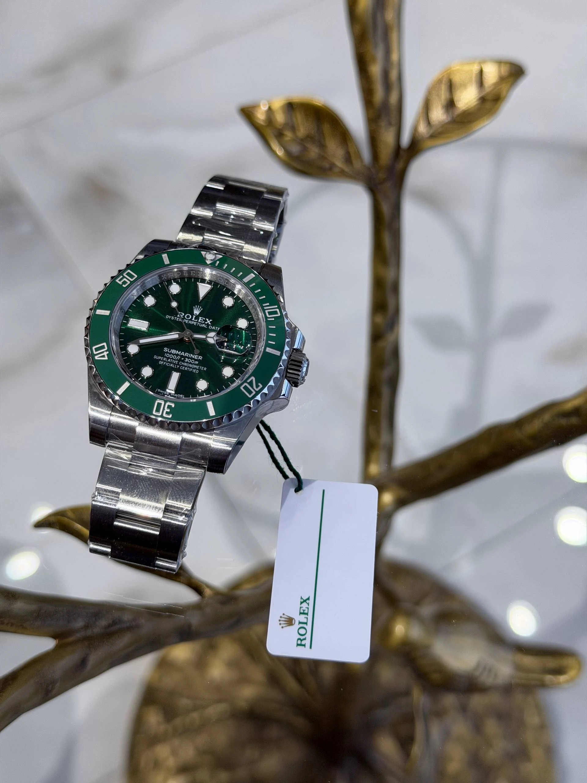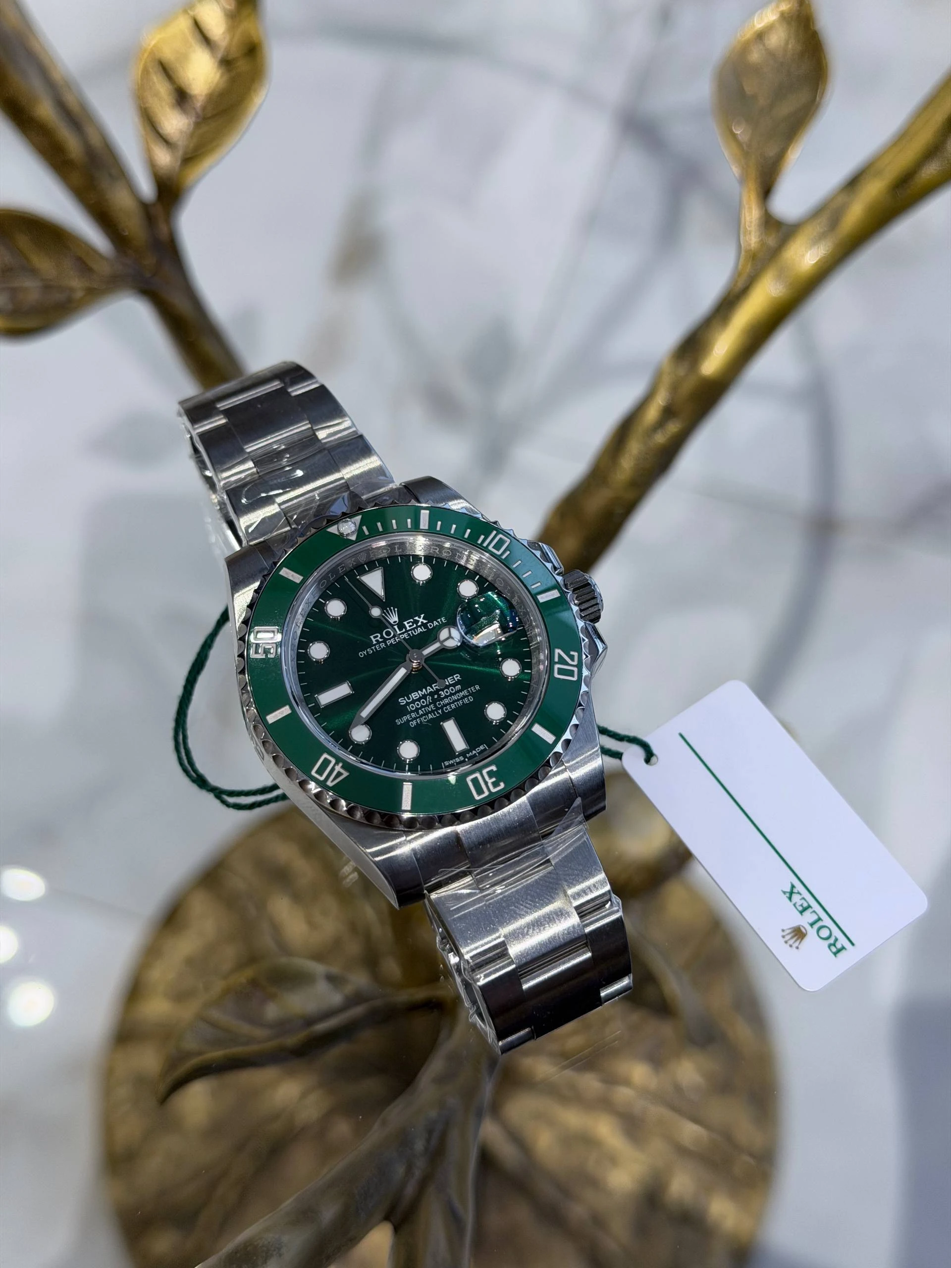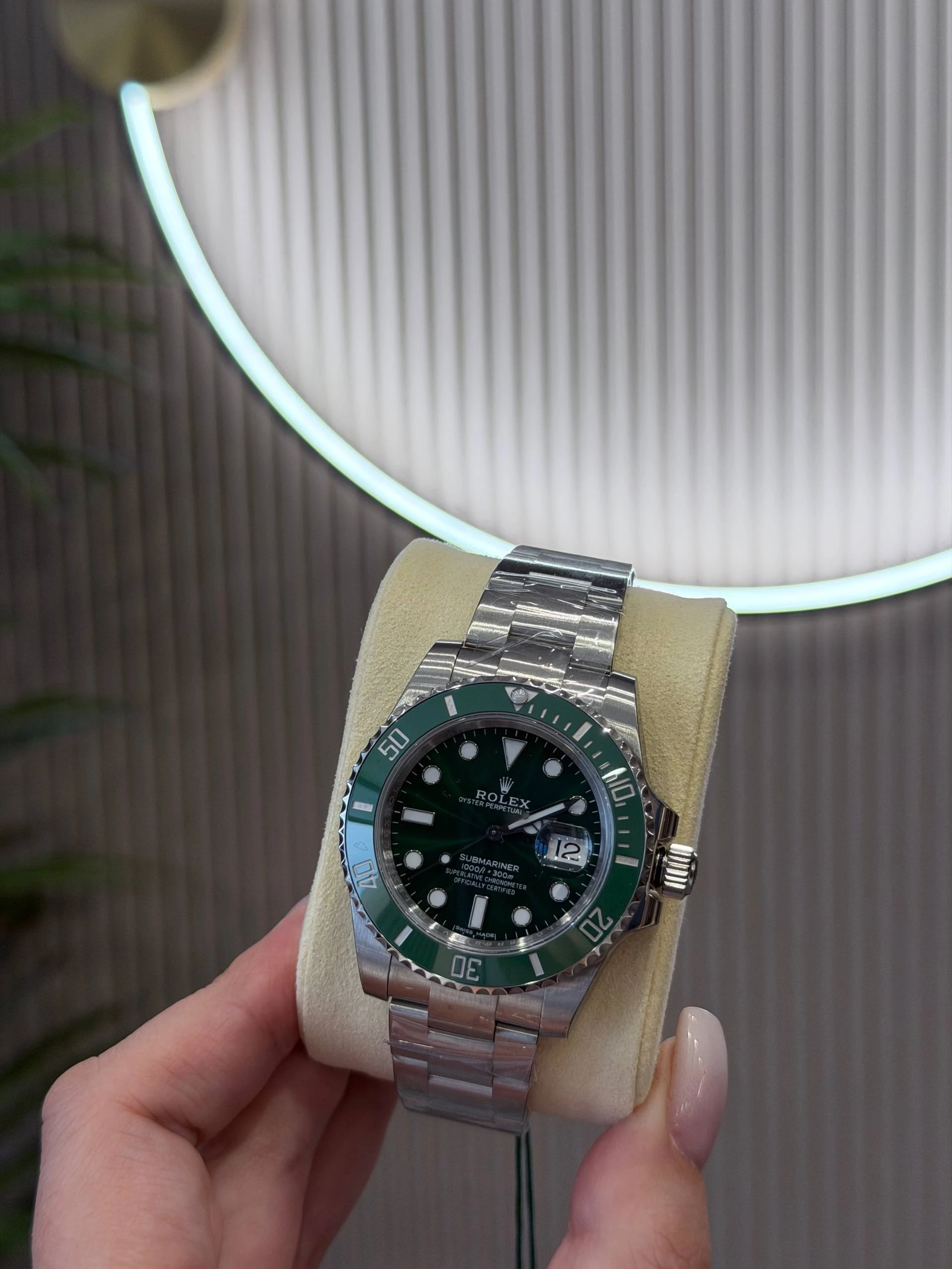 Модель Submariner 116610LV сочетает в себе легендарную надёжность профессионального дайверского хронометра и яркую, узнаваемую эстетику — глубокий зелёный циферблат и зелёный керамический безель создают эффектный контраст со стальным корпусом. Корпус диаметром 40 мм выполнен из высококоррозионно‑стойкой стали Oystersteel (904L) и сохранит блеск при активной эксплуатации. Безель Cerachrom устойчив к царапинам и выцветанию, а односторонний ход служит для безопасного контроля времени погружения.