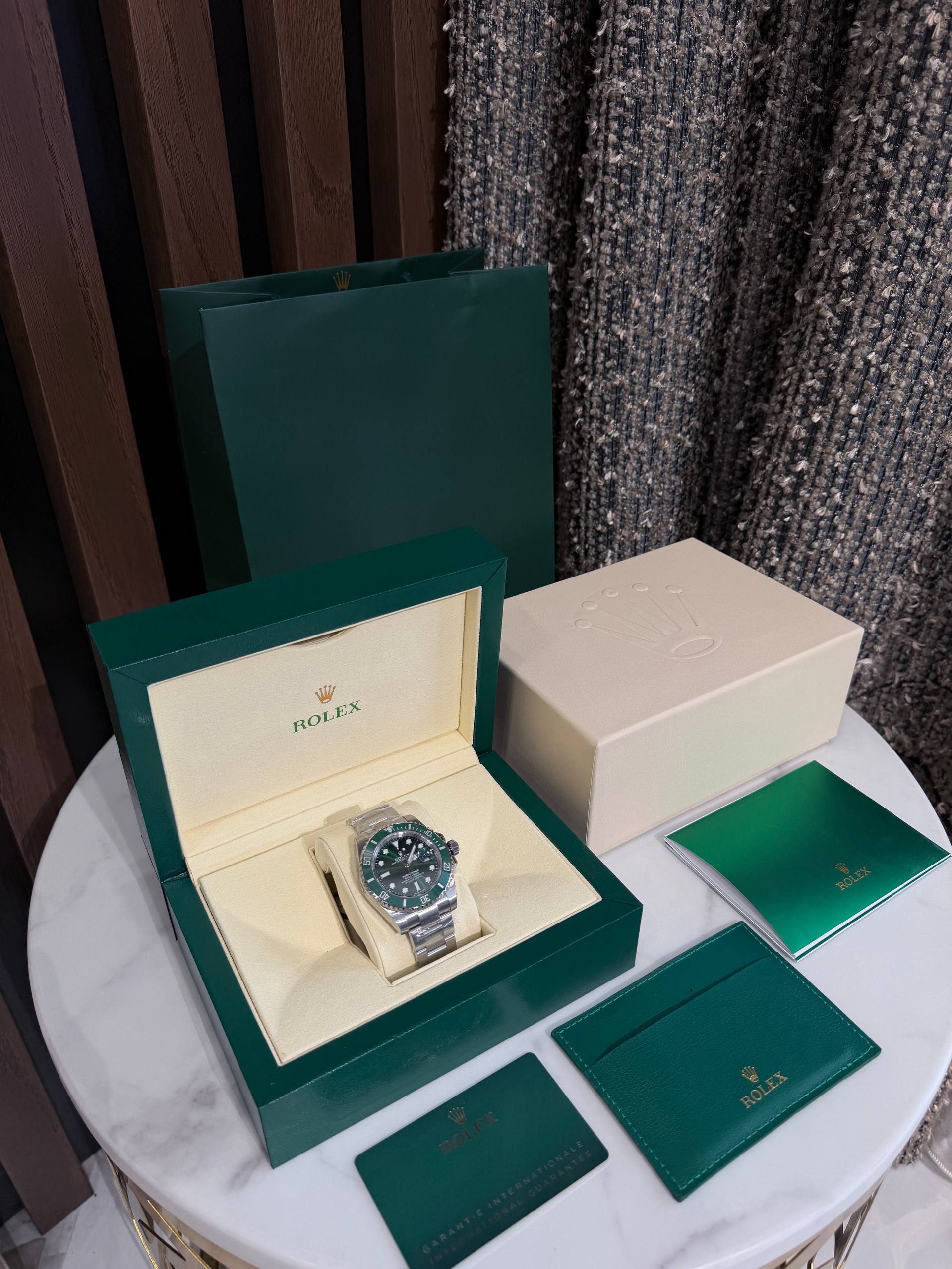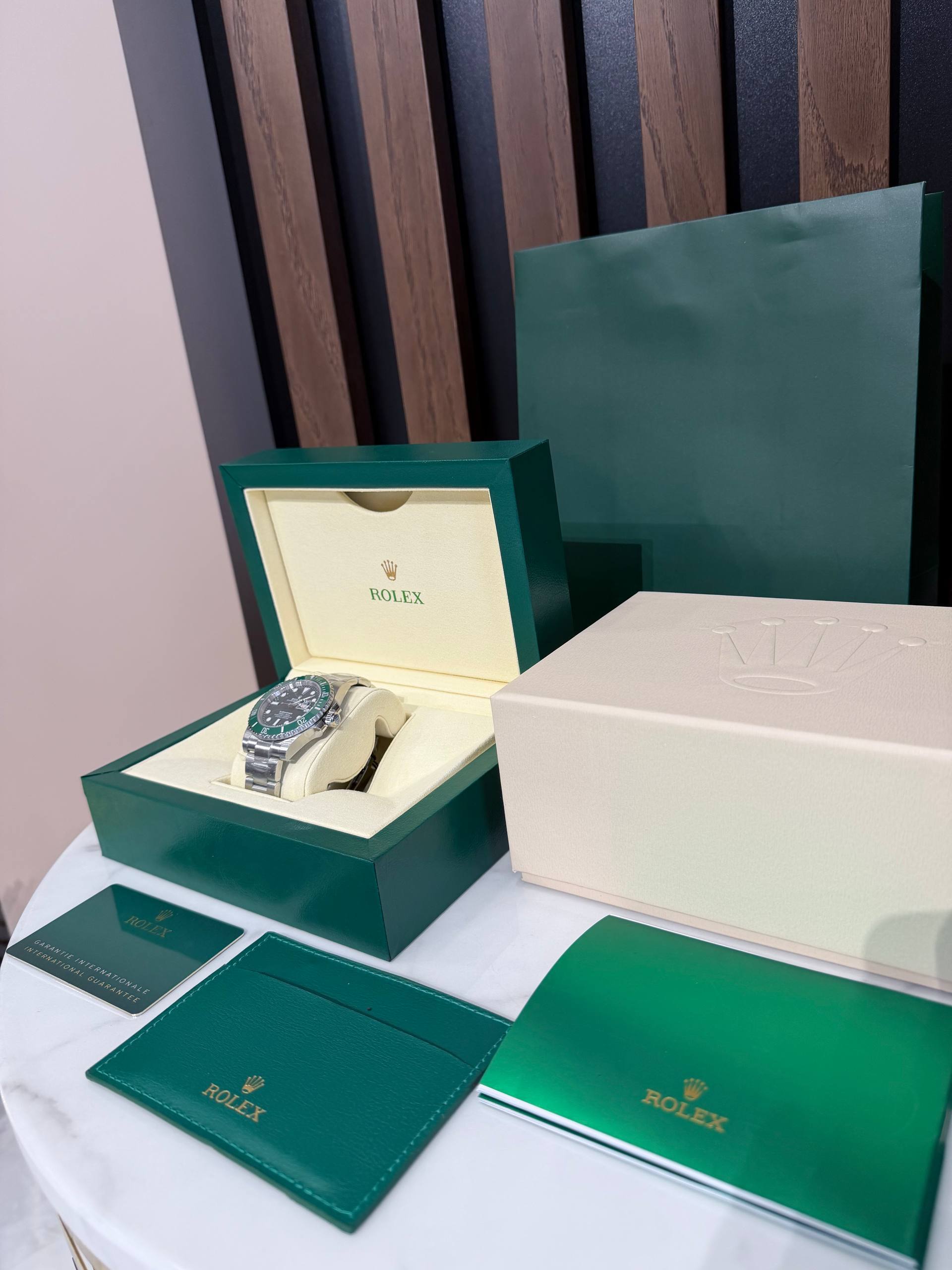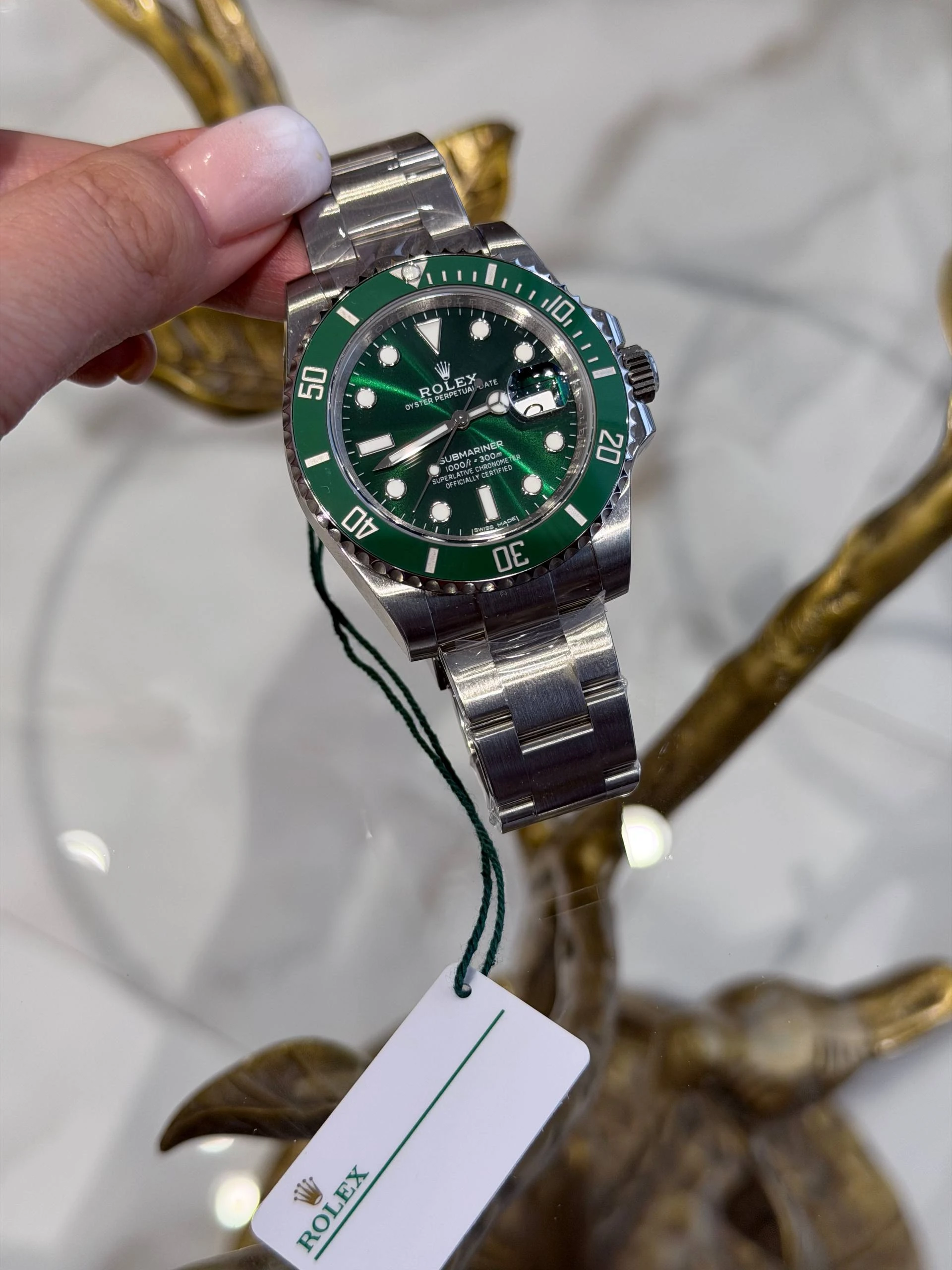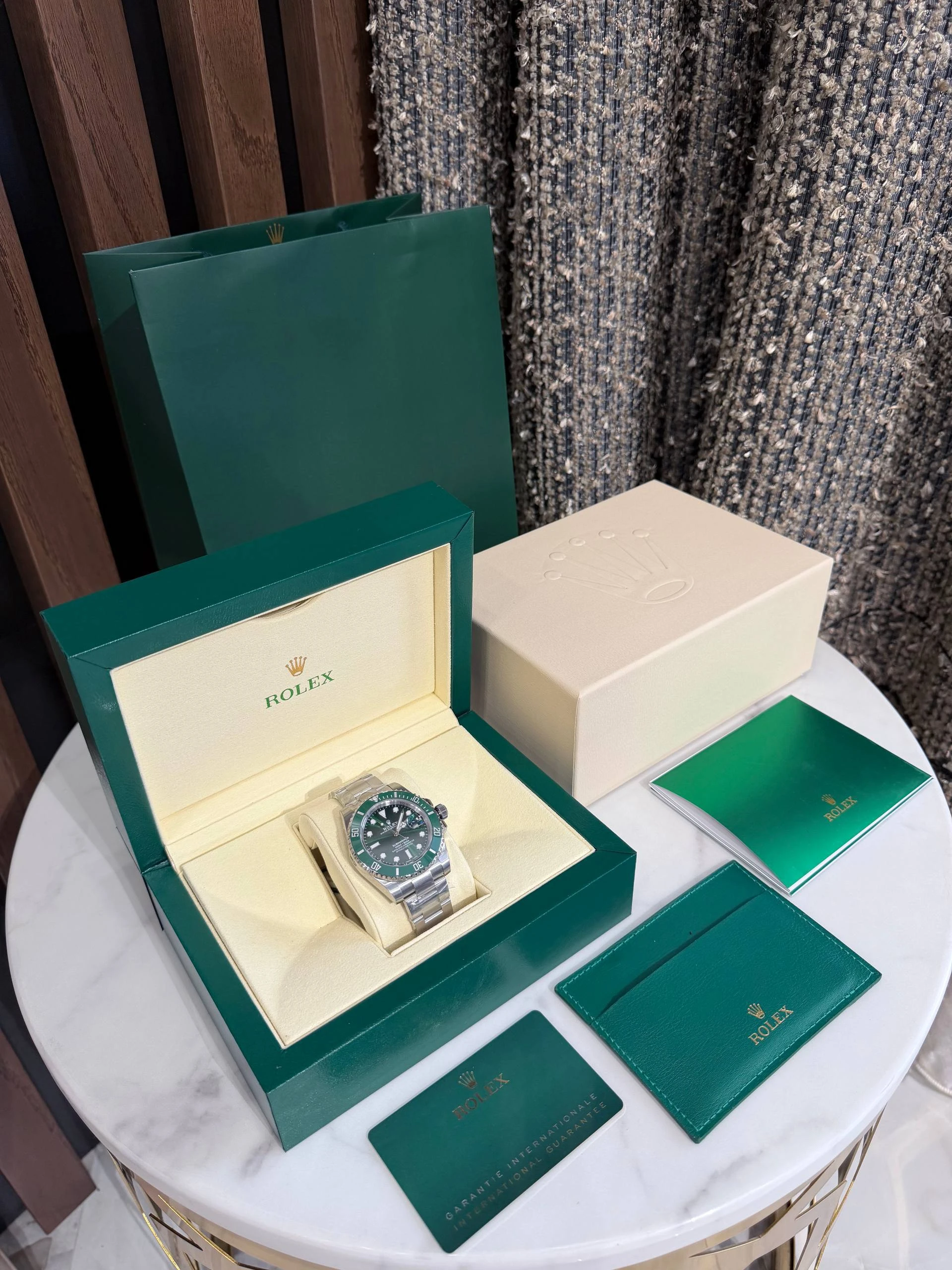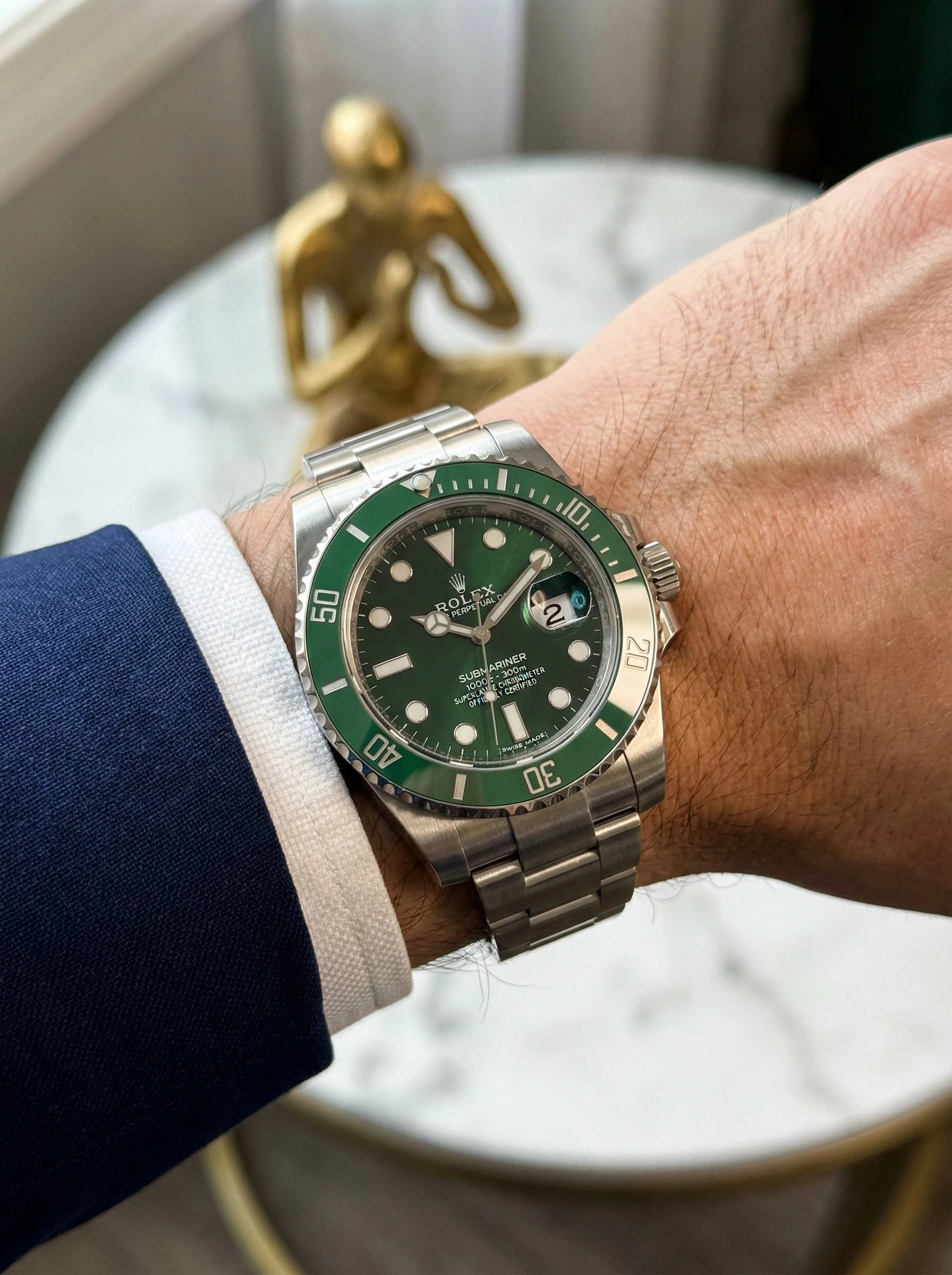 Модель Submariner 116610LV сочетает в себе легендарную надёжность профессионального дайверского хронометра и яркую, узнаваемую эстетику — глубокий зелёный циферблат и зелёный керамический безель создают эффектный контраст со стальным корпусом. Корпус диаметром 40 мм выполнен из высококоррозионно‑стойкой стали Oystersteel (904L) и сохранит блеск при активной эксплуатации. Безель Cerachrom устойчив к царапинам и выцветанию, а односторонний ход служит для безопасного контроля времени погружения.