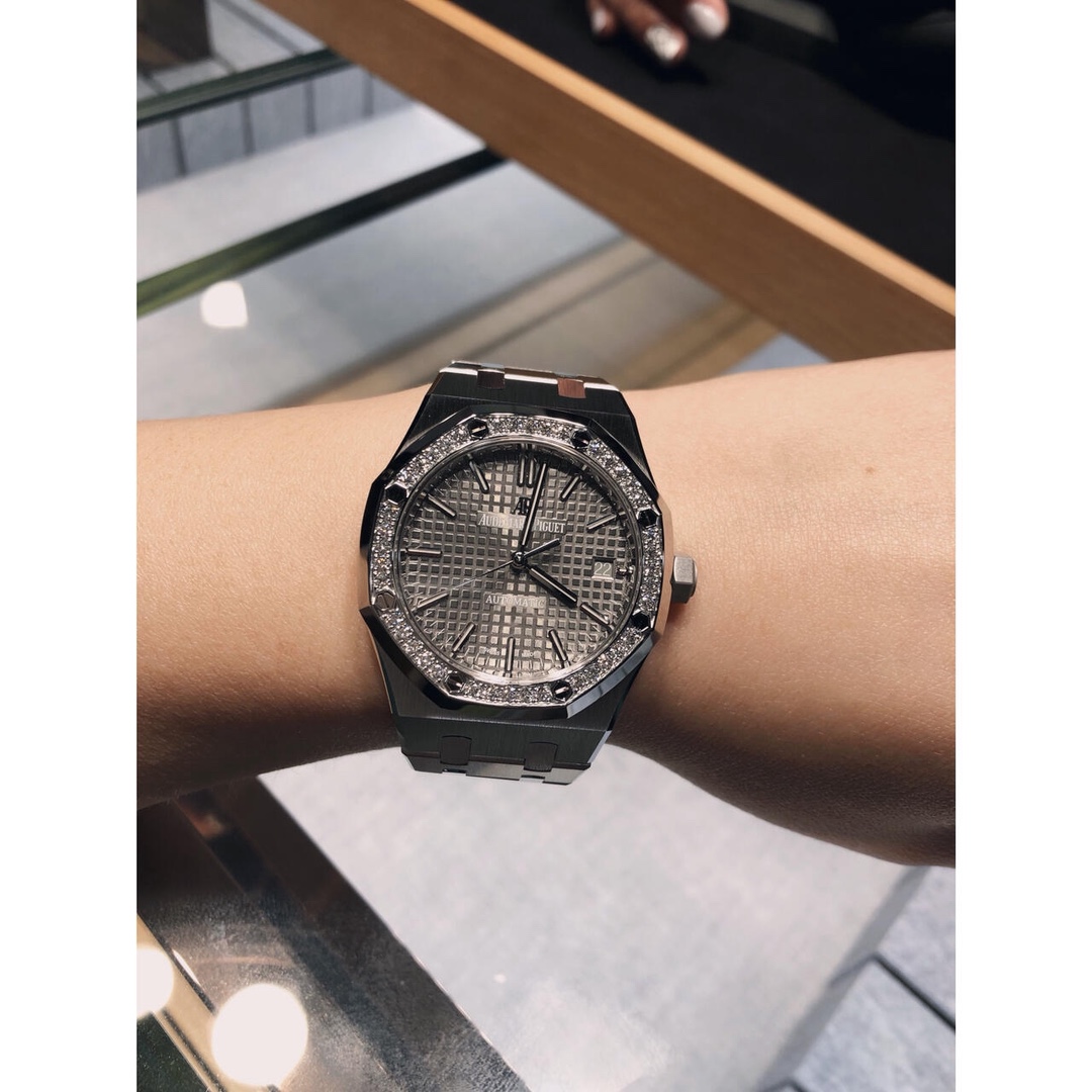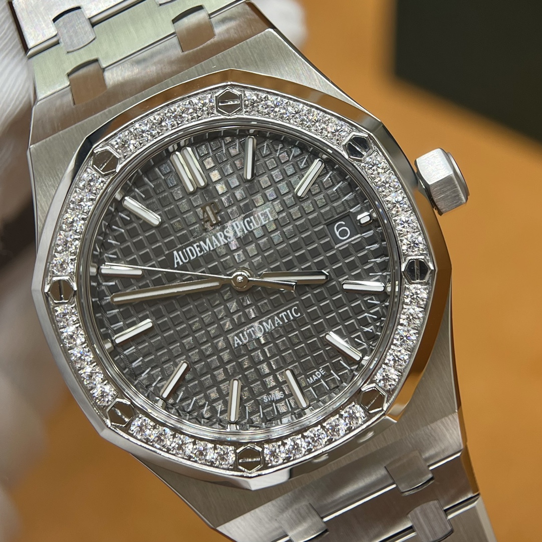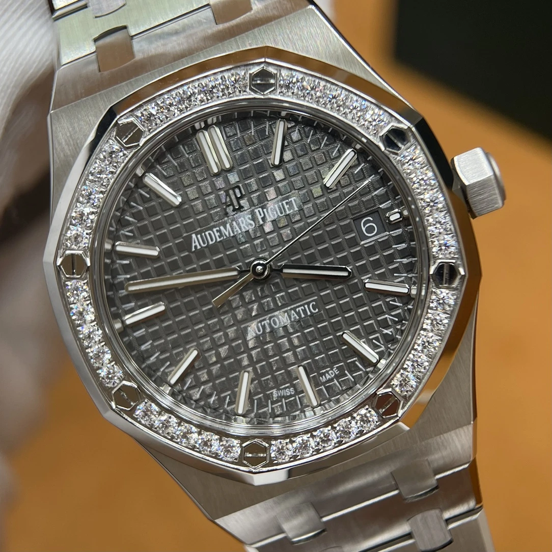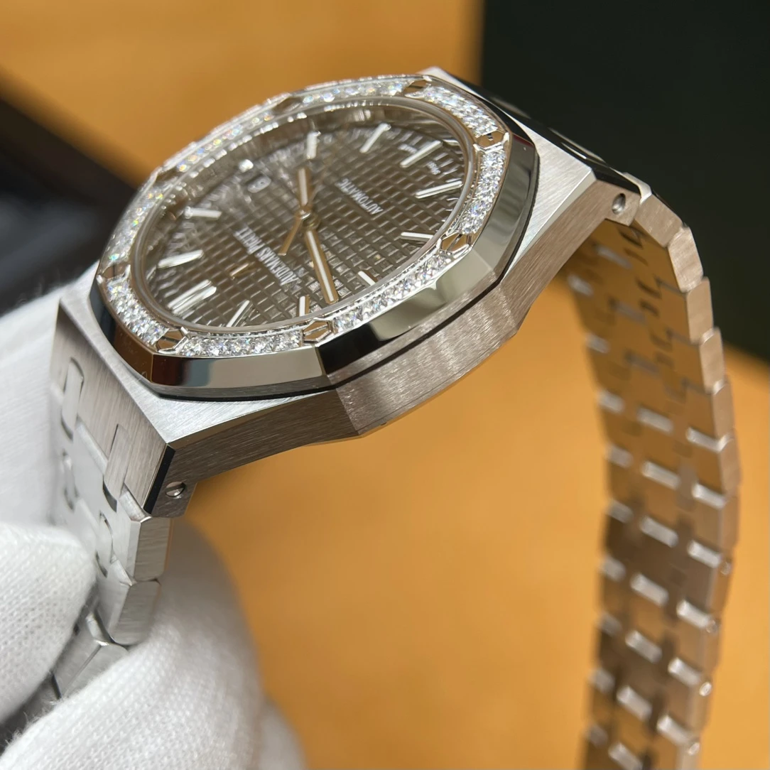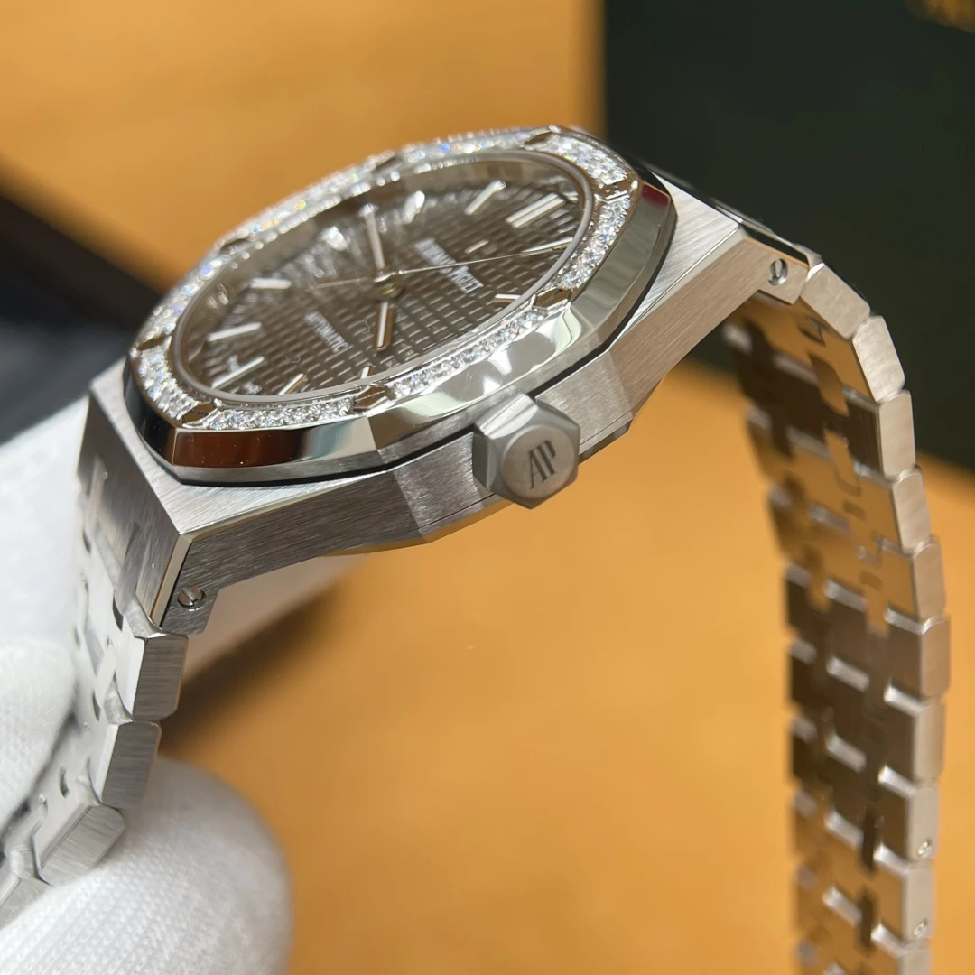 с 40 бриллиантами классической огранки на безеле. Циферблат серого рутениевого оттенка украшен узором «Grande Tapisserie», светящимися метками и стрелками, а также указателем даты в положении «3 часа». Часы дополнены браслетом из нержавеющей стали с раскладывающейся застёжкой AP.