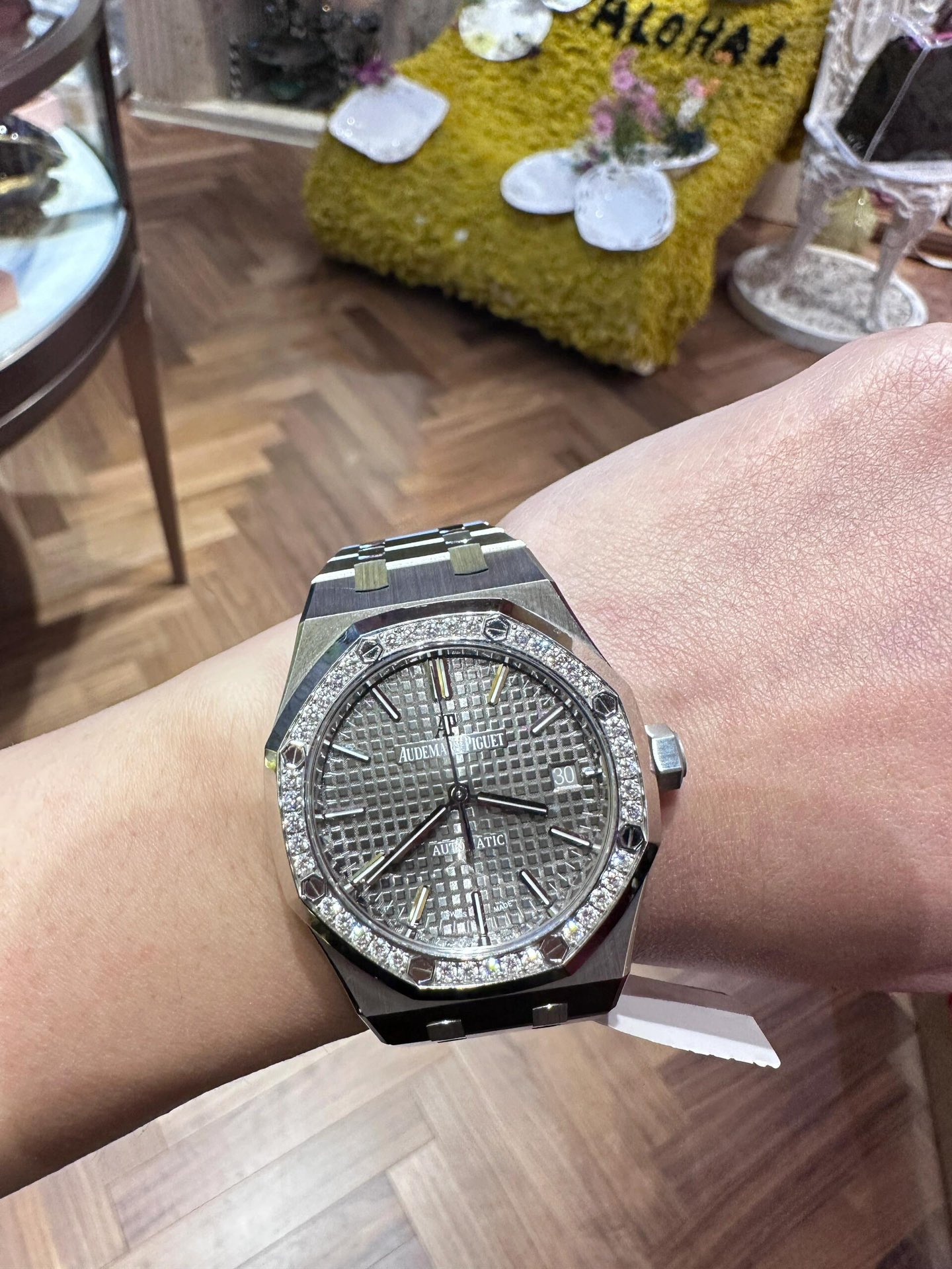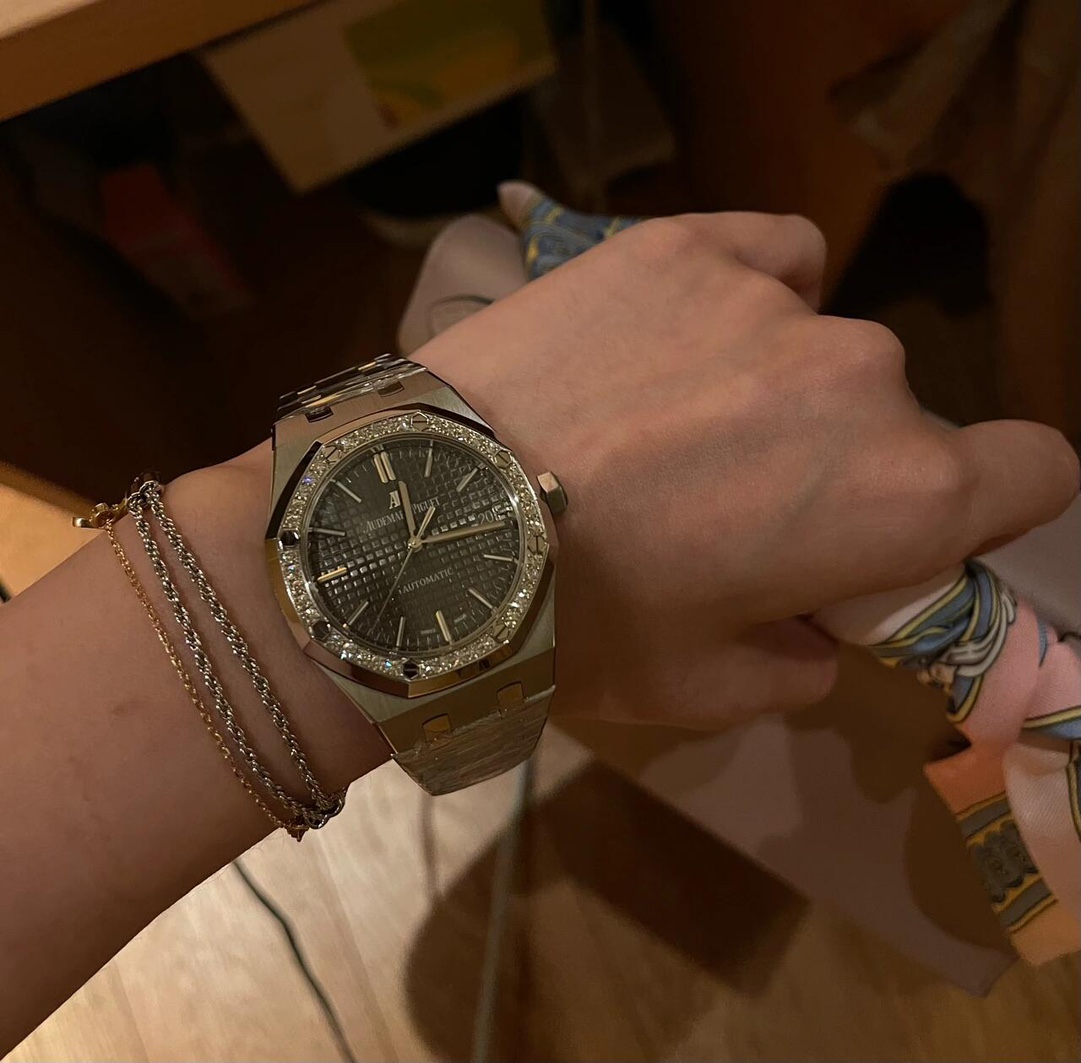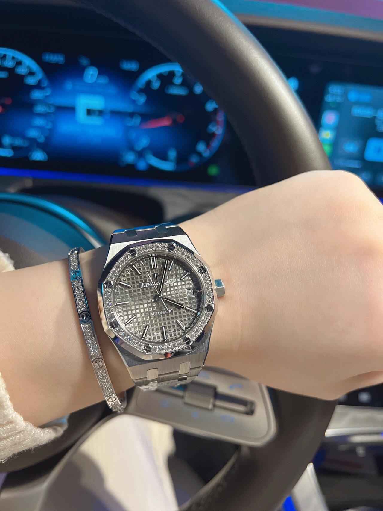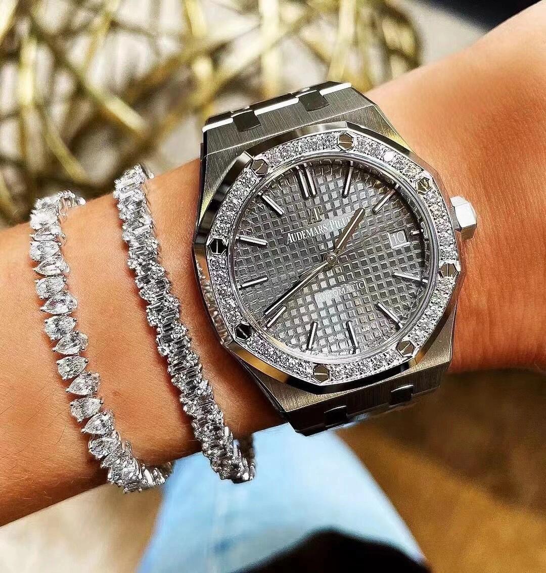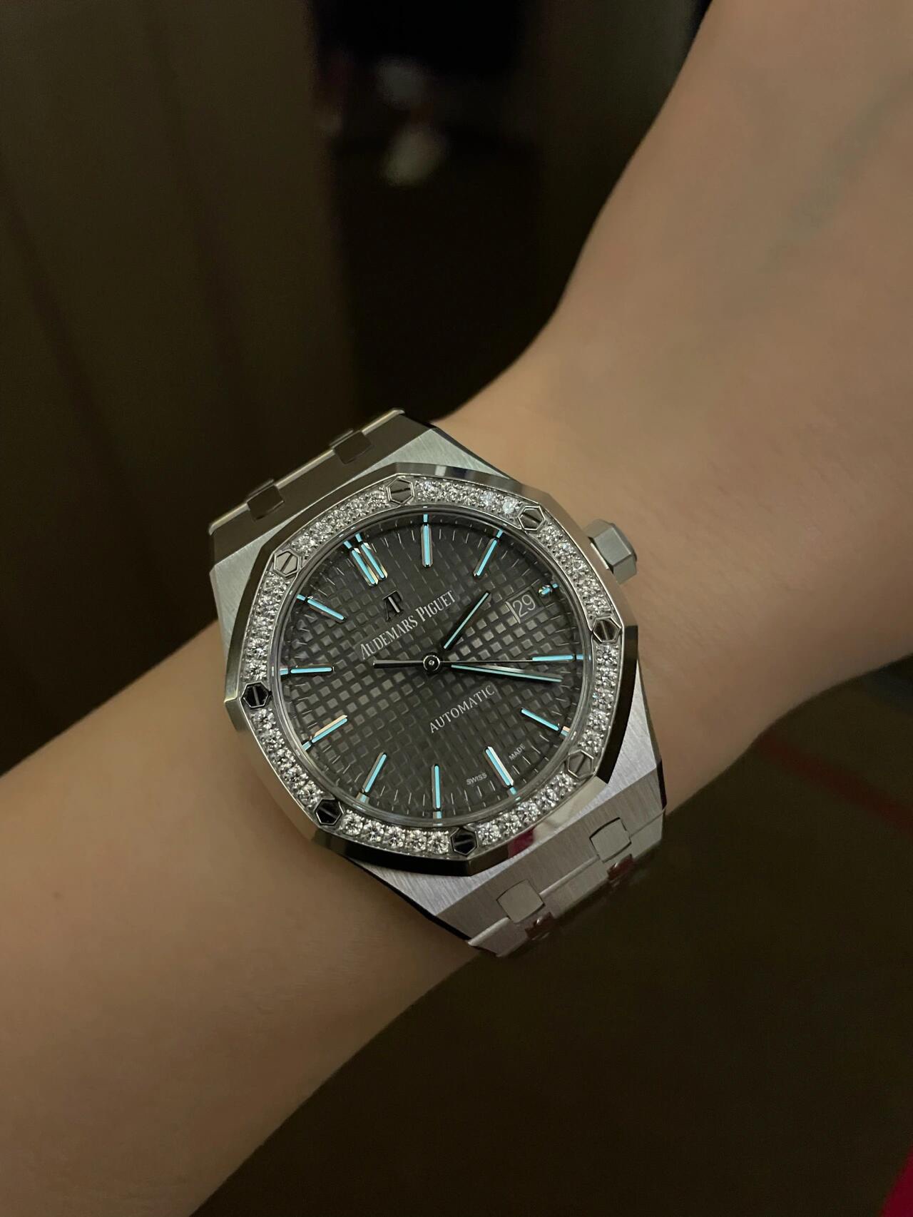 с 40 бриллиантами классической огранки на безеле. Циферблат серого рутениевого оттенка украшен узором «Grande Tapisserie», светящимися метками и стрелками, а также указателем даты в положении «3 часа». Часы дополнены браслетом из нержавеющей стали с раскладывающейся застёжкой AP.