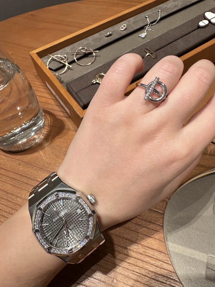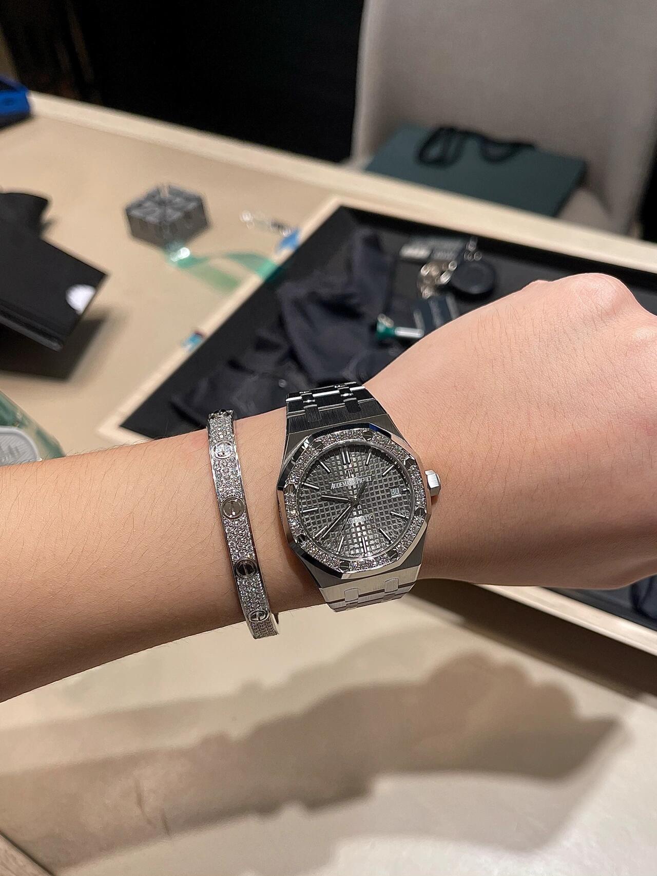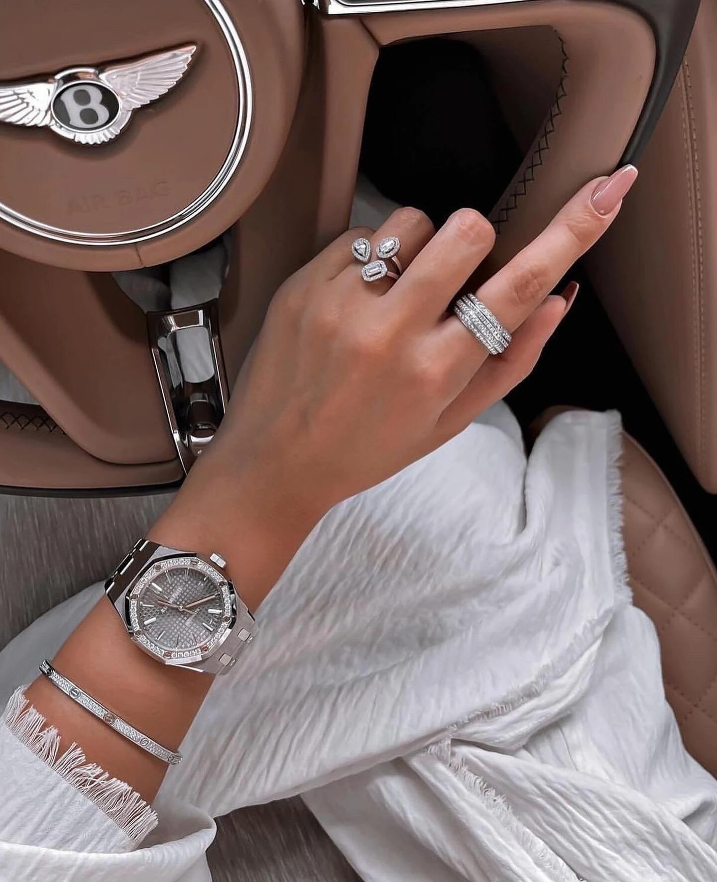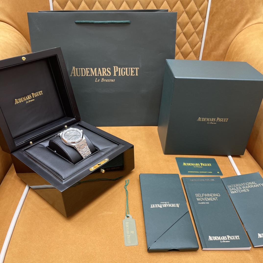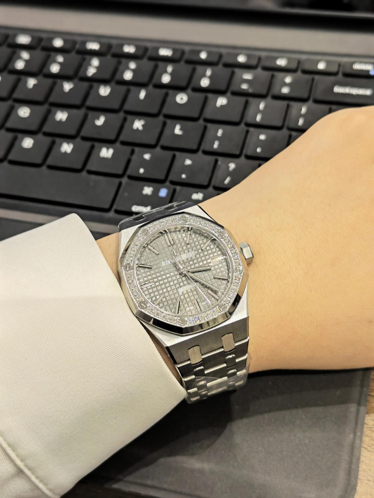 с 40 бриллиантами классической огранки на безеле. Циферблат серого рутениевого оттенка украшен узором «Grande Tapisserie», светящимися метками и стрелками, а также указателем даты в положении «3 часа». Часы дополнены браслетом из нержавеющей стали с раскладывающейся застёжкой AP.