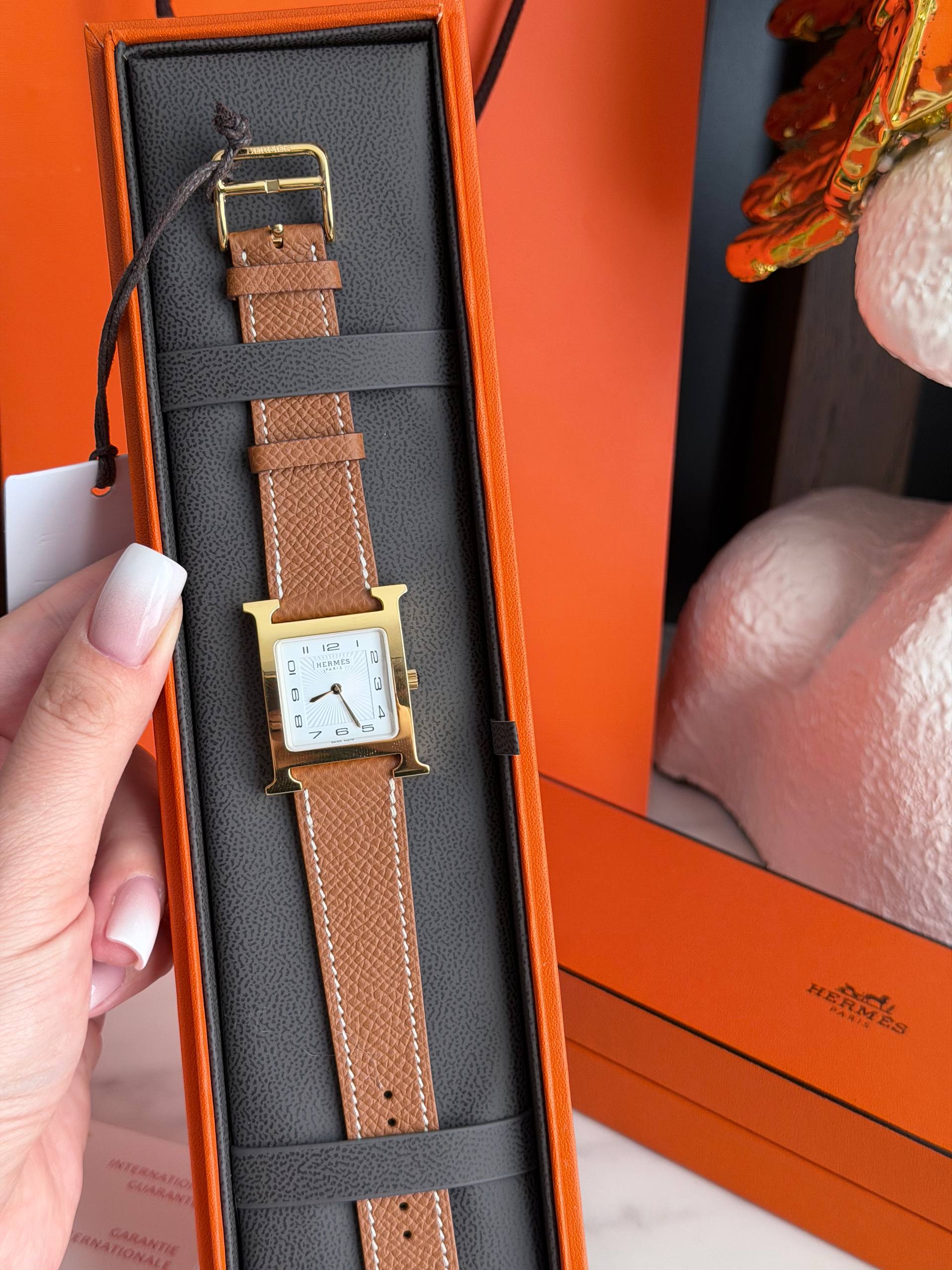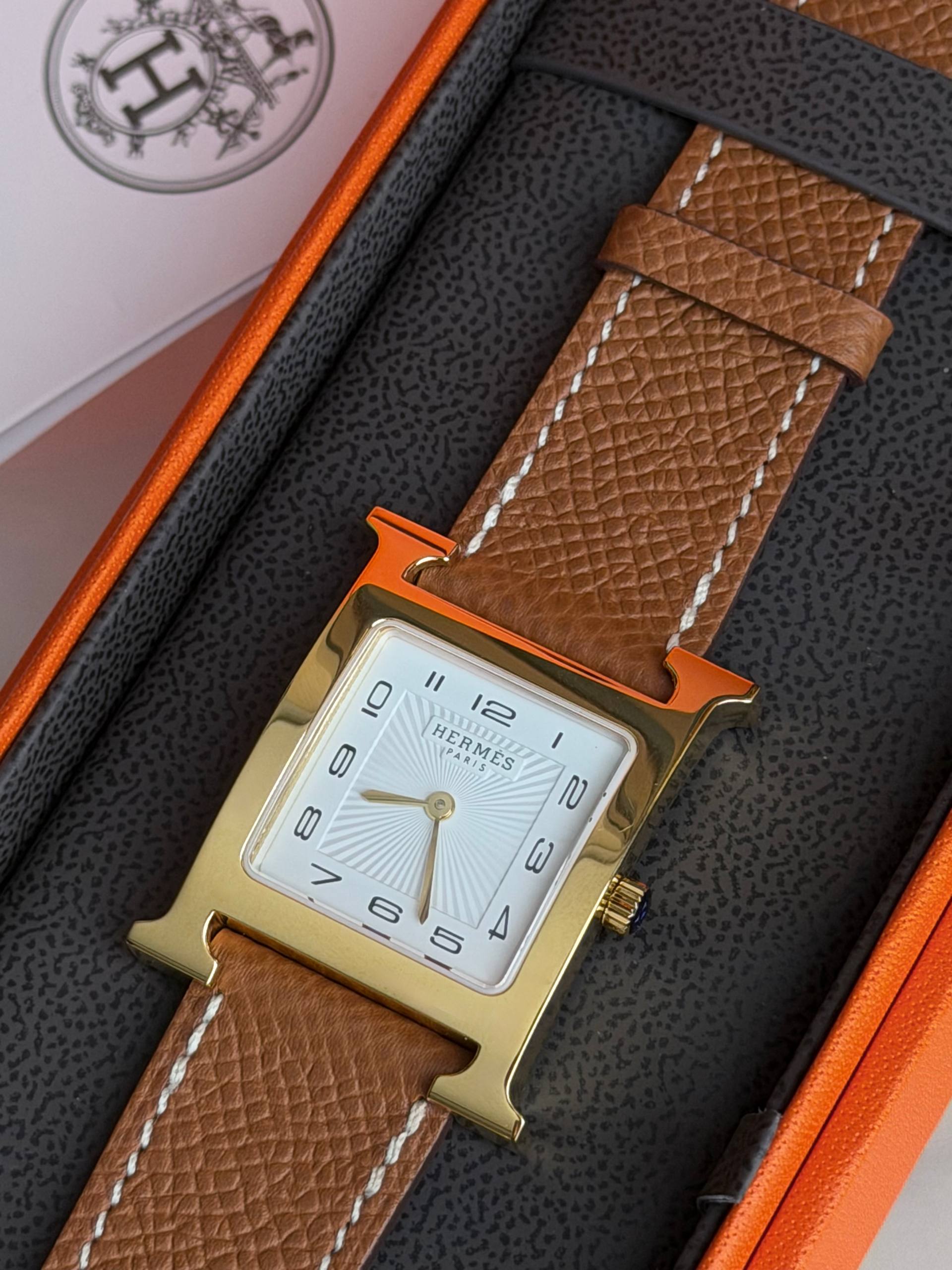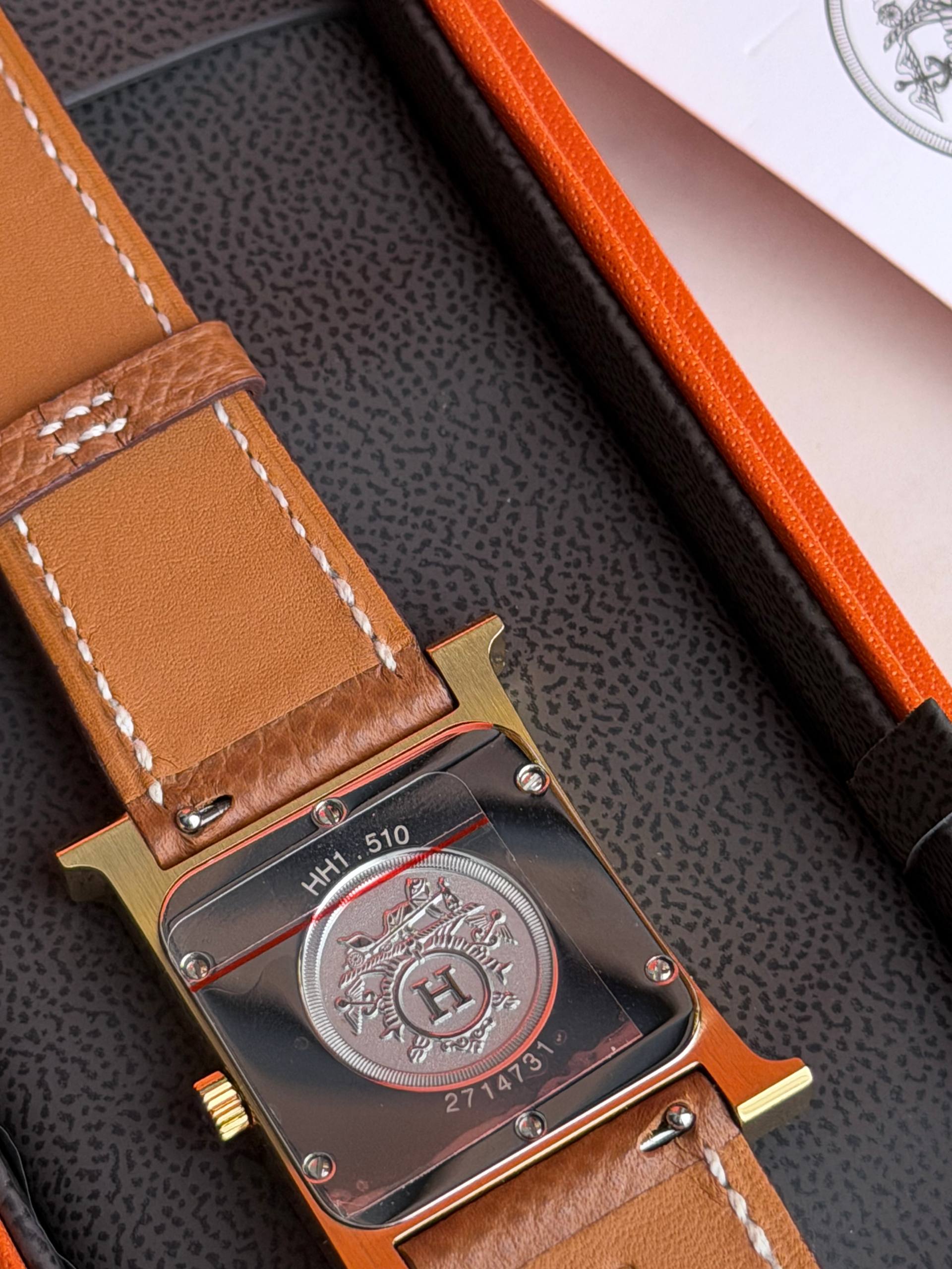 Изысканные часы Hermès HH1.510 сочетают чистые линии и утончённую практичность. Стальной корпус в квадратном исполнении с фирменными элементами бренда мягко подчёркивает женственность, а сапфировое стекло сохраняет безупречный вид при ежедневной носке. Надёжный кварцевый механизм обеспечивает точность, а натуральный кожаный ремешок — комфорт и универсальность: модель одинаково органично смотрится и в деловом образе, и на вечернем выходе.