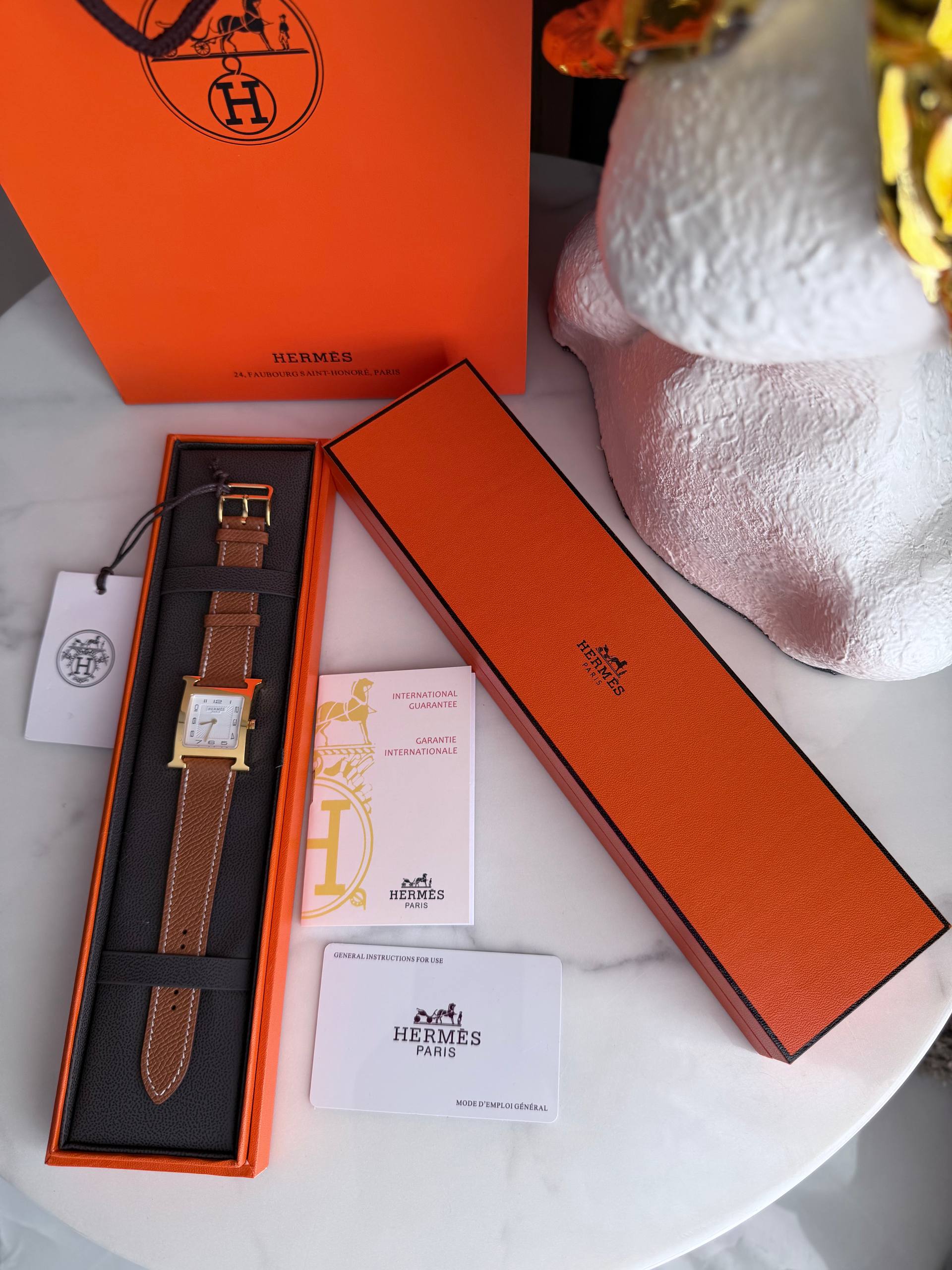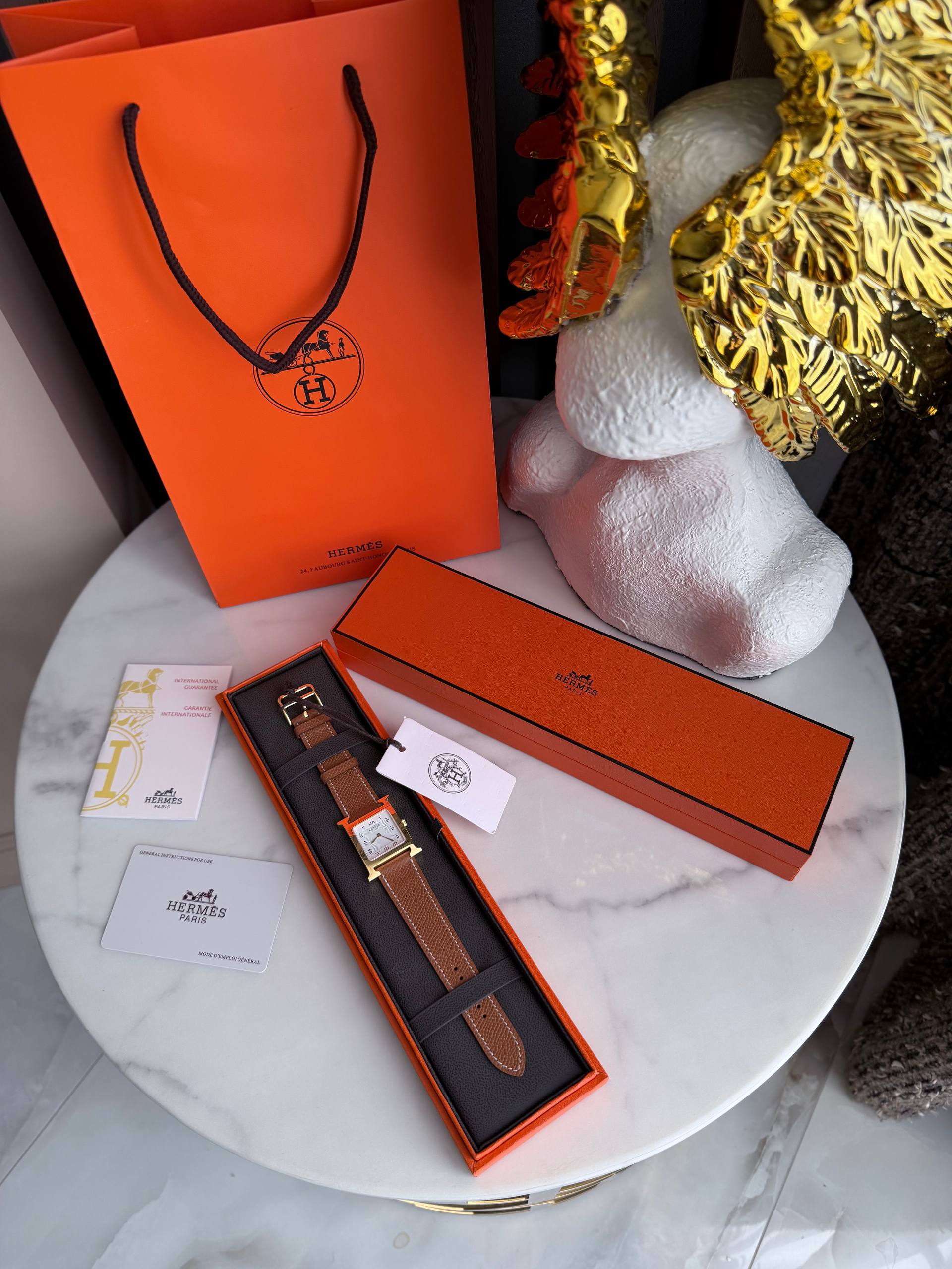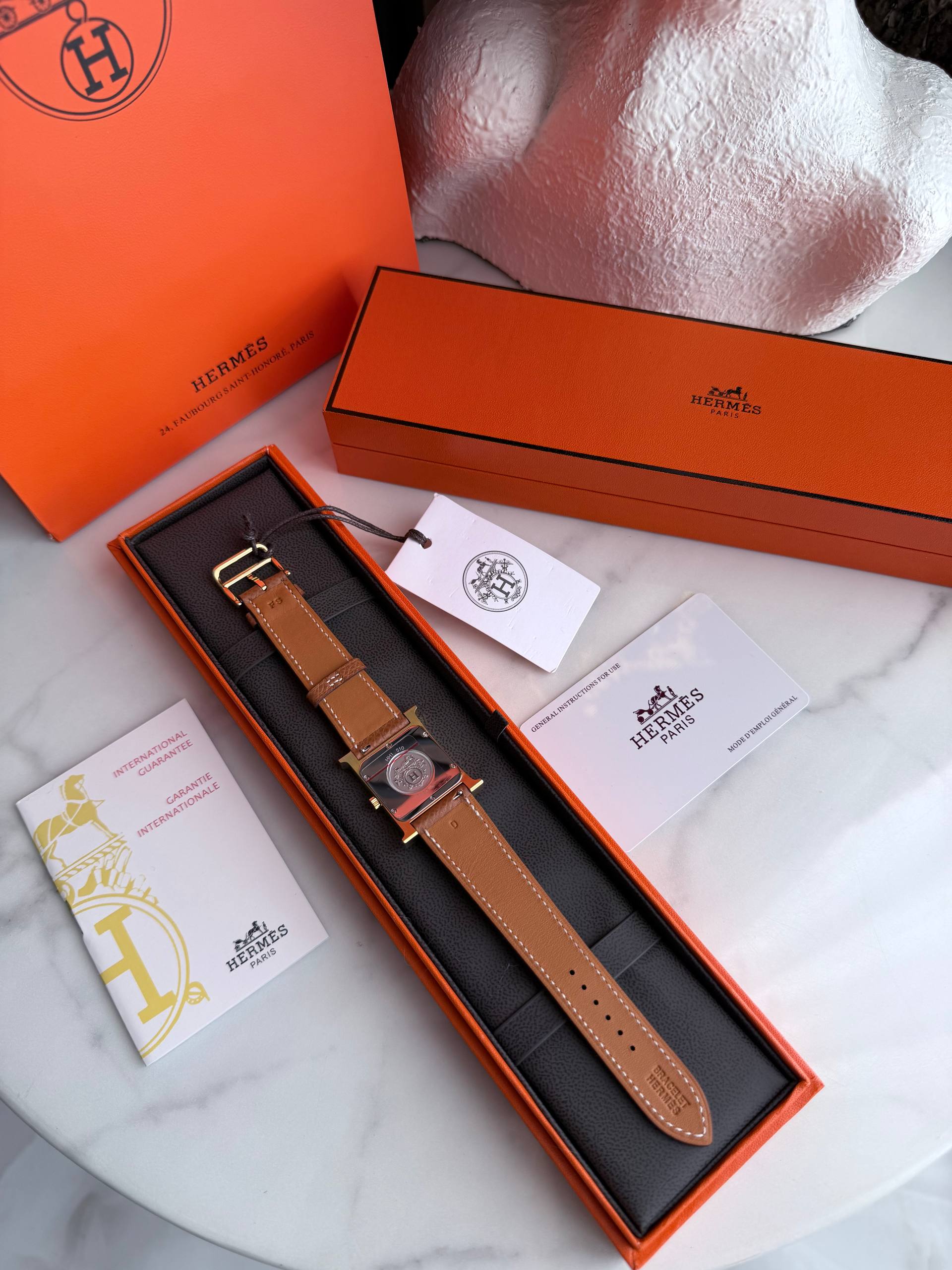 Изысканные часы Hermès HH1.510 сочетают чистые линии и утончённую практичность. Стальной корпус в квадратном исполнении с фирменными элементами бренда мягко подчёркивает женственность, а сапфировое стекло сохраняет безупречный вид при ежедневной носке. Надёжный кварцевый механизм обеспечивает точность, а натуральный кожаный ремешок — комфорт и универсальность: модель одинаково органично смотрится и в деловом образе, и на вечернем выходе.