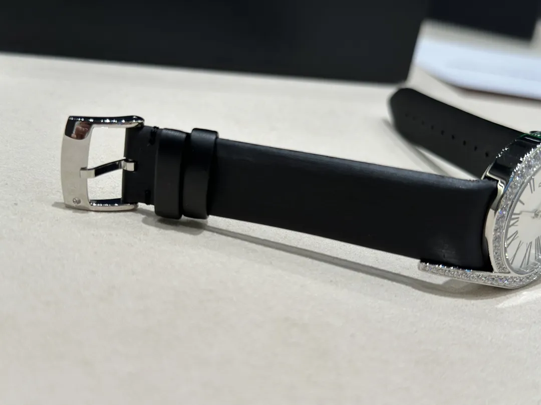 Кроме того, в оформлении часов использовано 60 бриллиантов классической огранки общей массой около 0,92 карата, что создает роскошный вид. Пряжка, инкрустированная одним кристаллом Swarovski, добавляет завершающий штрих к этому впечатляющему аксессуару, внося в него нотку сияния (около 0,01 карата).