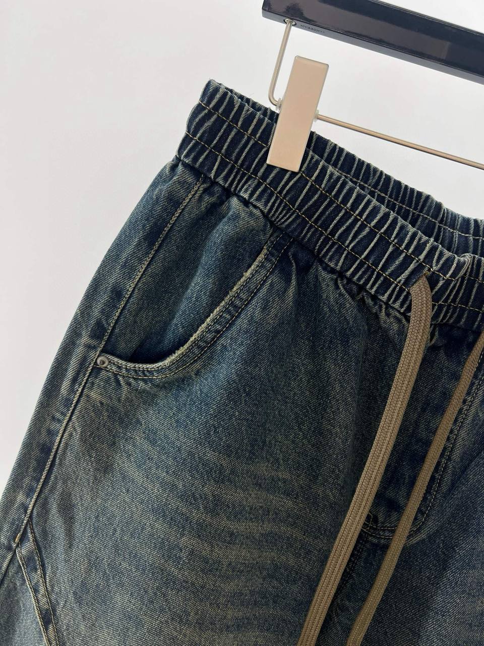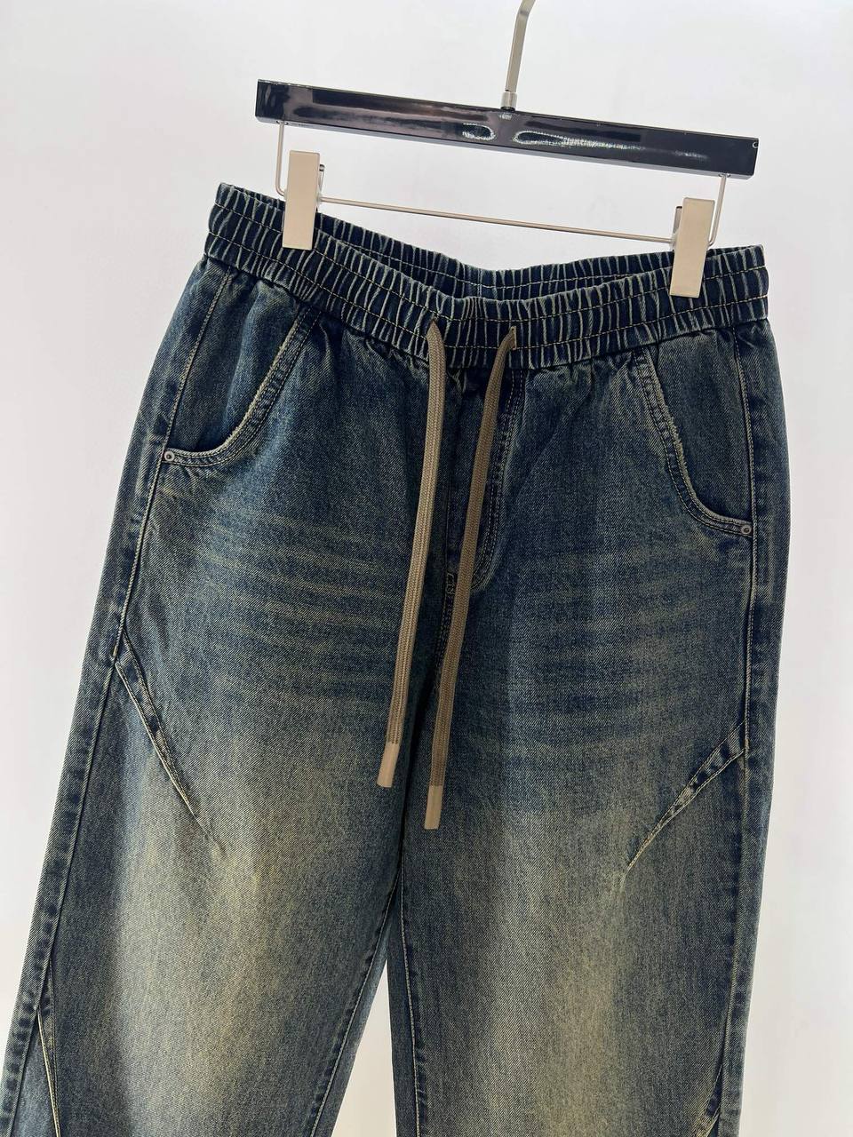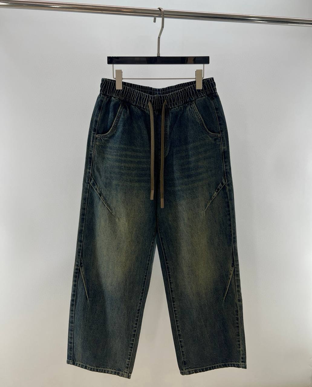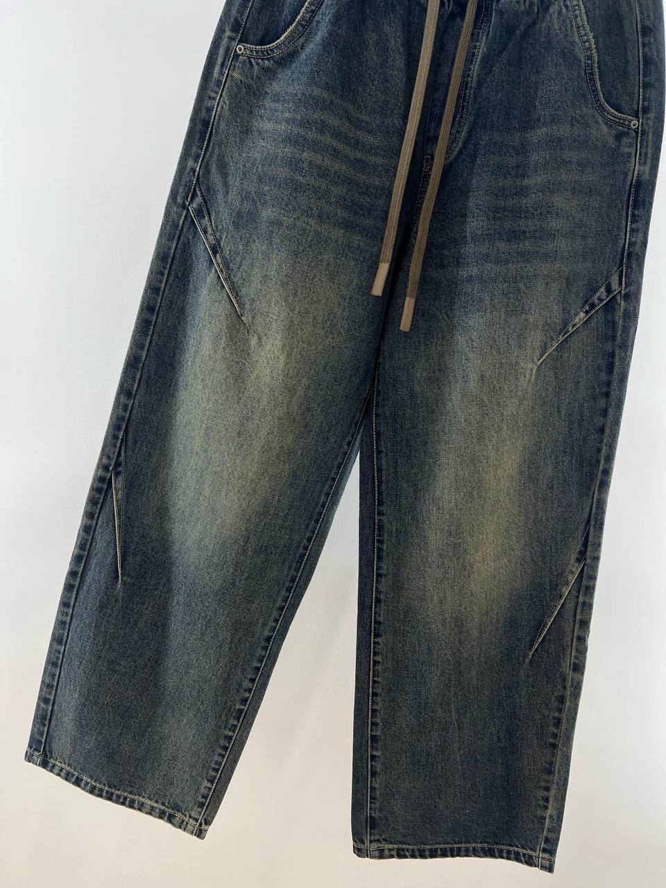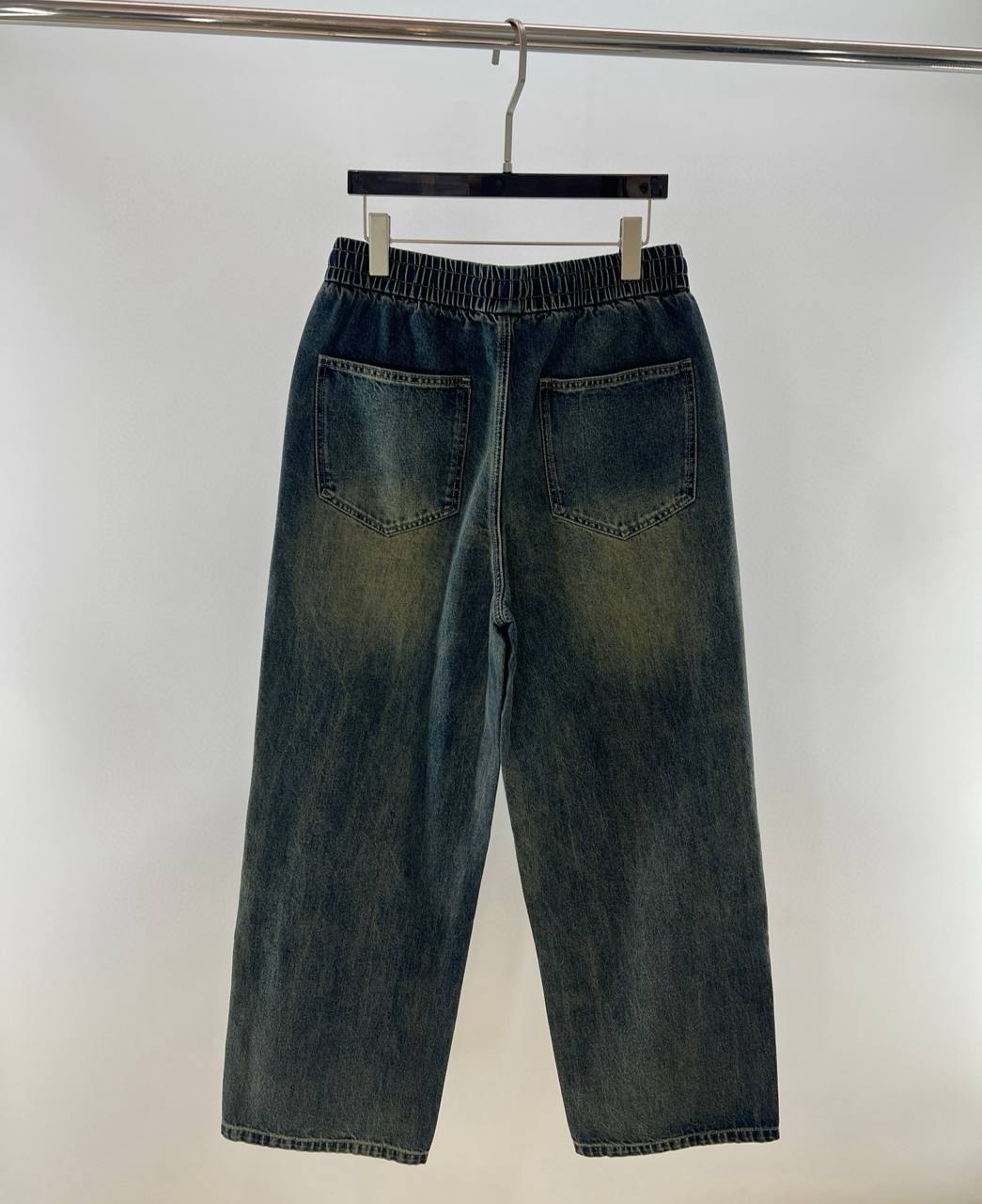 • Отделка: аккуратные швы тон в тон, едва заметная брашировка и локализованные выцветания на бёдрах и коленной зоне для винтажного эффекта; ровный подшитый низ.
